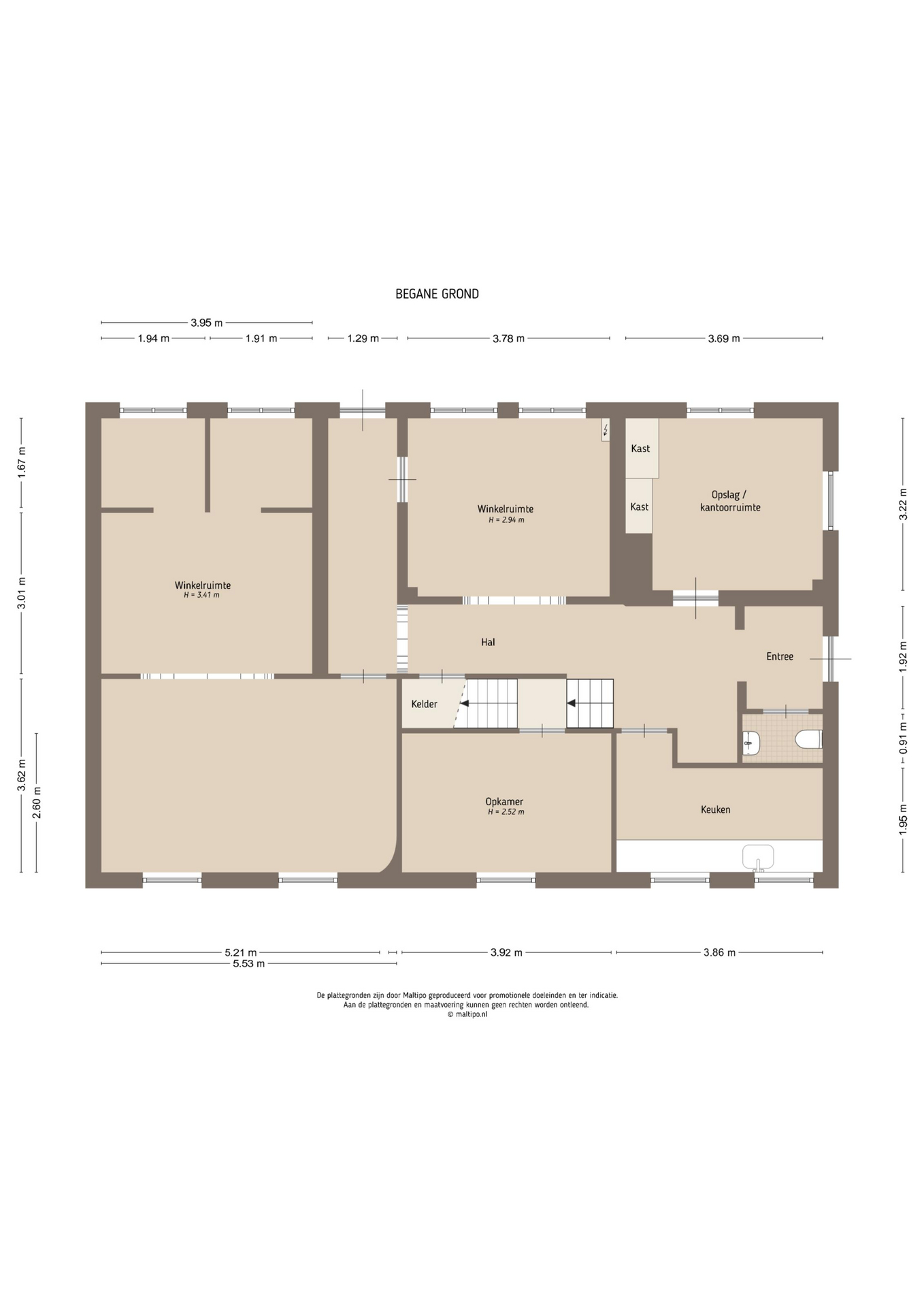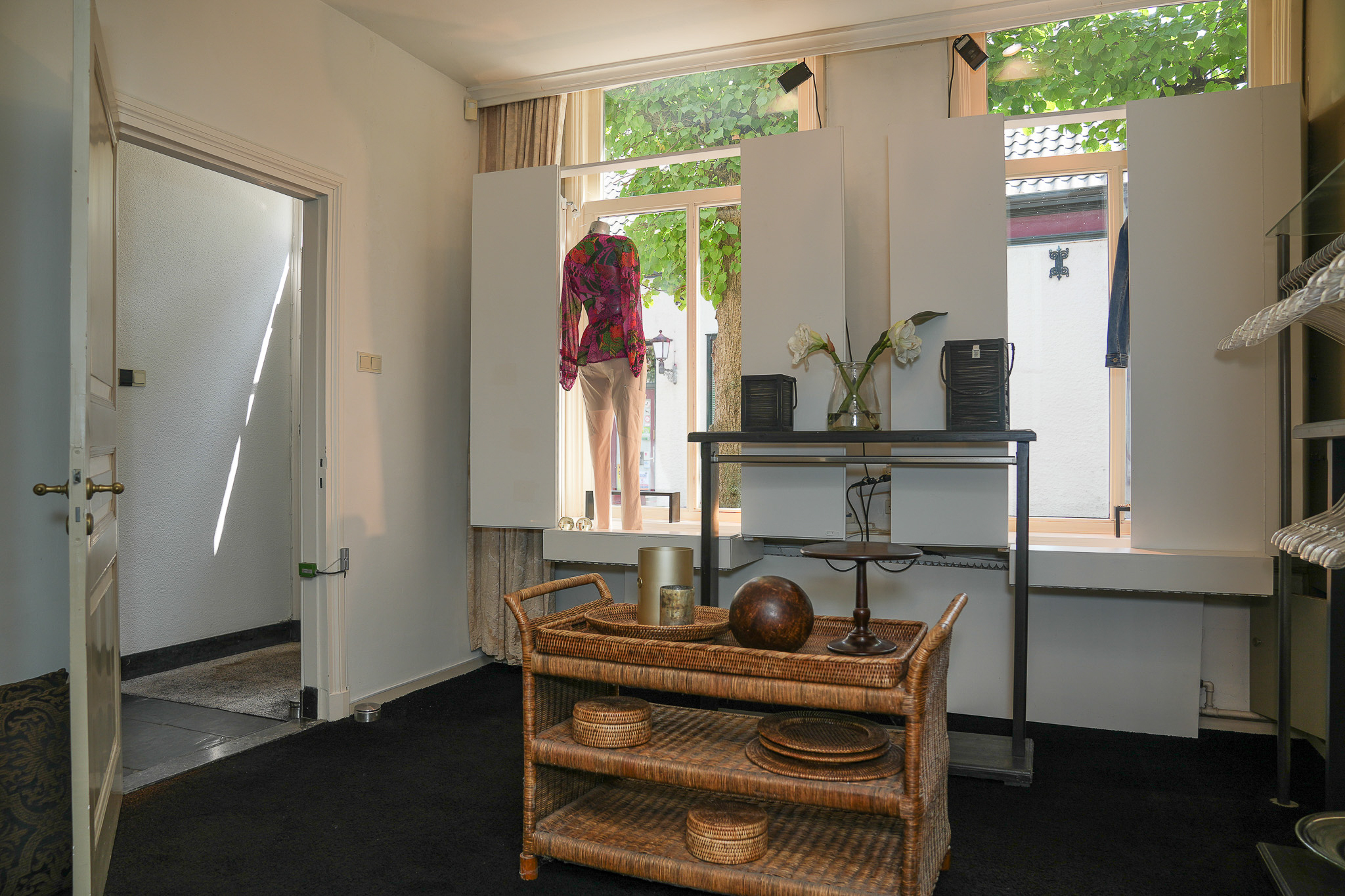 Begane grond: Via de karaktervolle entree aan de Dorpsstraat betreedt u de hal met originele leistenen vloer. Hier bevinden zich het toilet, de toegang naar de verschillende kantoor-/winkelruimtes en de keuken. Onder de opkamer bevindt zich een kelder (gewelfd), ideaal als opslag of wijnkelder. Aan de achterzijde is een tweede entree met uitzicht richting het gezellige Marktplein — handig voor klanttoegang. De keuken kijkt uit op dit plein, waardoor het contact met de omgeving behouden blijft.