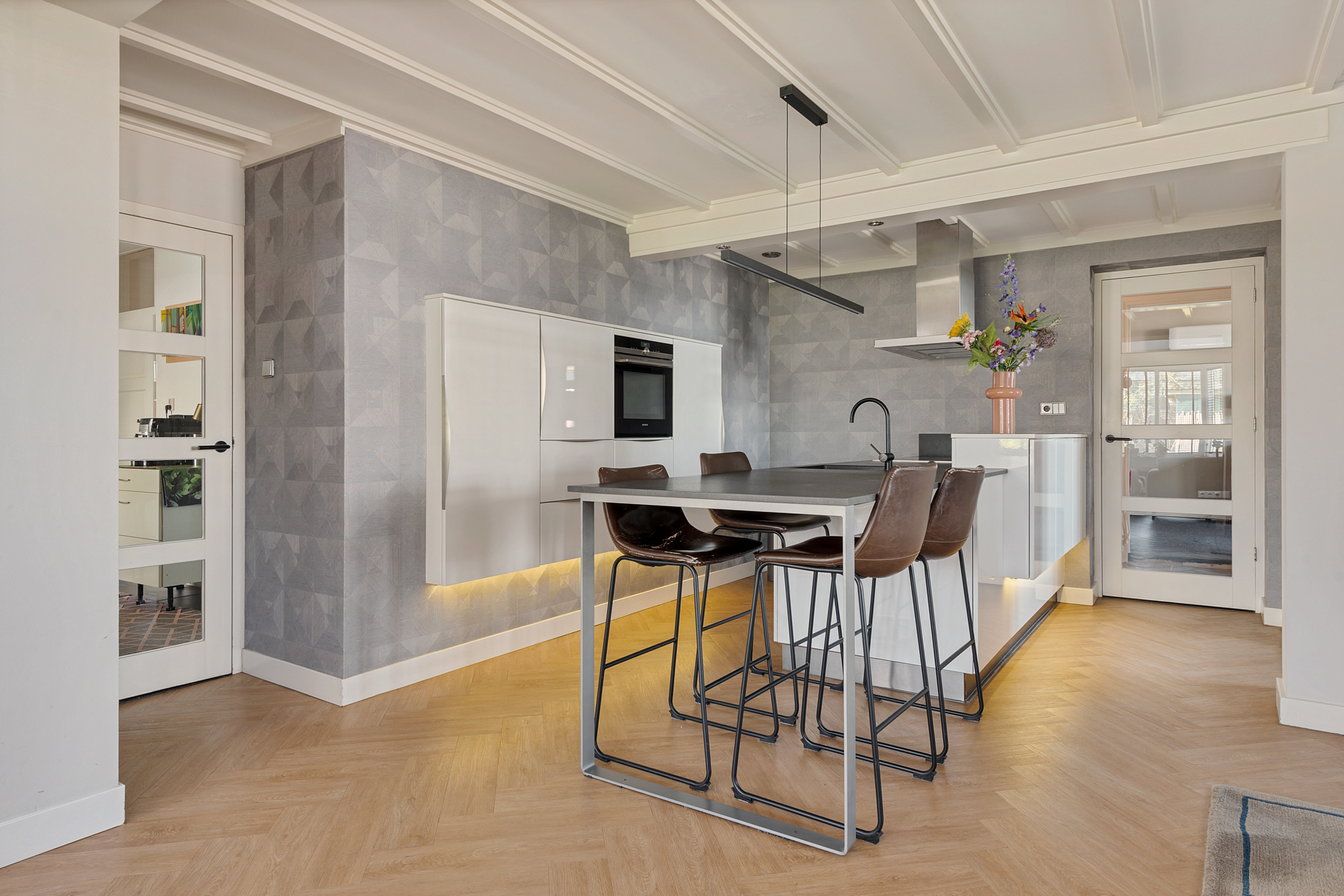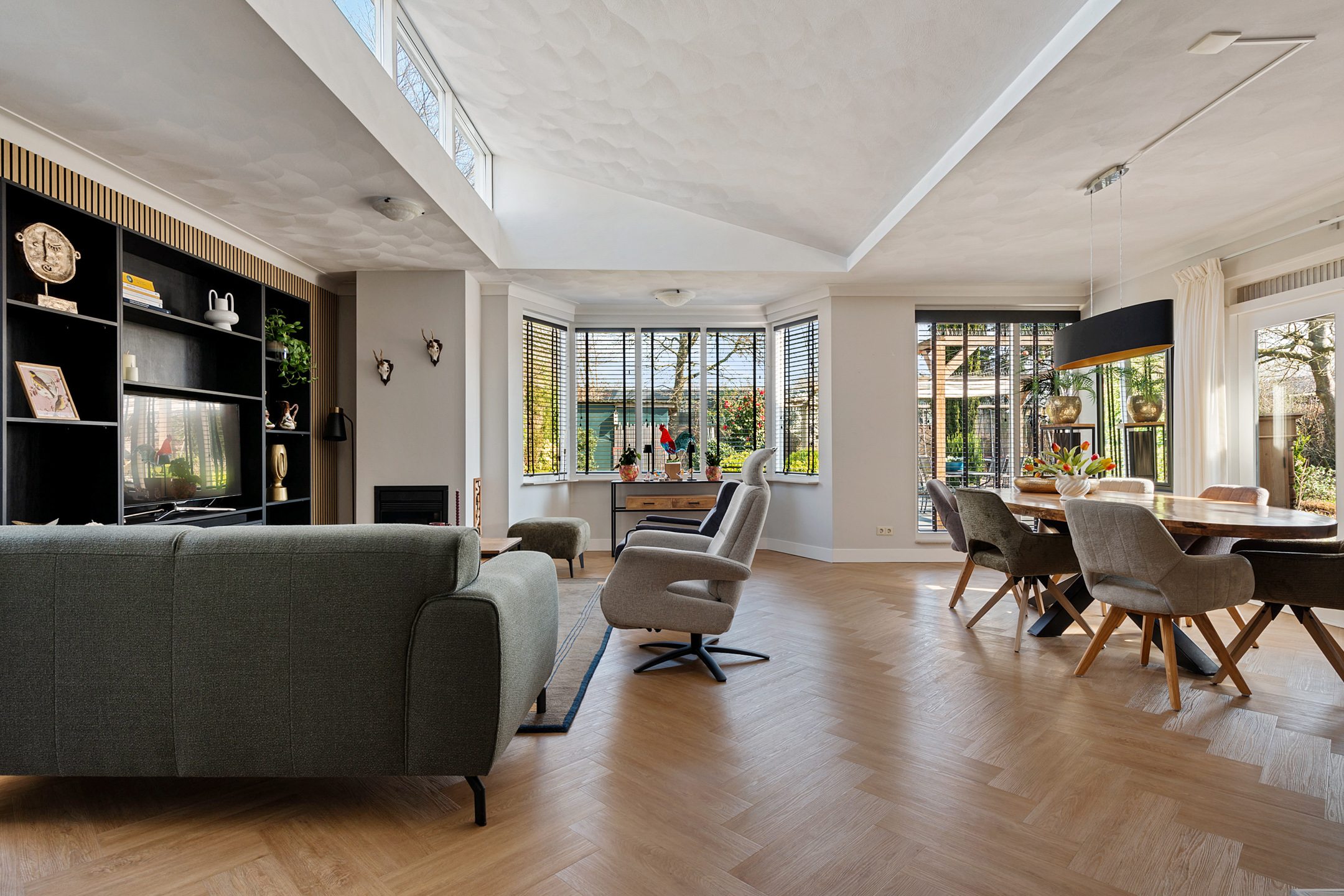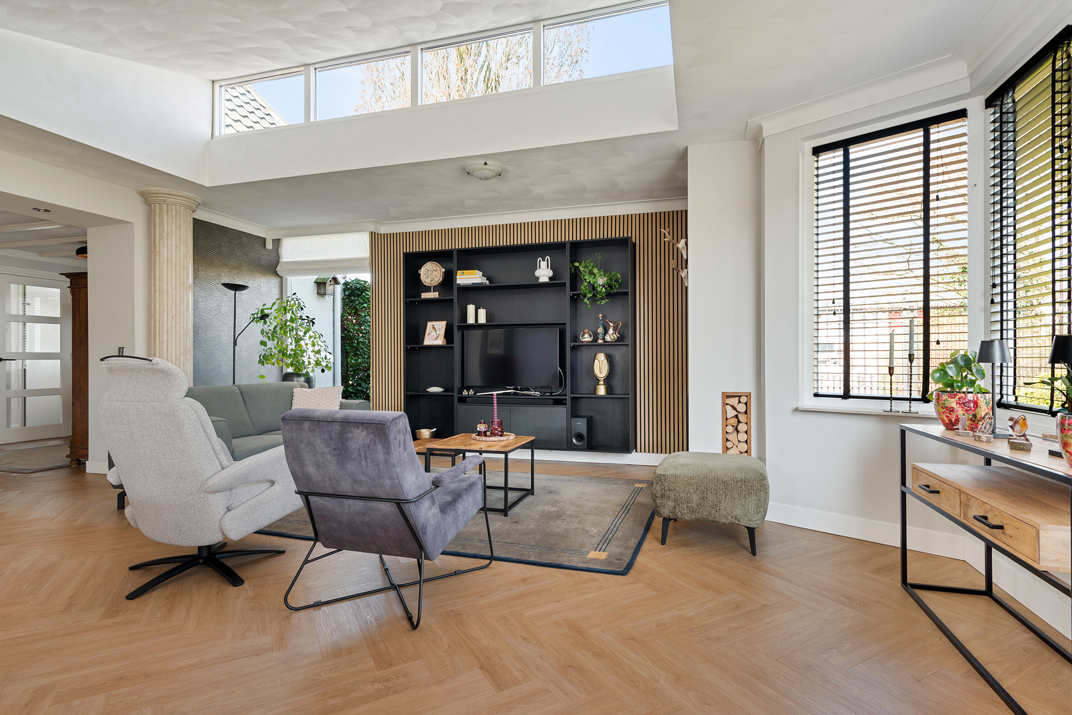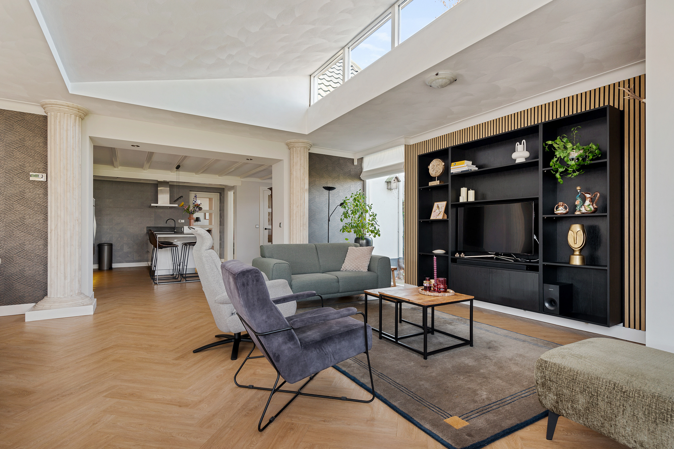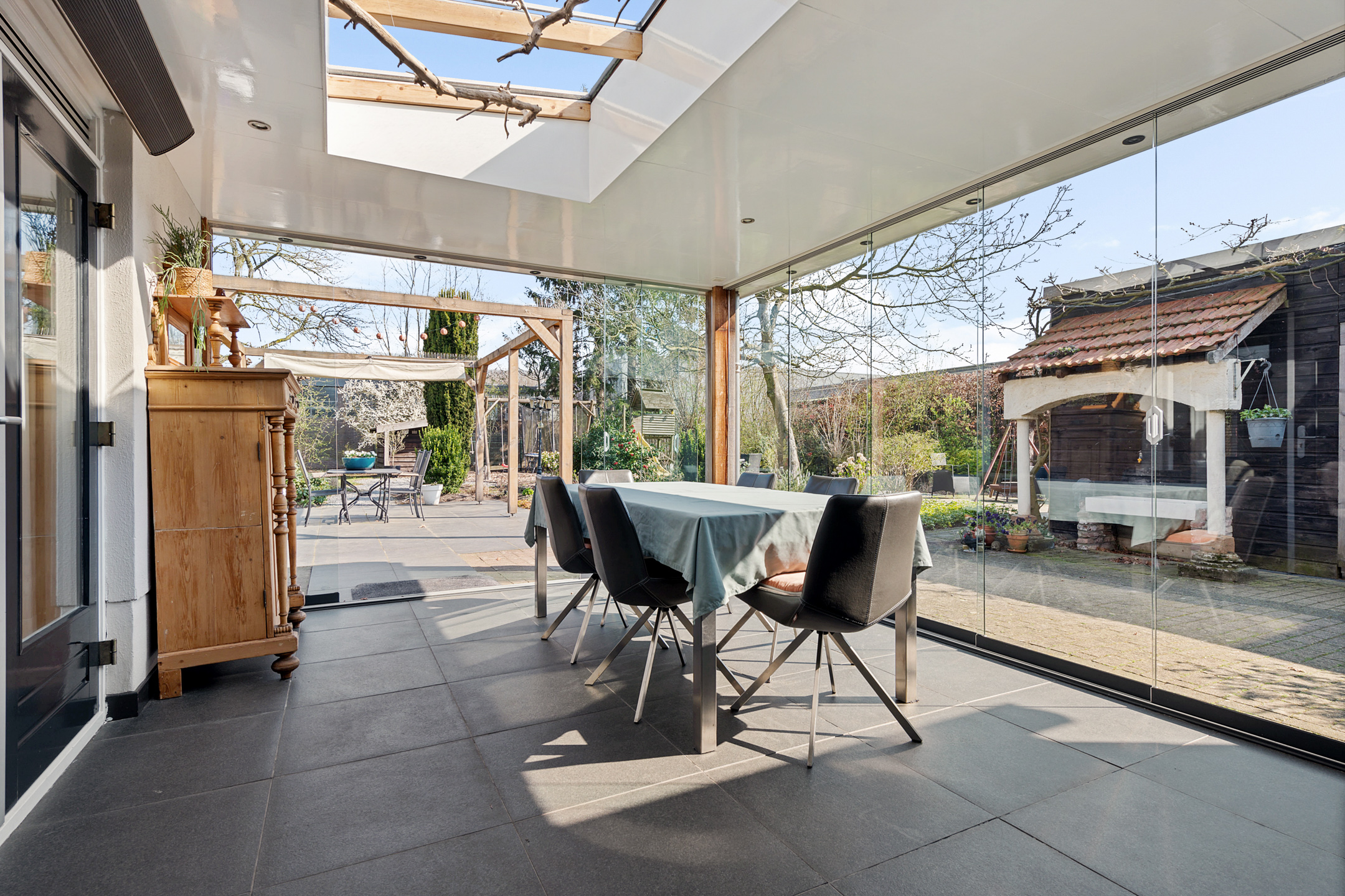 In de hal bevindt zich de meterkast (verdeler in de bedrijfsruimte) en de toegang tot de royale L-vormige woonkamer. De woonkamer is fraai afgewerkt met strak stucwerk op wanden en plafond en een PVC-vloer met comfortabele vloerverwarming. Een erker zorgt voor een prettig tuincontact en veel lichtinval. Daarnaast zorgt een pelletkachel voor extra sfeer en warmte. Aansluitend bereikt u de tuinkamer, die is voorzien van een lichtstraat, heater en een glazen wand. De open keuken bestaat uit een rechte kastenwand en een kookeiland met een bar. De keuken is voorzien van een inductiekookplaat, koelkast, combi-oven/magnetron en een vaatwasser. De hoofdslaapkamer is netjes afgewerkt met stucwerk wanden en plafond en vloerbedekking. Deze kamer beschikt over een inloopkast, kunststof kozijnen en airconditioning. Slaapkamer 2 is voorzien van een laminaatvloer en slaapkamer 3 beschikt over openslaande tuindeuren. Daarnaast zijn er een multifunctionele ruimte die kan dienen als speelkamer, kantoor aan huis of als doorgang naar de bedrijfsruimte. In een tussenportaal met toegang tot diverse vertrekken bevindt zich de toiletruimte. De badkamer is volledig betegeld en voorzien van een badkamermeubel met wastafel, een inbouwcloset, douche, designradiator en mechanische ventilatie. Vanuit zowel de woning als de bedrijfsruimte is de verdieping bereikbaar. Deze wordt momenteel gebruikt als een ruime bergzolder.