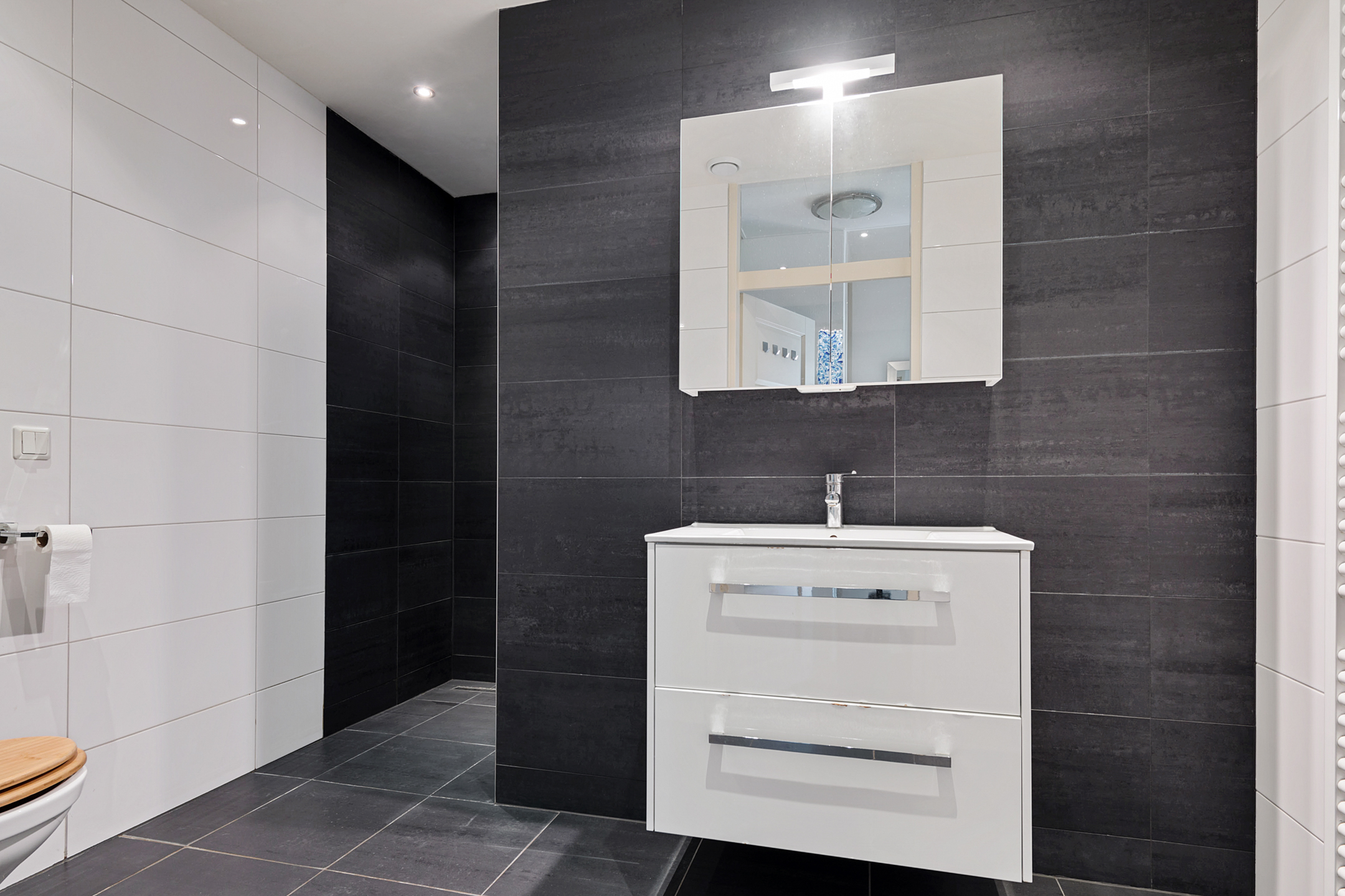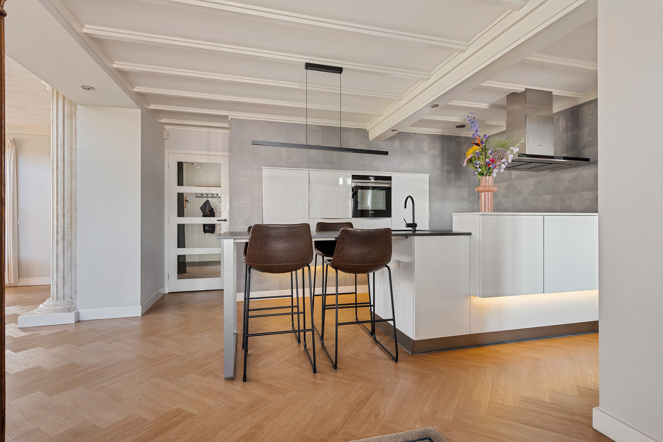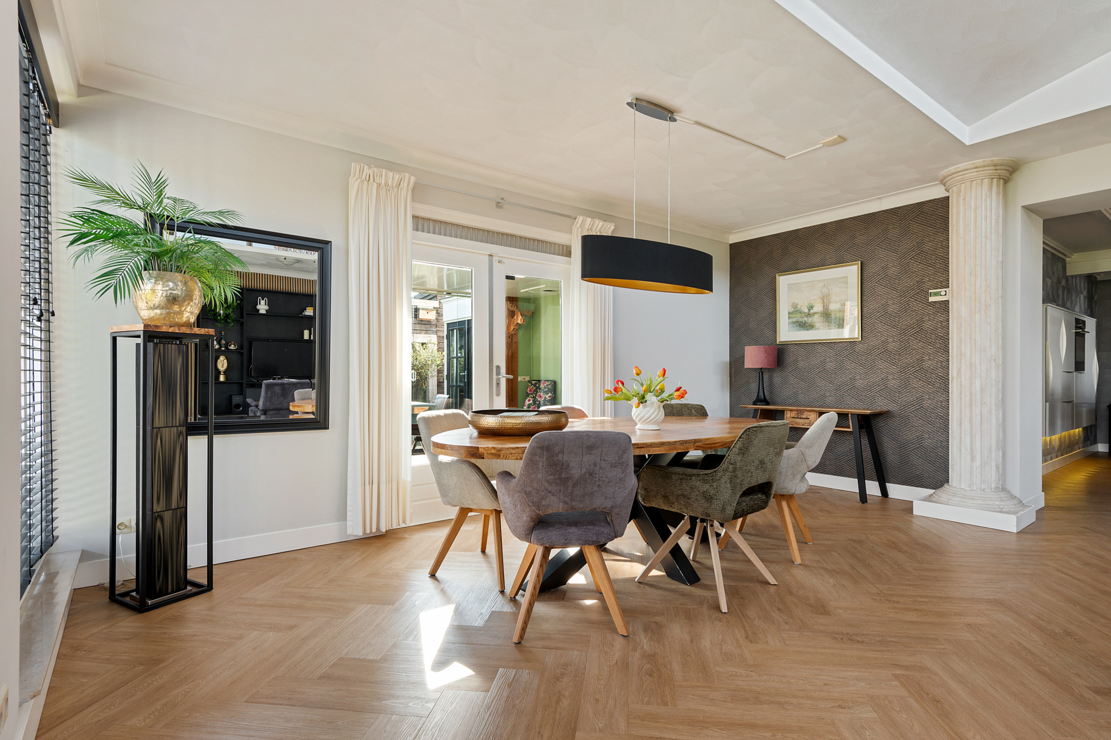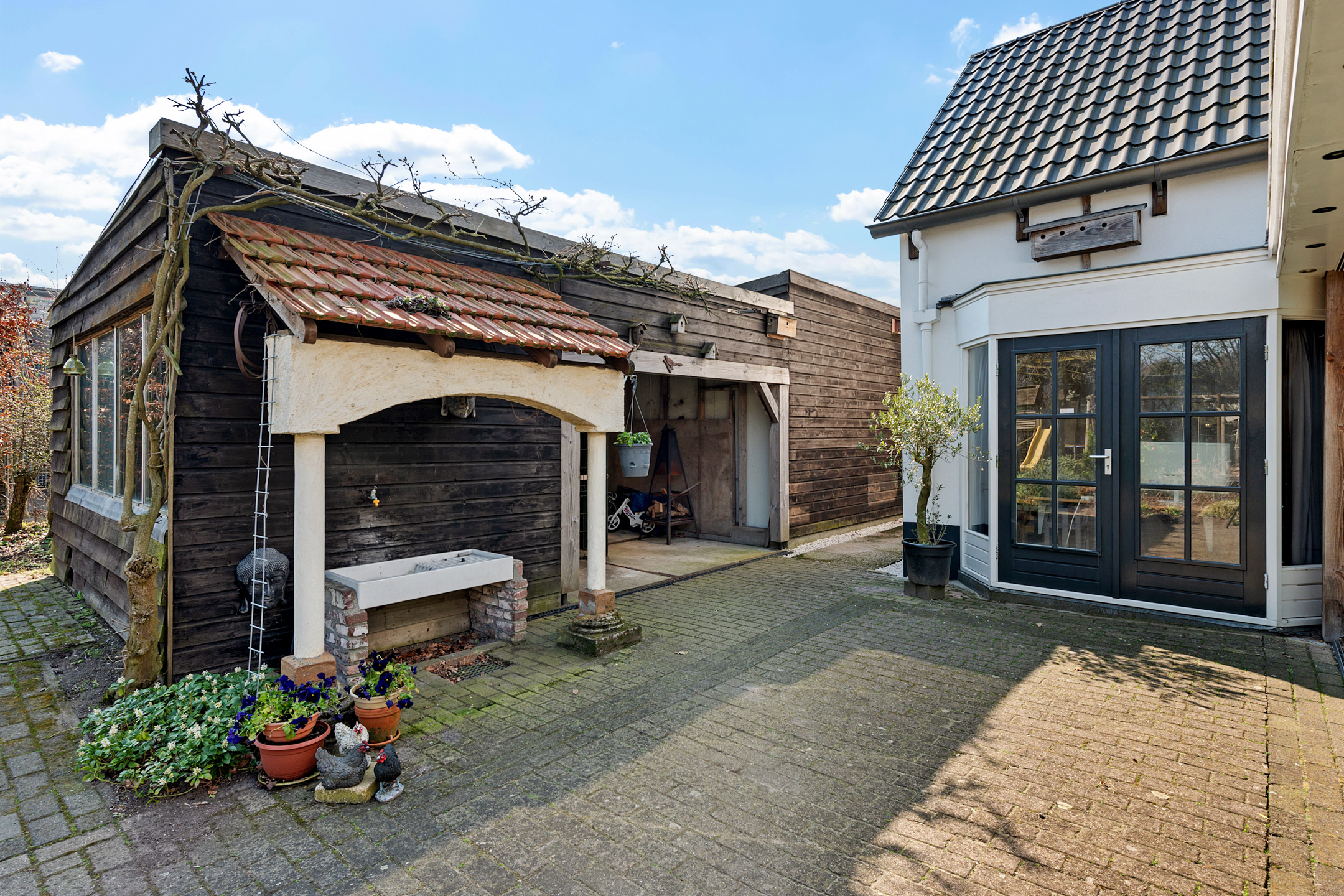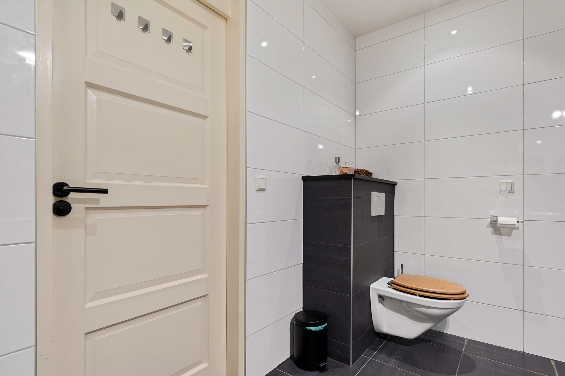 In de hal bevindt zich de meterkast (verdeler in de bedrijfsruimte) en de toegang tot de royale L-vormige woonkamer. De woonkamer is fraai afgewerkt met strak stucwerk op wanden en plafond en een PVC-vloer met comfortabele vloerverwarming. Een erker zorgt voor een prettig tuincontact en veel lichtinval. Daarnaast zorgt een pelletkachel voor extra sfeer en warmte. Aansluitend bereikt u de tuinkamer, die is voorzien van een lichtstraat, heater en een glazen wand. De open keuken bestaat uit een rechte kastenwand en een kookeiland met een bar. De keuken is voorzien van een inductiekookplaat, koelkast, combi-oven/magnetron en een vaatwasser. De hoofdslaapkamer is netjes afgewerkt met stucwerk wanden en plafond en vloerbedekking. Deze kamer beschikt over een inloopkast, kunststof kozijnen en airconditioning. Slaapkamer 2 is voorzien van een laminaatvloer en slaapkamer 3 beschikt over openslaande tuindeuren. Daarnaast zijn er een multifunctionele ruimte die kan dienen als speelkamer, kantoor aan huis of als doorgang naar de bedrijfsruimte. In een tussenportaal met toegang tot diverse vertrekken bevindt zich de toiletruimte. De badkamer is volledig betegeld en voorzien van een badkamermeubel met wastafel, een inbouwcloset, douche, designradiator en mechanische ventilatie. Vanuit zowel de woning als de bedrijfsruimte is de verdieping bereikbaar. Deze wordt momenteel gebruikt als een ruime bergzolder.