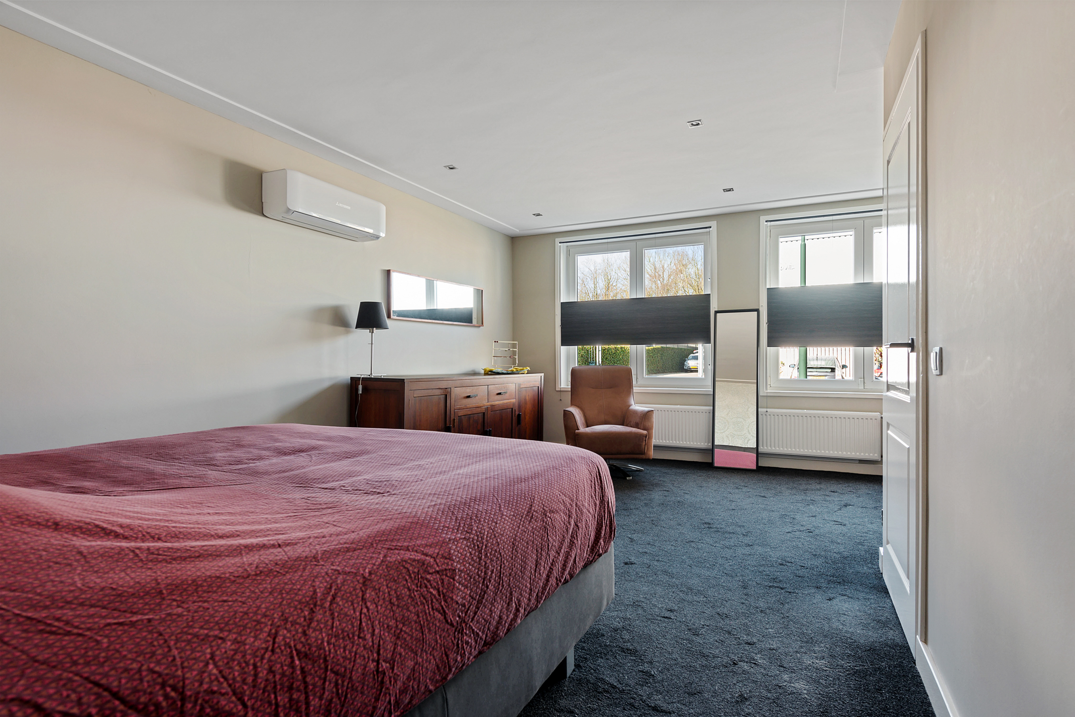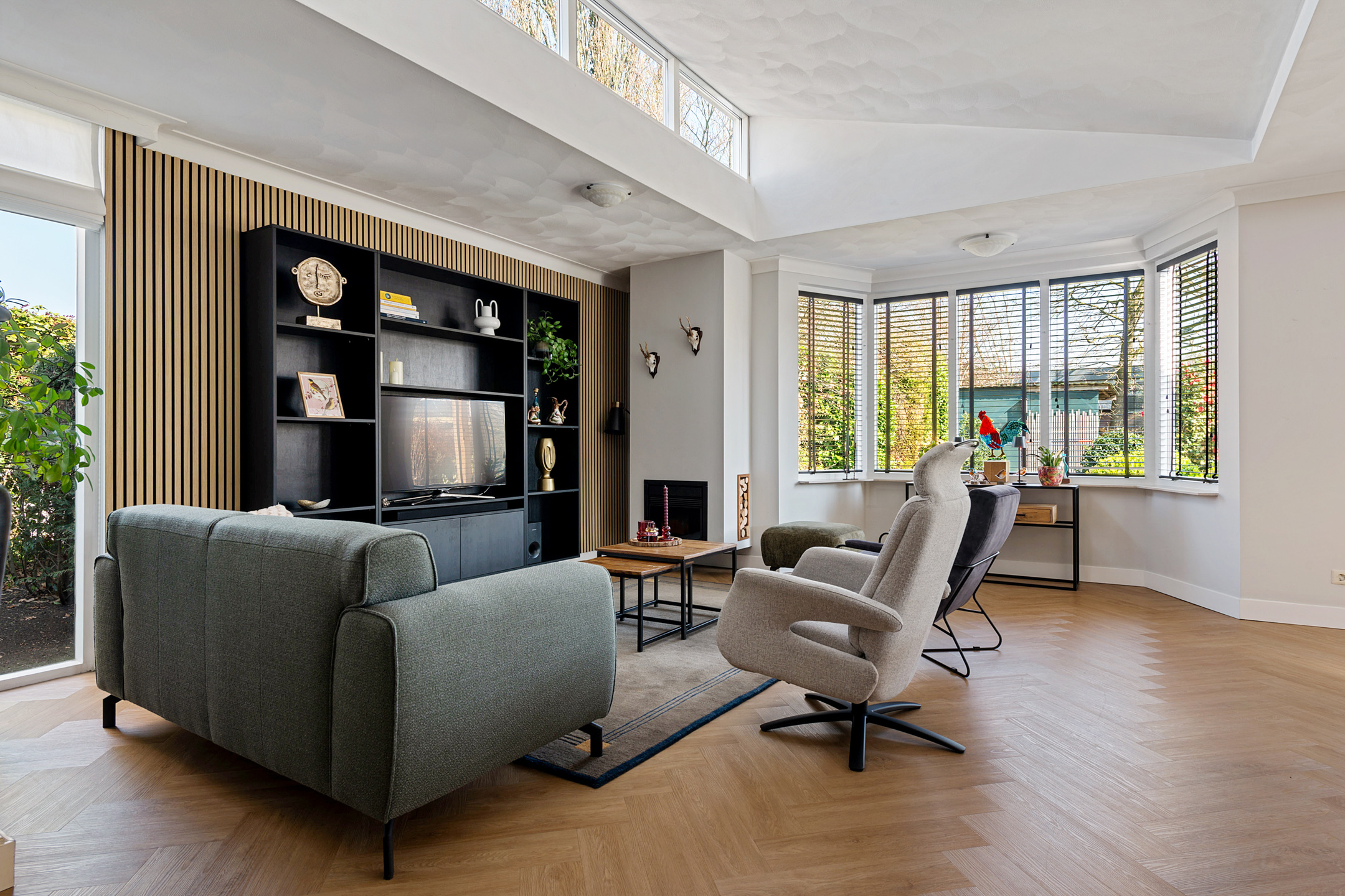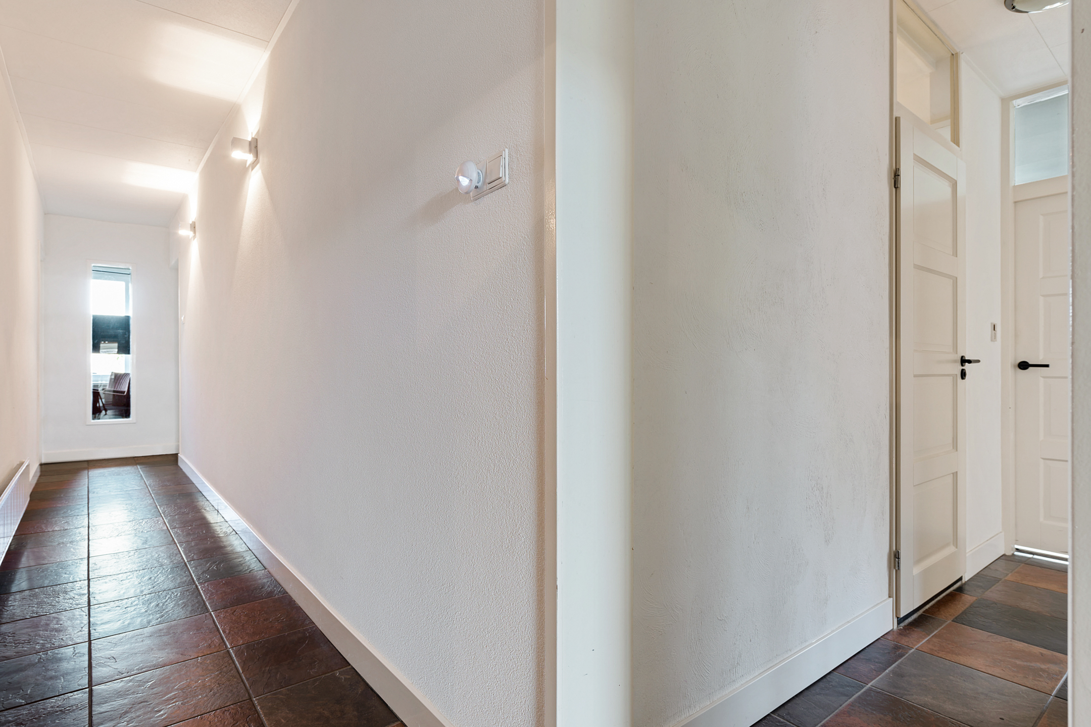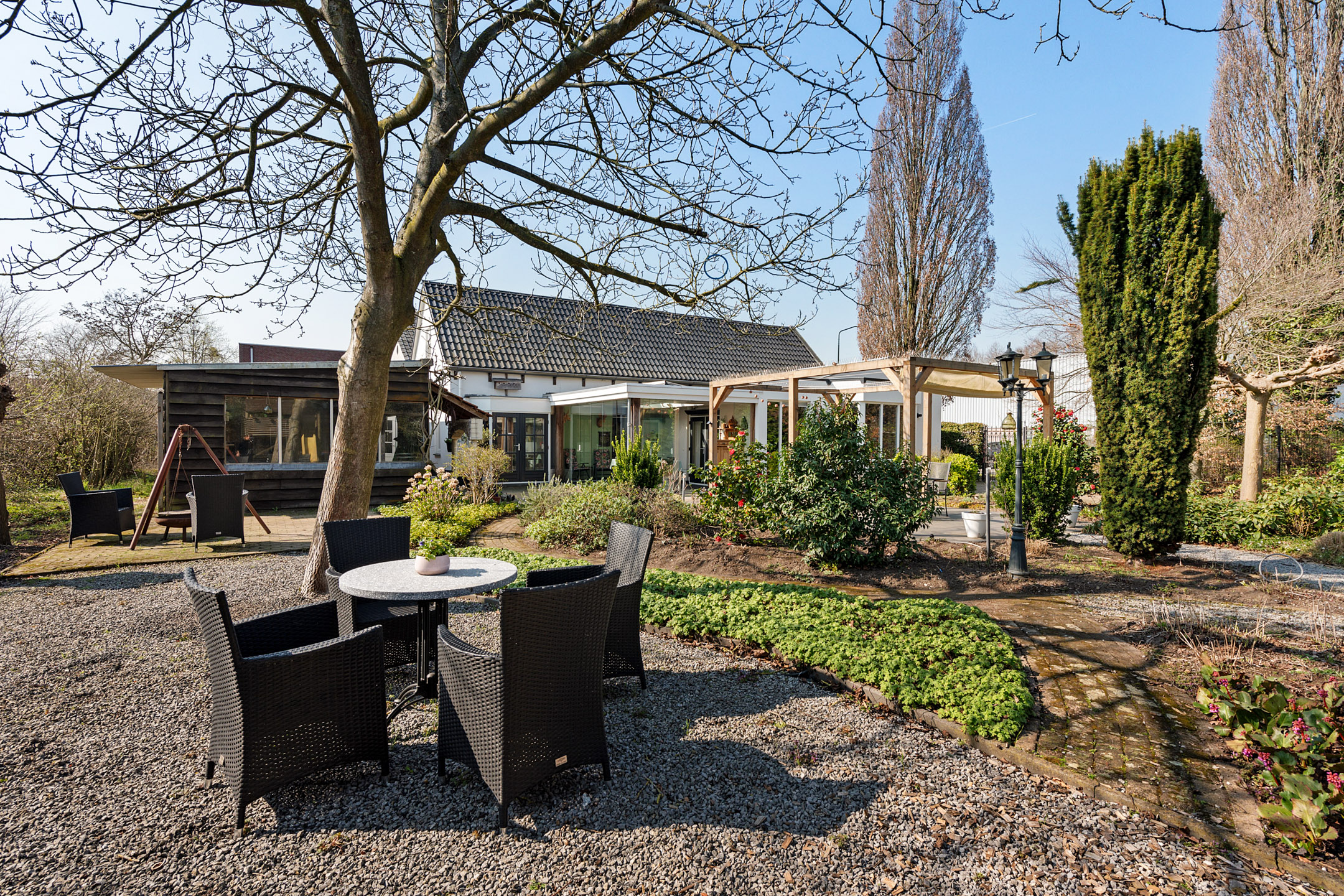 In de hal bevindt zich de meterkast (verdeler in de bedrijfsruimte) en de toegang tot de royale L-vormige woonkamer. De woonkamer is fraai afgewerkt met strak stucwerk op wanden en plafond en een PVC-vloer met comfortabele vloerverwarming. Een erker zorgt voor een prettig tuincontact en veel lichtinval. Daarnaast zorgt een pelletkachel voor extra sfeer en warmte. Aansluitend bereikt u de tuinkamer, die is voorzien van een lichtstraat, heater en een glazen wand. De open keuken bestaat uit een rechte kastenwand en een kookeiland met een bar. De keuken is voorzien van een inductiekookplaat, koelkast, combi-oven/magnetron en een vaatwasser. De hoofdslaapkamer is netjes afgewerkt met stucwerk wanden en plafond en vloerbedekking. Deze kamer beschikt over een inloopkast, kunststof kozijnen en airconditioning. Slaapkamer 2 is voorzien van een laminaatvloer en slaapkamer 3 beschikt over openslaande tuindeuren. Daarnaast zijn er twee een multifunctionele ruimtes die kunnen dienen als speelkamer, kantoor aan huis of als doorgang naar de bedrijfsruimte. In een tussenportaal met toegang tot diverse vertrekken bevindt zich de toiletruimte. De badkamer is volledig betegeld en voorzien van een badkamermeubel met wastafel, een inbouwcloset, douche, designradiator en mechanische ventilatie. Vanuit zowel de woning als de bedrijfsruimte is de verdieping bereikbaar. Deze wordt momenteel gebruikt als een ruime bergzolder.
