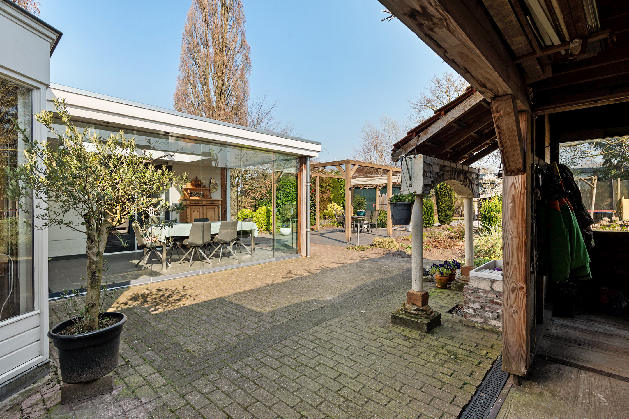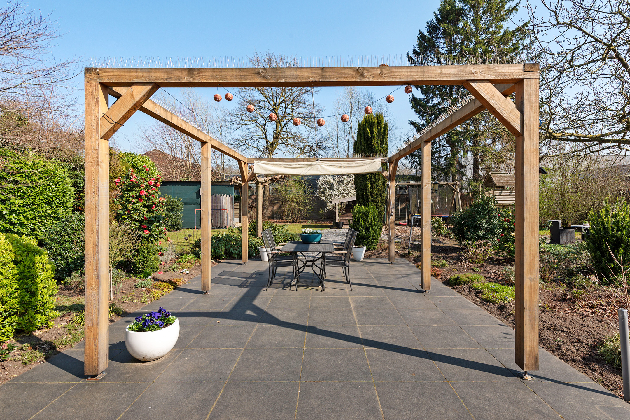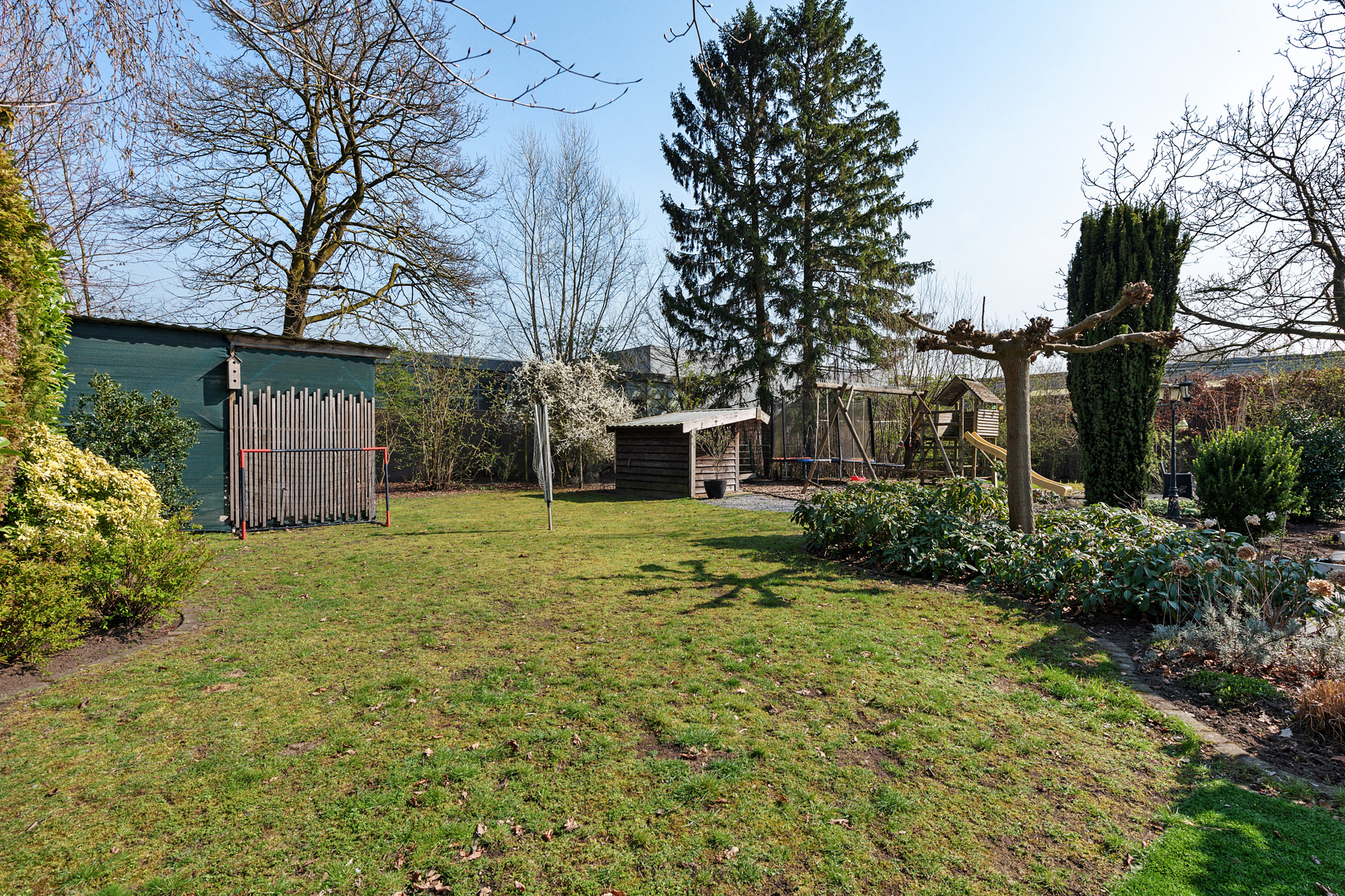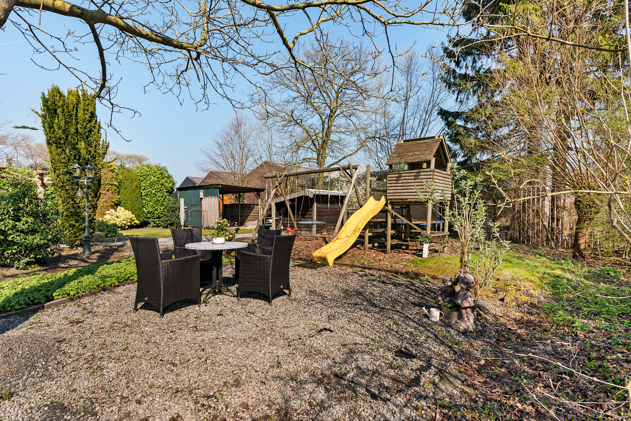 Aan de voorzijde is er ruimte om drie auto’s op eigen terrein te parkeren. De voortuin is aangelegd met gazon en boompjes. Aan de linkerzijde heeft u via een sierpoort toegang tot de achtertuin. Deze zeer royale tuin is aangelegd met een stenen terras, gazon en diverse vaste planten en borders.