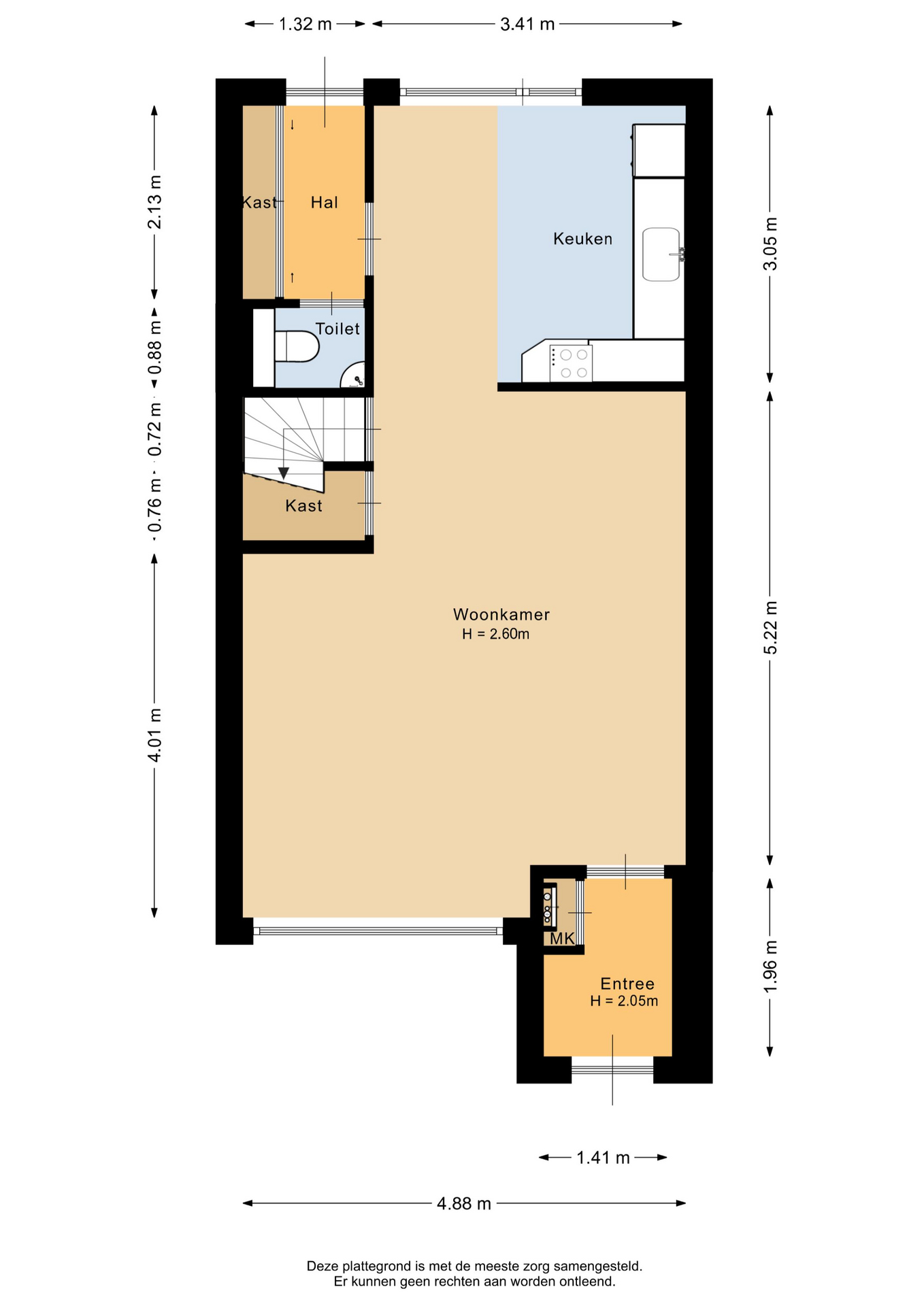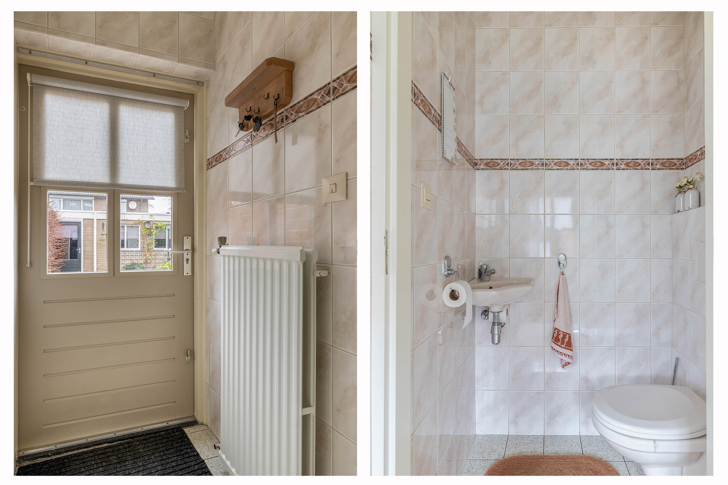 Begane grond: Via de entree/hal met de meterkast en garderobenis kom je in de woonkamer. De woonkamer is goed afgewerkt met stucwerkwanden en -plafond, decoratief wandbehang en een tegelvloer. In de woonkamer bevinden zich de afgesloten trapopgang en een praktische trapkast. Aansluitend kom je in de halfopen keuken aan de achterzijde van de woning. Je treft hier een in hoek opgesteld keukenmeubel met boven- en onderkasten, lades, 1½ spoelbak, koelkast, combi-oven/magnetron, inductiekookstel, afzuigkap en een vaatwasser. Aan de achtergevel is, over de volledige breedte van de woning, een elektrische zonneluifel geplaatst. Vanuit de keuken is er toegang tot een tussenportaal met een loopdeur naar de tuin en de toiletruimte met vrijhangend toilet en fonteintje.