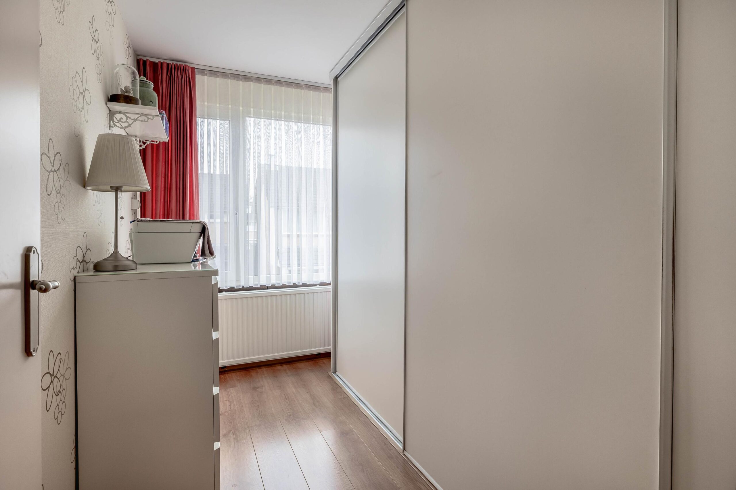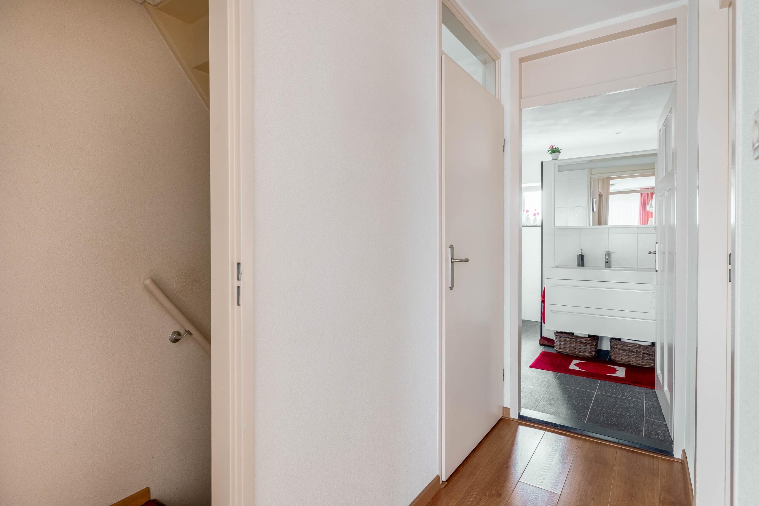 Eerste verdieping: Overloop met toegang tot drie slaapkamers en de badkamer. De overloop en slaapkamers zijn allen goed afgewerkt met strak stucwerk op de wanden en plafonds en een laminaatvloer. Alle kamers beschikken over kunststof kozijnen met HR-beglazing en rolluiken (twee kamers elektrisch en één kamer handmatig). In één slaapkamer zijn tevens de aansluitingen voor de wasmachine en droger aanwezig. De badkamer is volledig betegeld en voorzien van een inloopdouche, inbouwcloset, wastafel in meubel, designradiator en een te openen raam.