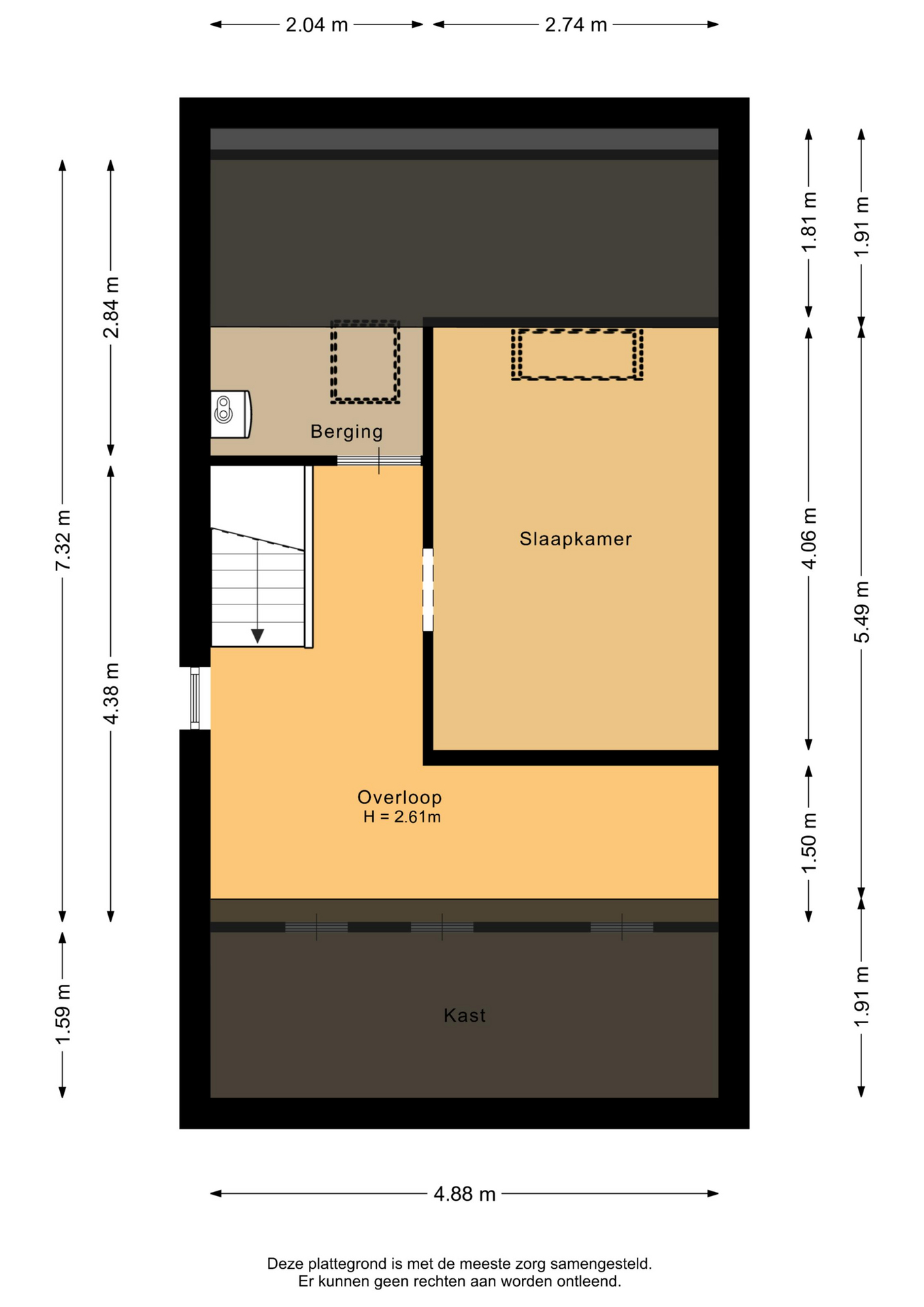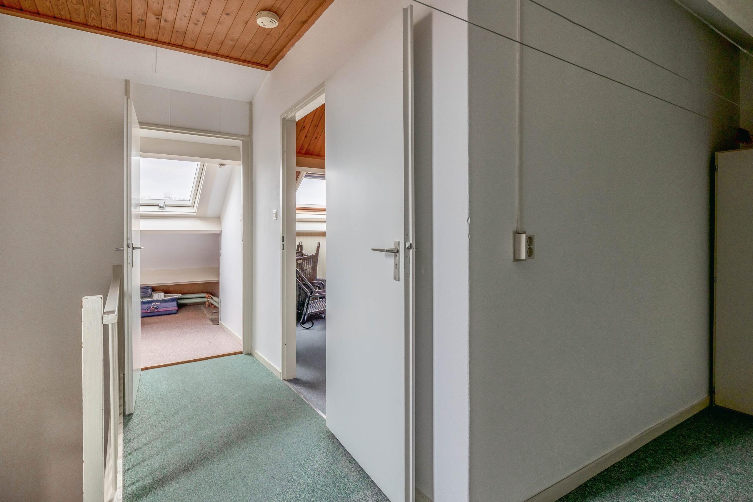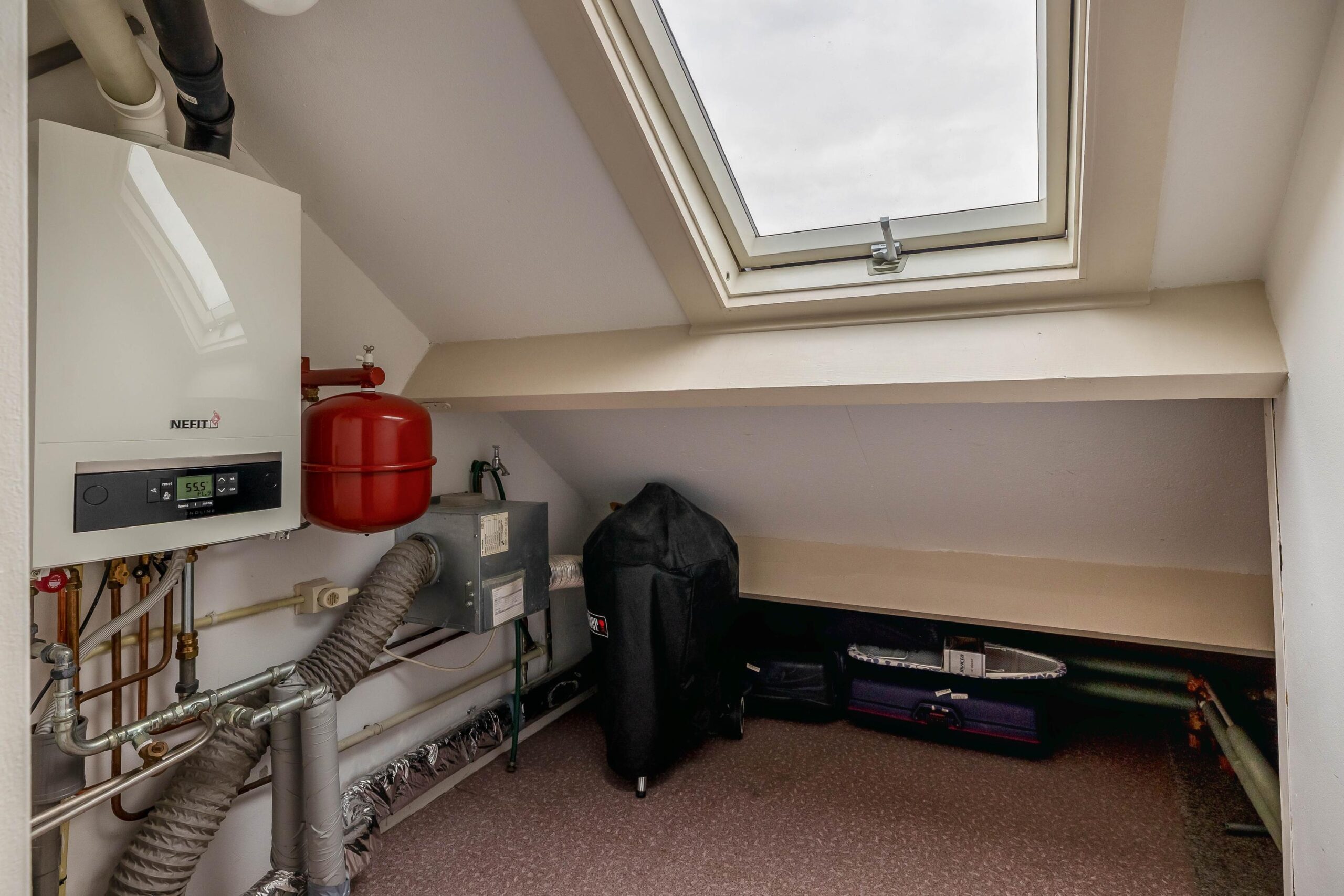 Tweede verdieping: Op de voorzolder van de tweede verdieping staat de cv-installatie opgesteld (Nefit Trendline, 2019) en vind je de omvormer voor de 10 zonnepanelen. Ook beschik je hier over veel bergruimte. De vierde slaapkamer is voorzien van vloerbedekking en een dakraam.