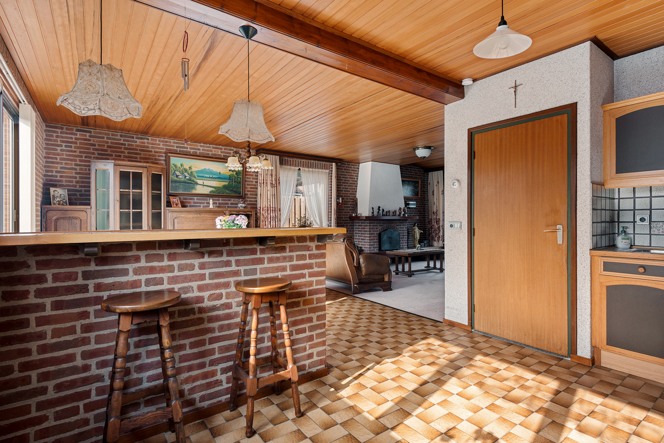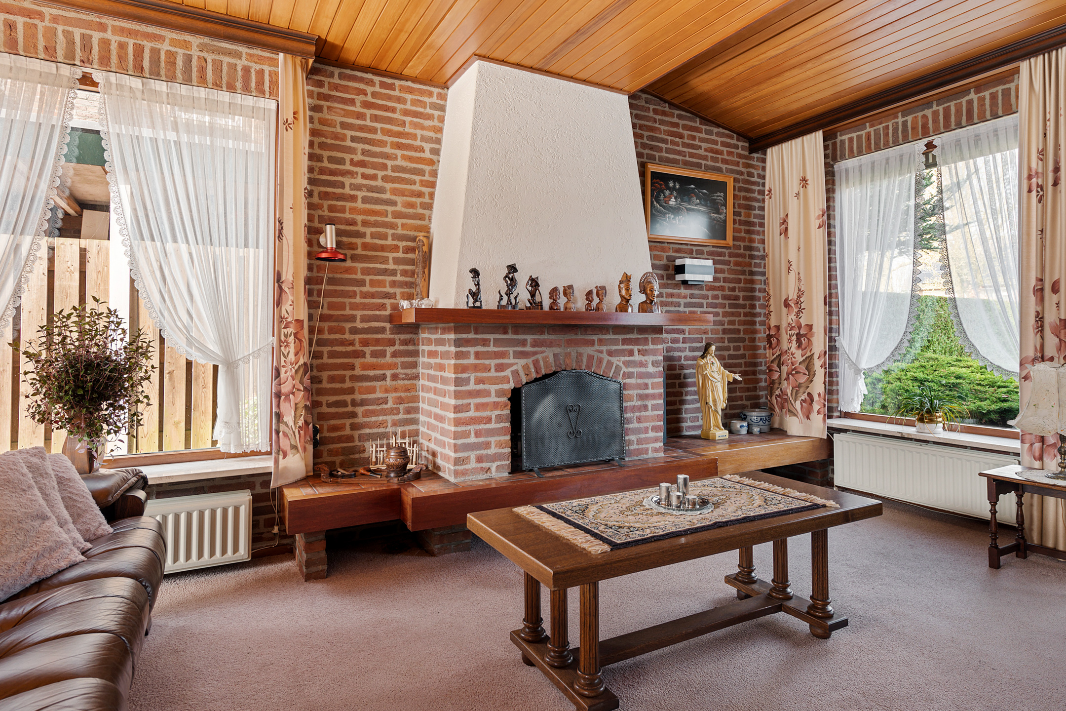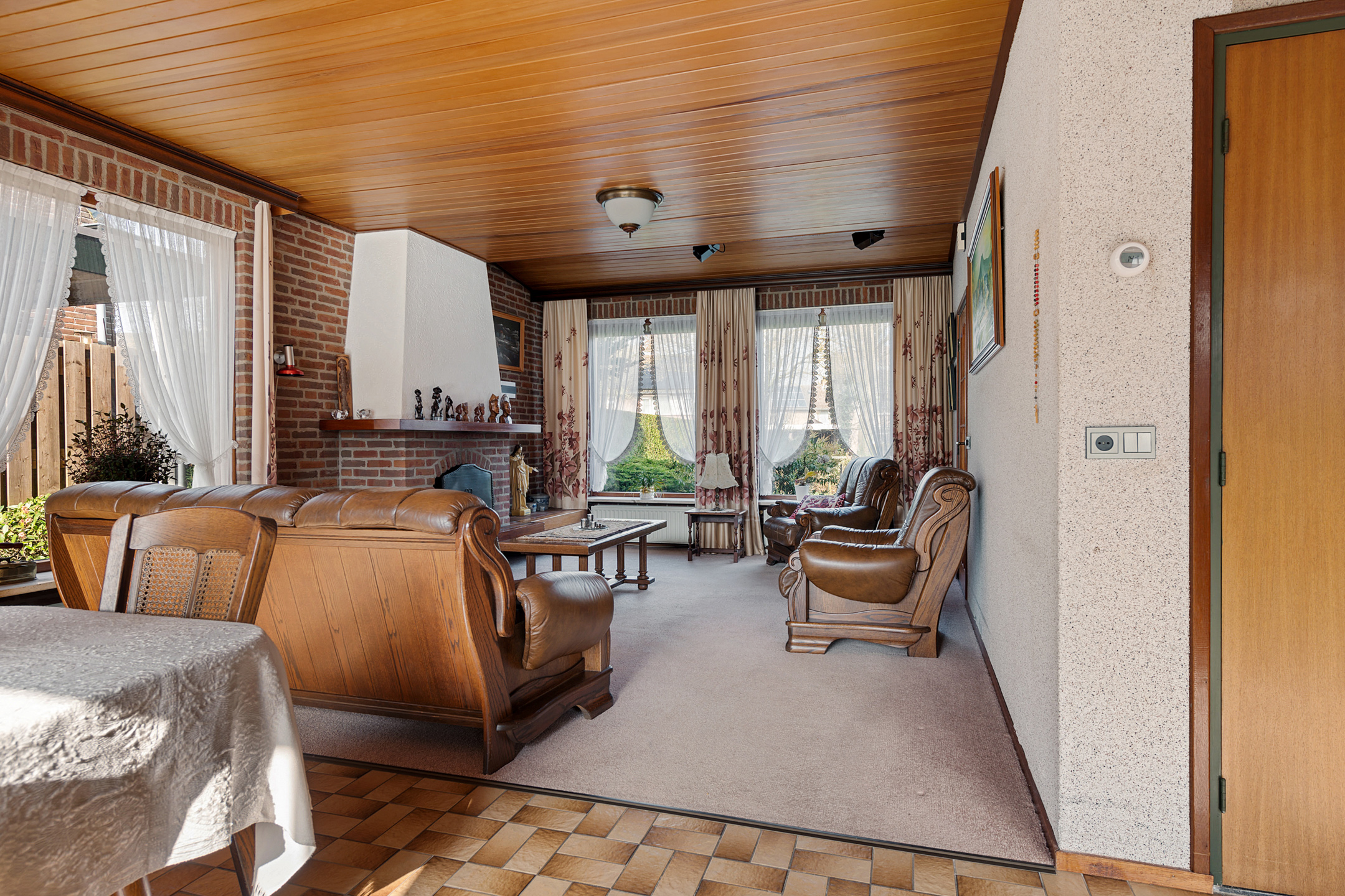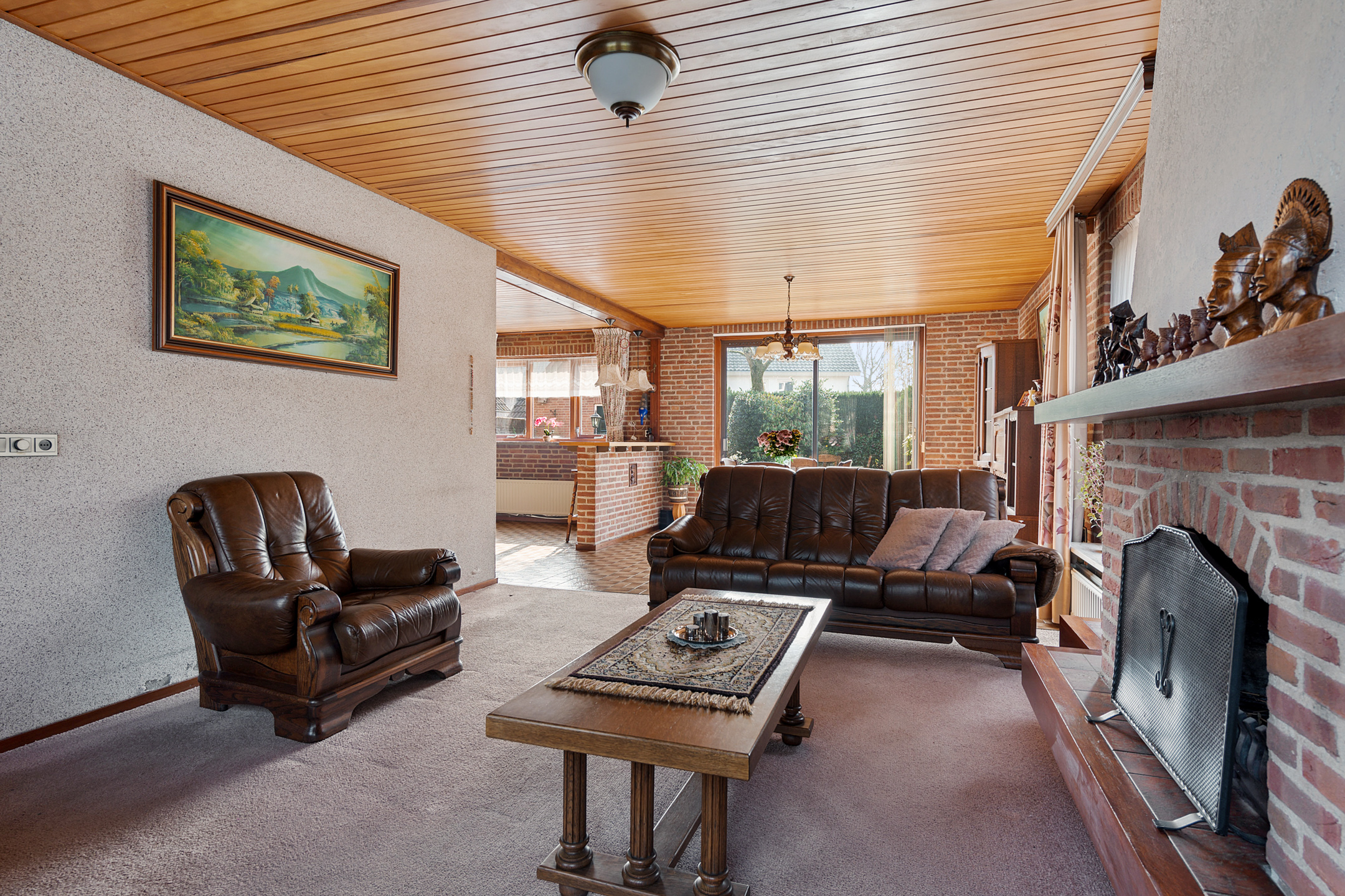 Begane grond: U betreedt de woning via de hal met een ruime garderobenis en toegang tot de woonkamer. De L-vormige woonkamer kenmerkt zich door veel lichtinval dankzij de grote raampartijen en de schuifpui aan de achterzijde, die direct toegang geeft tot de tuin. De open haard vormt een sfeervol middelpunt van de ruimte. De halfopen keuken is voorzien van een groot L-vormig massief houten keukenmeubel met een gaskookplaat, afzuigkap, 1½ spoelbak, oven en koelkast. Daarnaast beschikt de keuken over een praktische vaste kast voor het opbergen van proviand. In het portaal aan de achterzijde vindt u de achterom, een bergkast met de cv-installatie en de toiletruimte met closet en fonteintje.