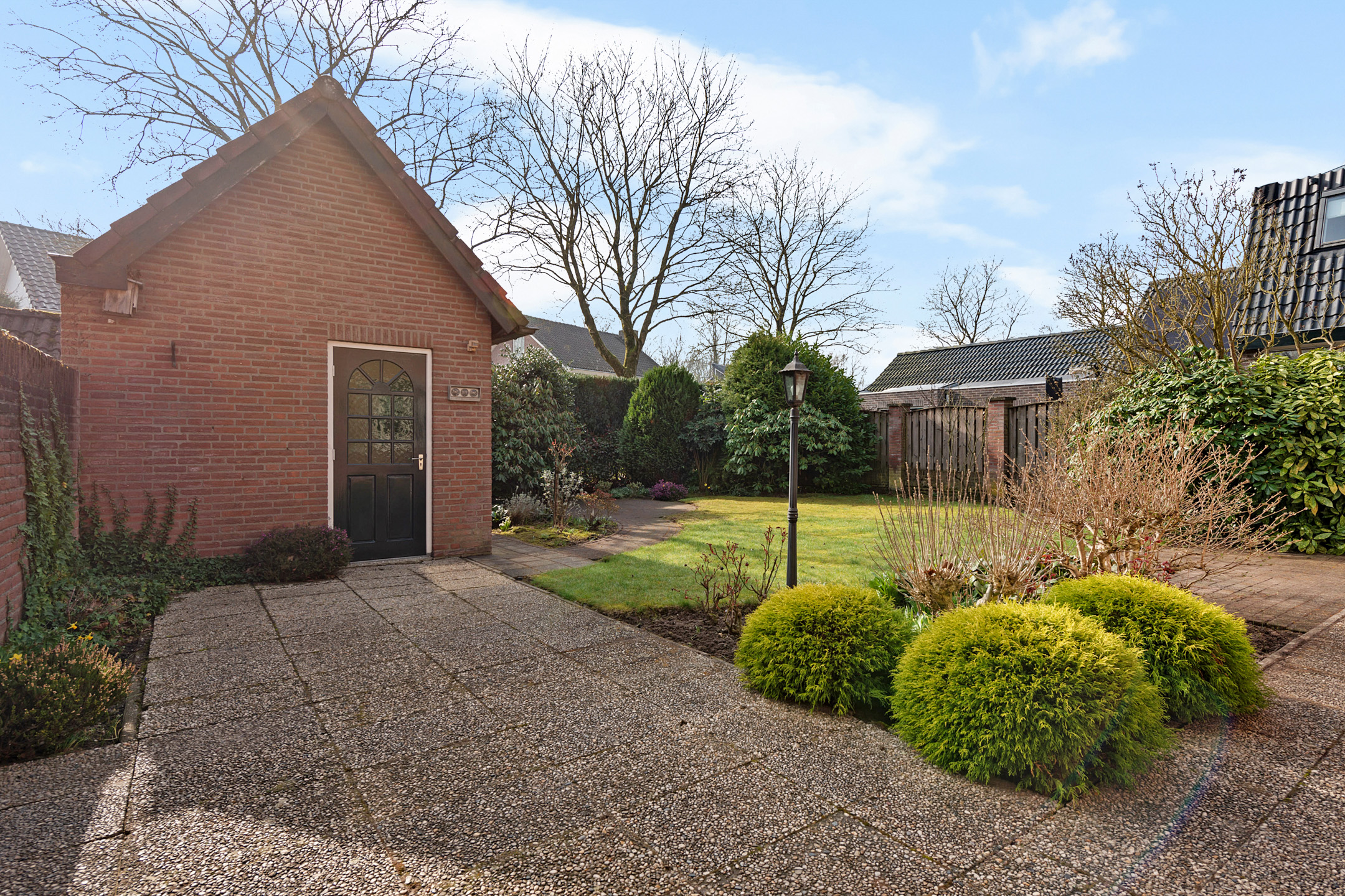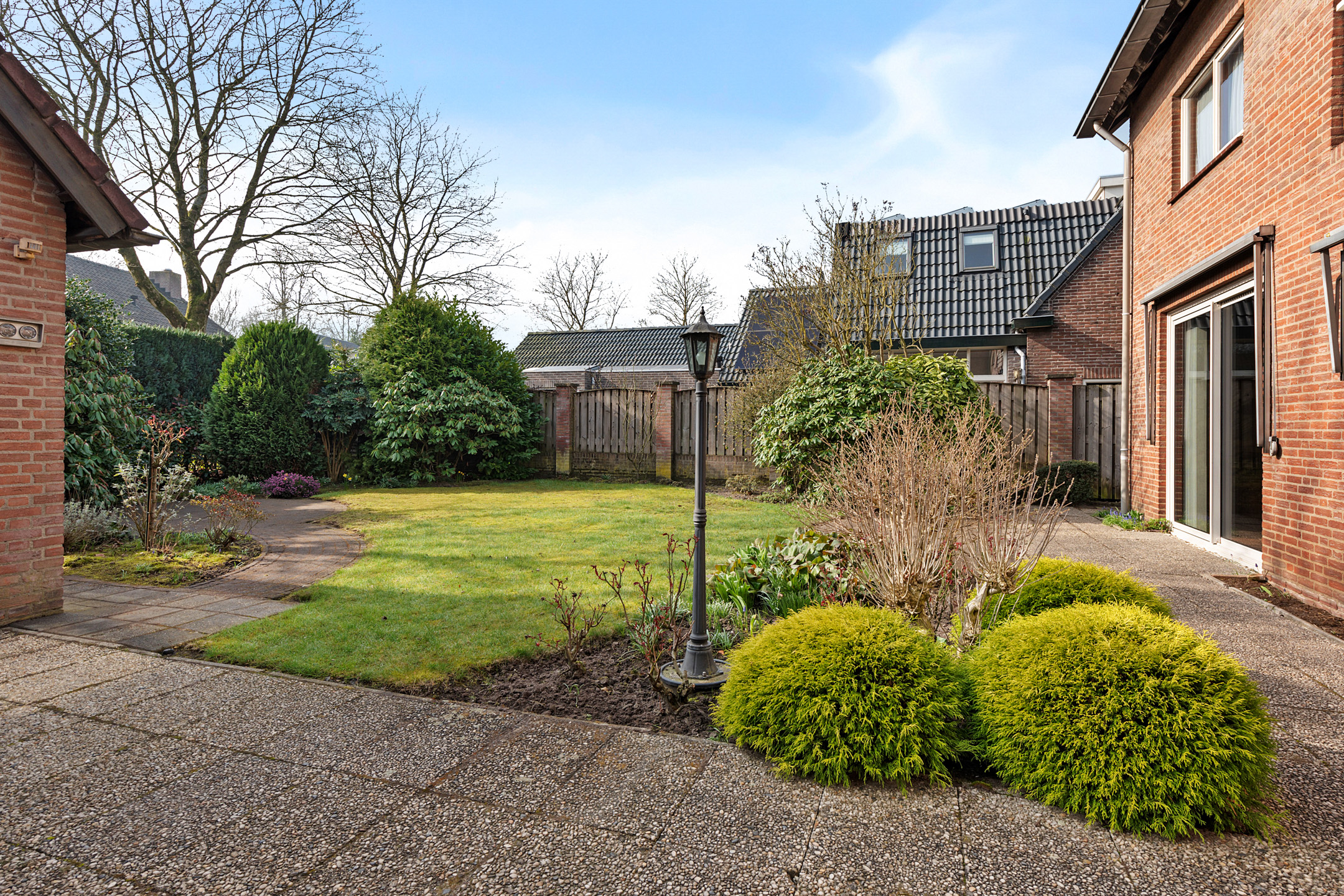 Aan de voorzijde beschikt de woning over een ruime voortuin, aangelegd met gazon, bomen en vaste plantenborders. De lange oprit biedt parkeergelegenheid voor drie auto’s. De achtertuin is gelegen op het zuiden, waardoor u hier gedurende de dag van veel zonuren geniet. Een zonneluifel aan de woning zorgt indien gewenst voor schaduw. De tuin is bereikbaar vanuit de woning en via een achterom. De tuin is verzorgd aangelegd met een terras, gazon, bomen en borders. Tevens beschikt de tuin over een buitenkraan en een grondwaterput. Achter in de tuin staat een stenen berging met elektra en een handige vliering.