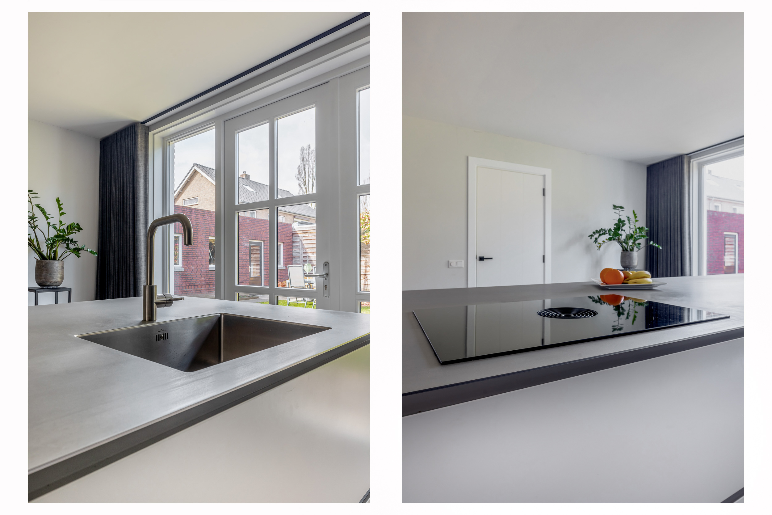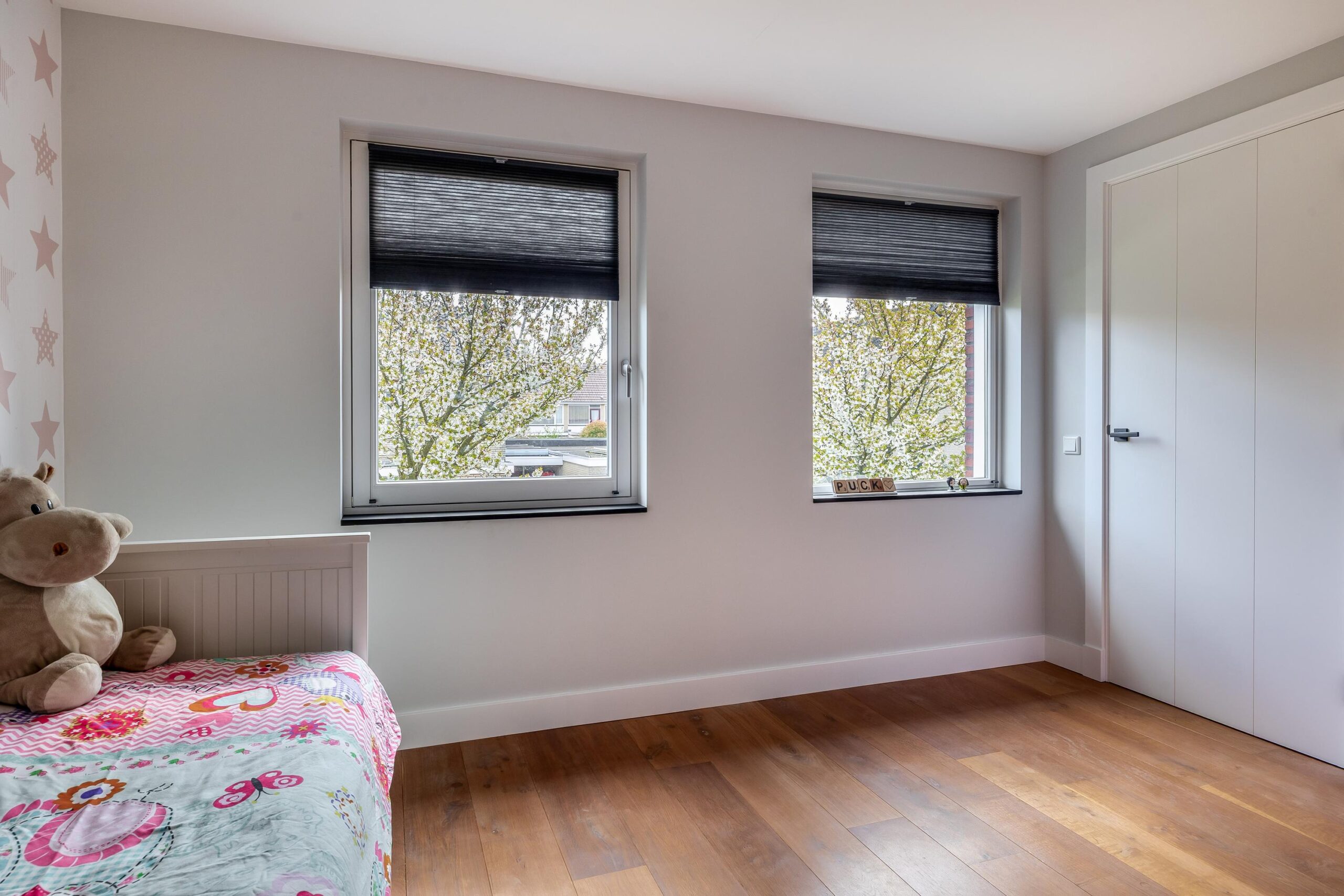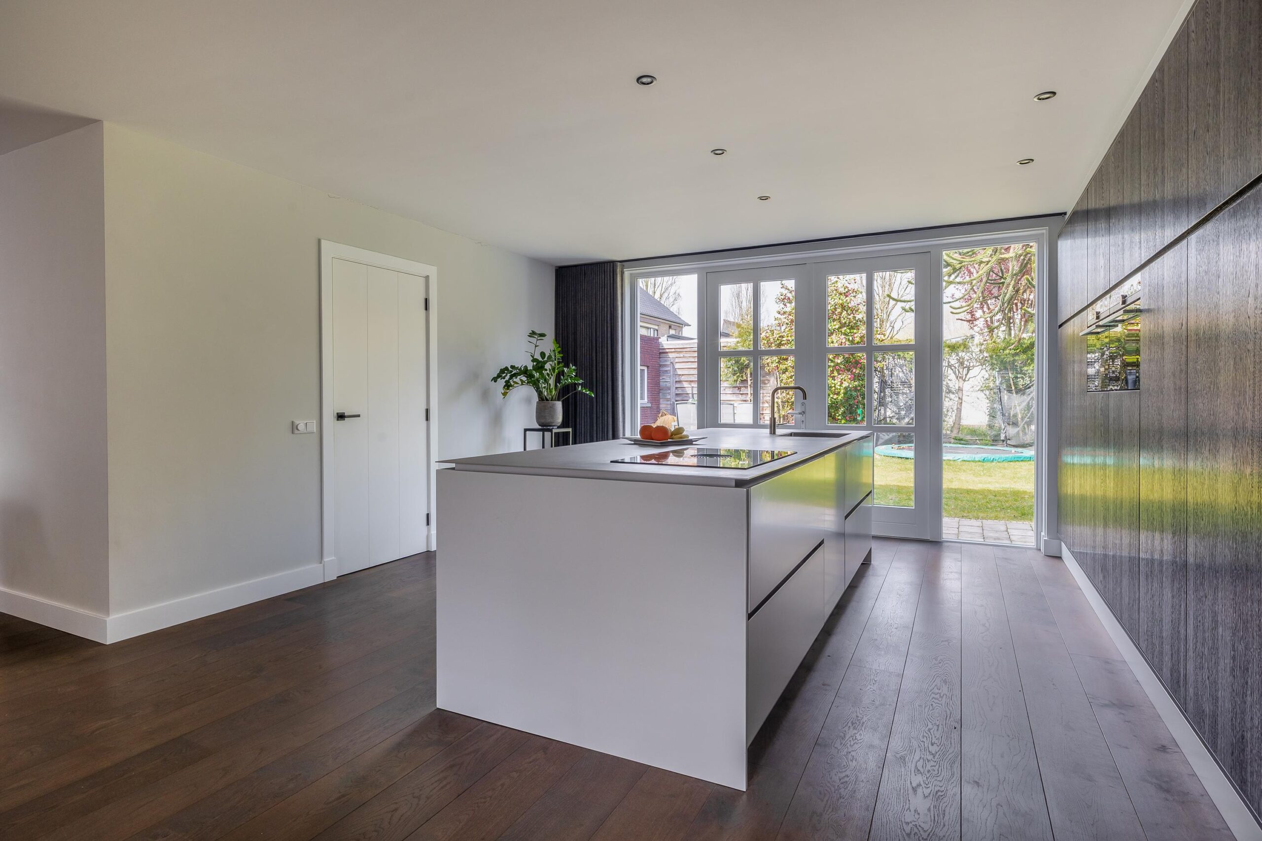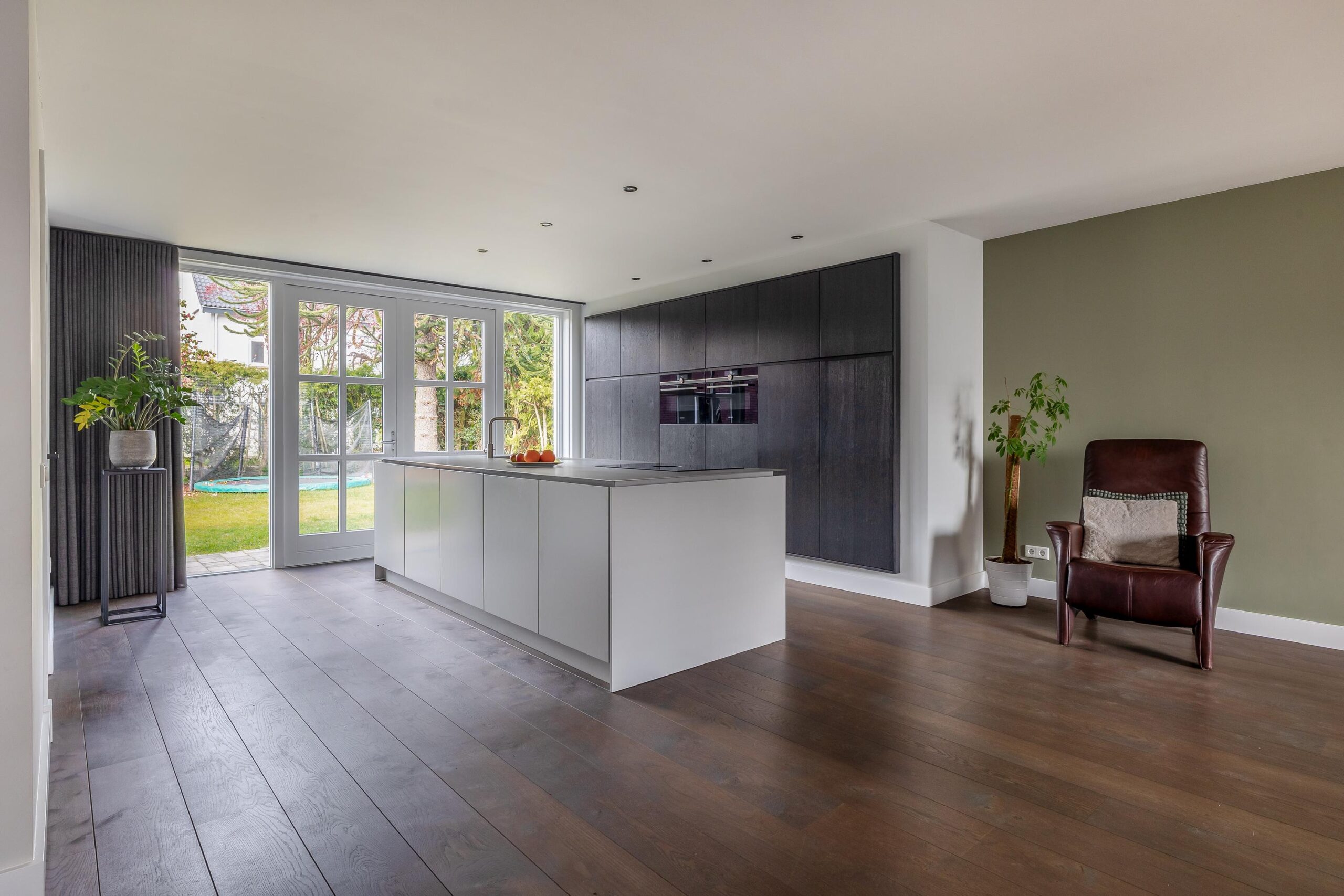 Begane grond: Via de overdekte entree komt u binnen in de hal. Hier bevinden zich de meterkast en de trapopgang naar de eerste verdieping. De ruime woonkamer is fraai afgewerkt met strak stucwerk op wanden en plafond en een sfeervolle houten vloer met vloerverwarming. Doordat de woning aan de achterzijde is uitgebouwd, is de woonkamer bijzonder royaal. Er is voldoende ruimte voor een grote eettafel en daarnaast een apart gedeelte dat bijvoorbeeld kan worden ingericht als speelhoek. Dit gedeelte is eenvoudig af te sluiten, waardoor er een aparte kamer ontstaat. De open keuken is voorzien van een moderne, rechte kastenwand en een kook-/spoeleiland. De keuken beschikt over een Bora-inductiekookplaat met geïntegreerde afzuiging met afvoer naar buiten, twee stoomovens, een koelkast en een vaatwasser. Openslaande deuren bieden een mooi uitzicht op de tuin en zorgen voor veel natuurlijke lichtinval. Daarnaast beschikt de keuken over veel kastruimte. Aansluitend bereikt u de bijkeuken, met een aparte kast voor de cv-installatie (Intergas HRE, 2025), een fraaie toiletruimte en een loopdeur naar de tuin.