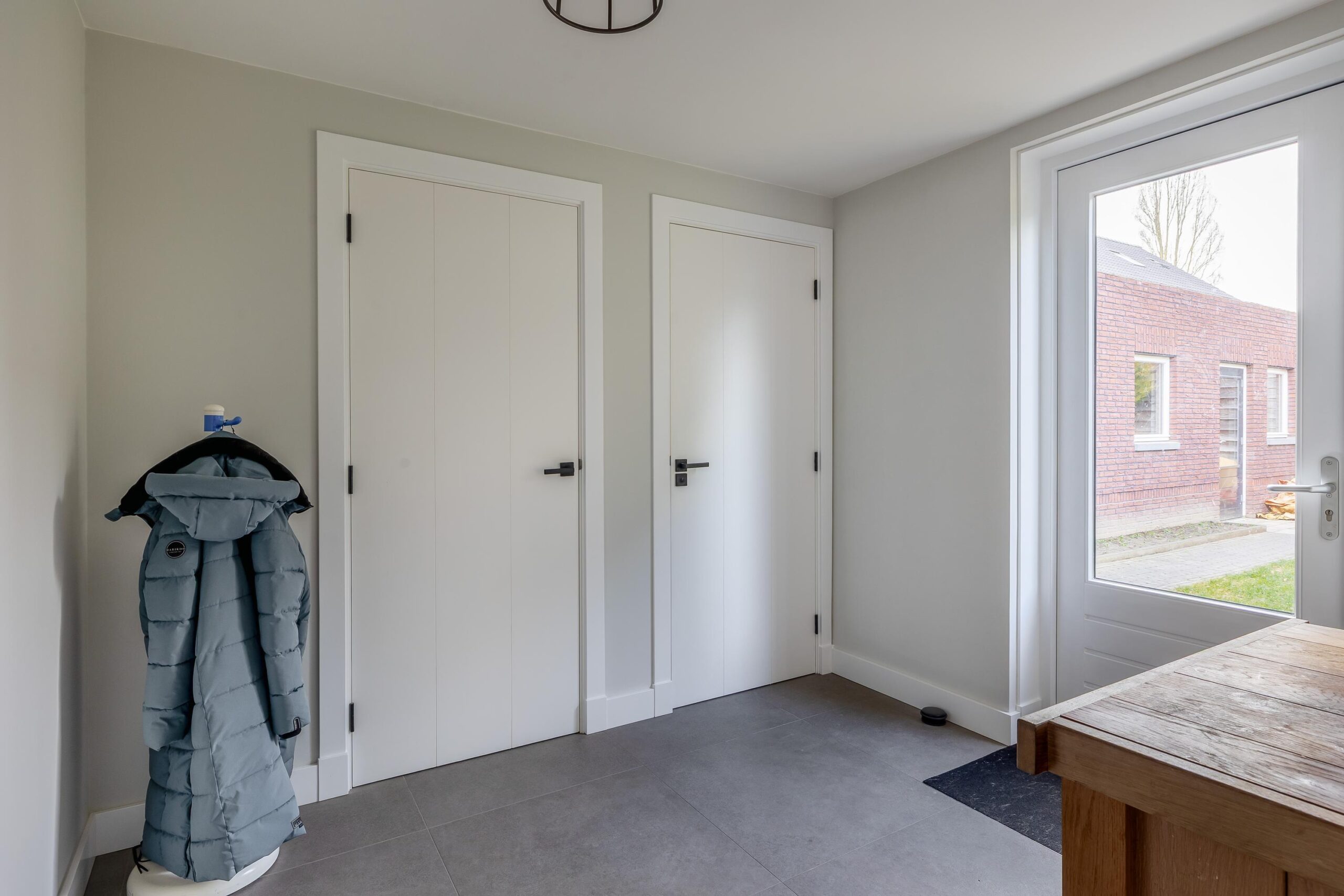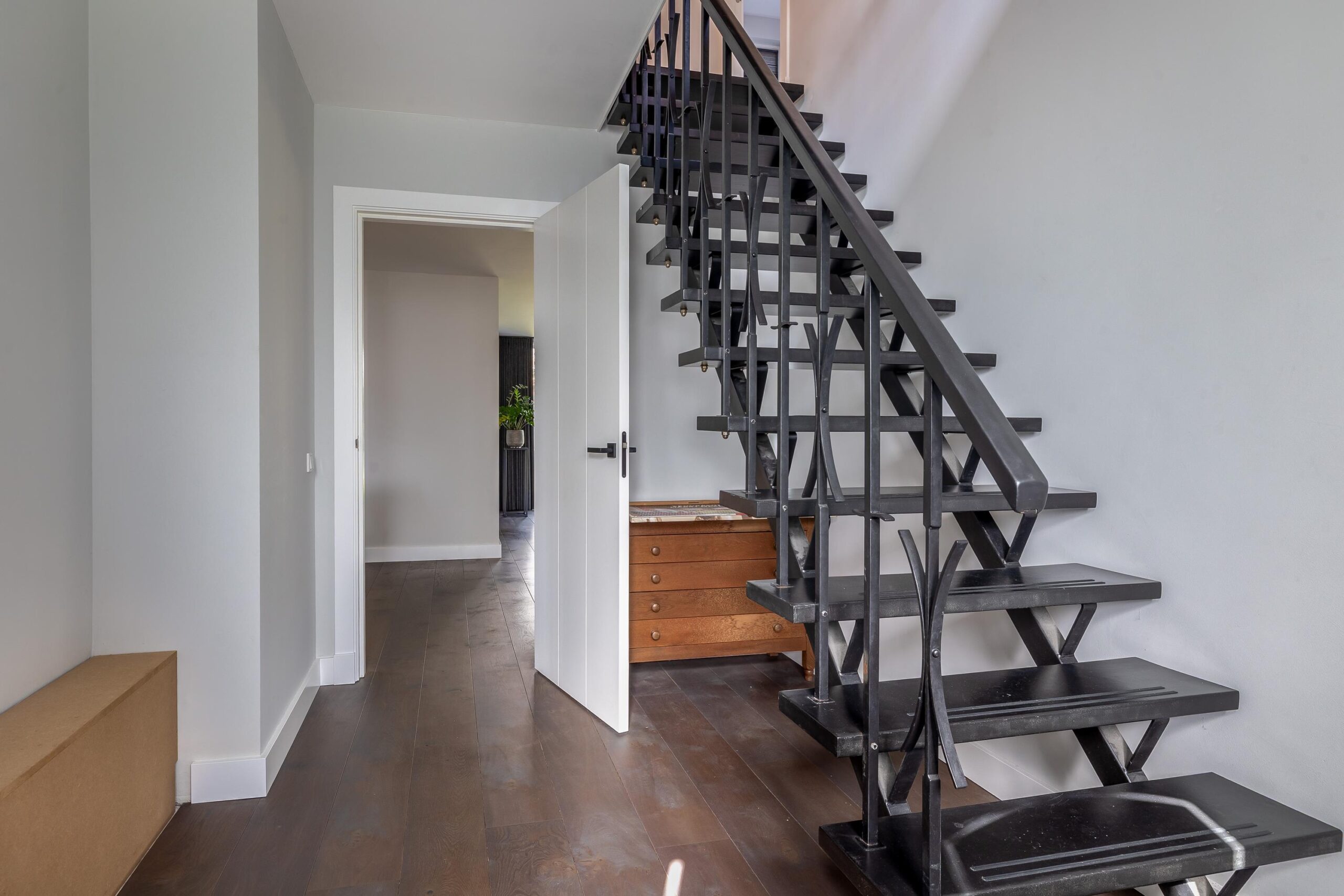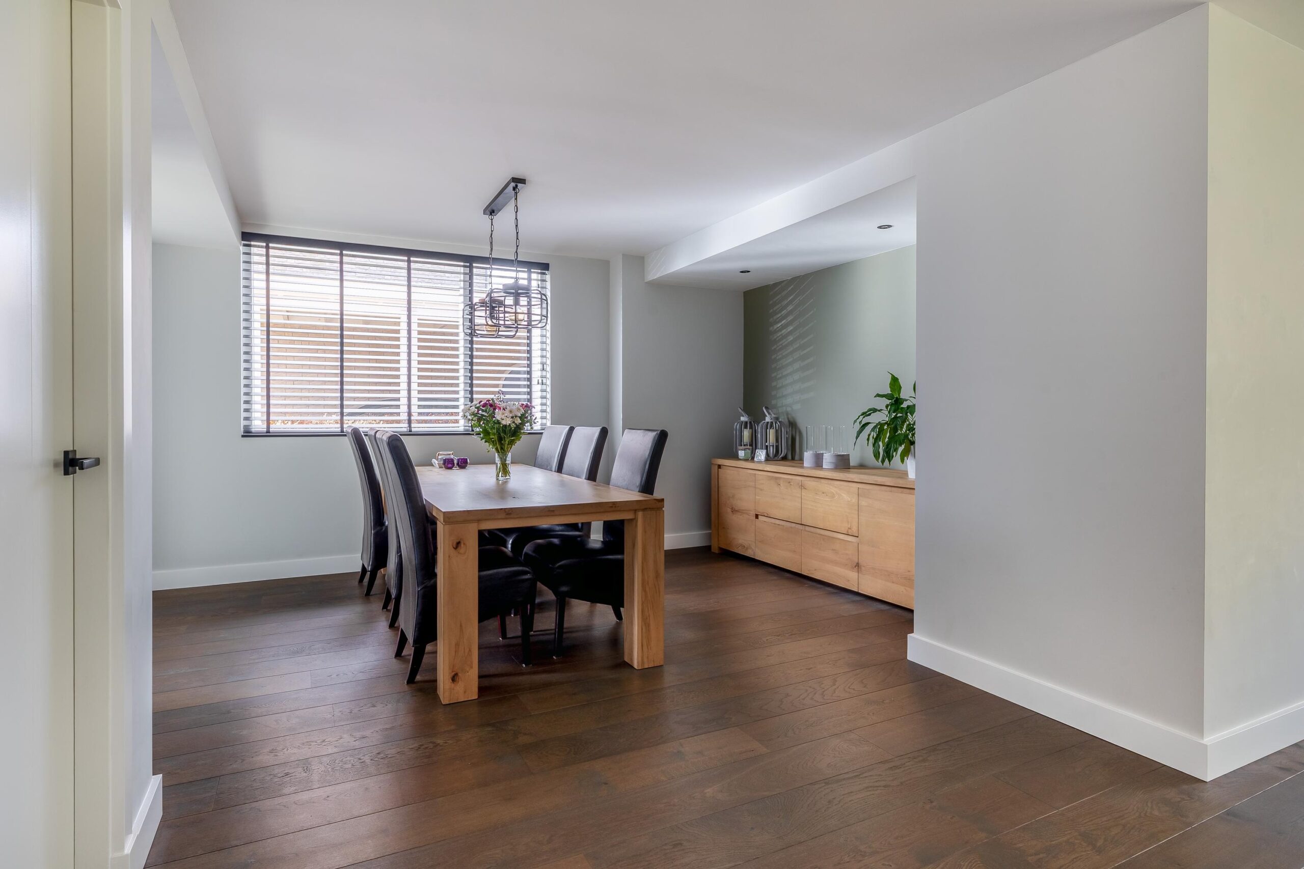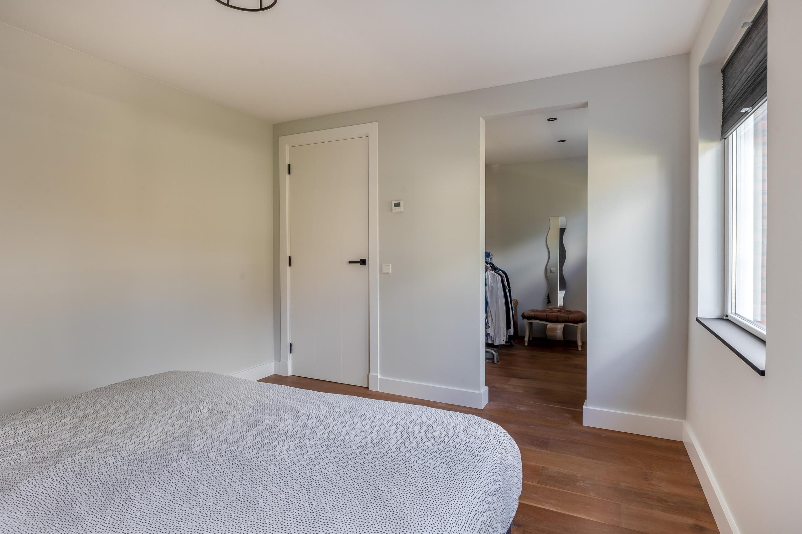 Begane grond: Via de overdekte entree komt u binnen in de hal. Hier bevinden zich de meterkast en de trapopgang naar de eerste verdieping. De ruime woonkamer is fraai afgewerkt met strak stucwerk op wanden en plafond en een sfeervolle houten vloer met vloerverwarming. Doordat de woning aan de achterzijde is uitgebouwd, is de woonkamer bijzonder royaal. Er is voldoende ruimte voor een grote eettafel en daarnaast een apart gedeelte dat bijvoorbeeld kan worden ingericht als speelhoek. Dit gedeelte is eenvoudig af te sluiten, waardoor er een aparte kamer ontstaat. De open keuken is voorzien van een moderne, rechte kastenwand en een kook-/spoeleiland. De keuken beschikt over een Bora-inductiekookplaat met geïntegreerde afzuiging met afvoer naar buiten, twee stoomovens, een koelkast en een vaatwasser. Openslaande deuren bieden een mooi uitzicht op de tuin en zorgen voor veel natuurlijke lichtinval. Daarnaast beschikt de keuken over veel kastruimte. Aansluitend bereikt u de bijkeuken, met een aparte kast voor de cv-installatie (Intergas HRE, 2025), een fraaie toiletruimte en een loopdeur naar de tuin.