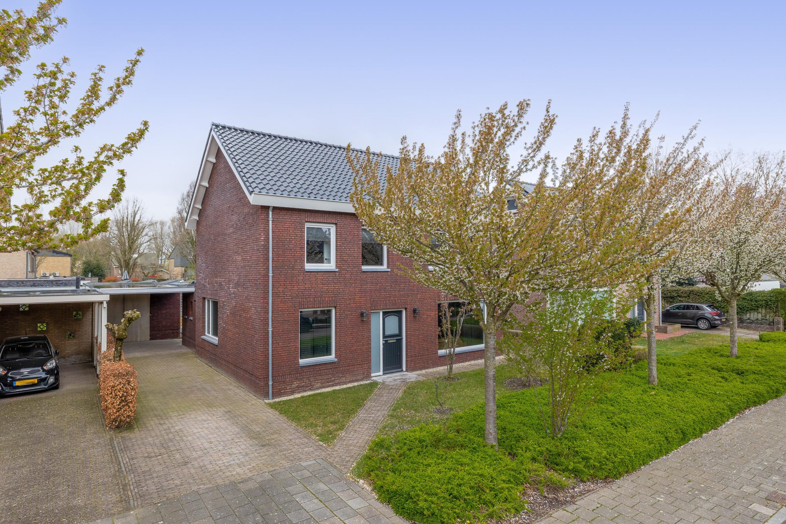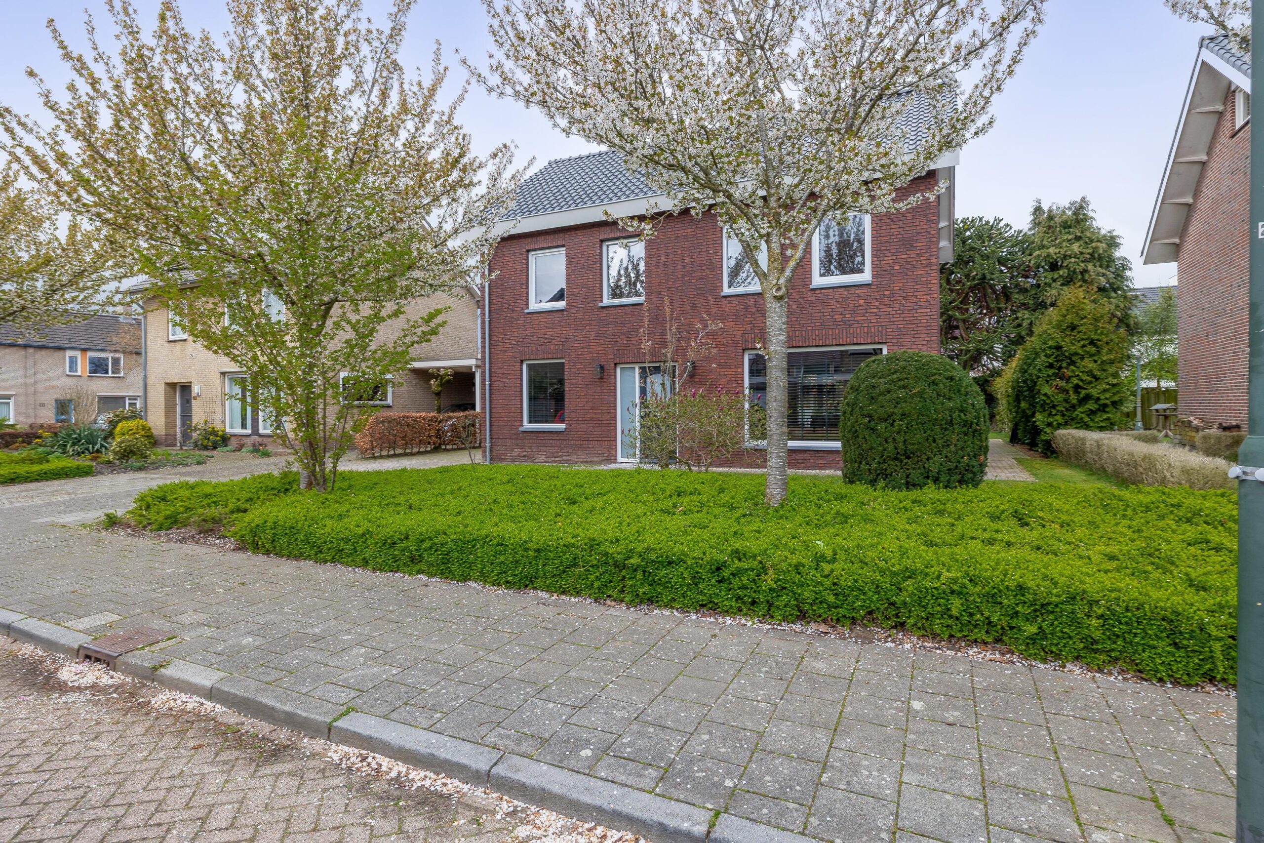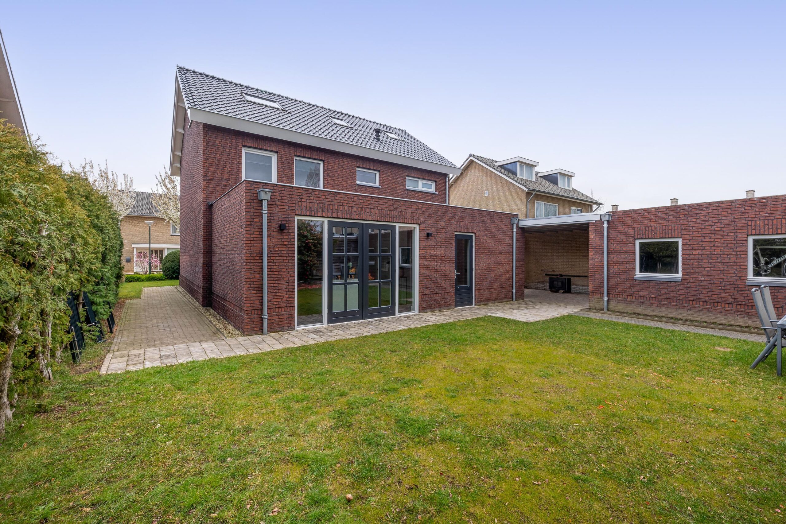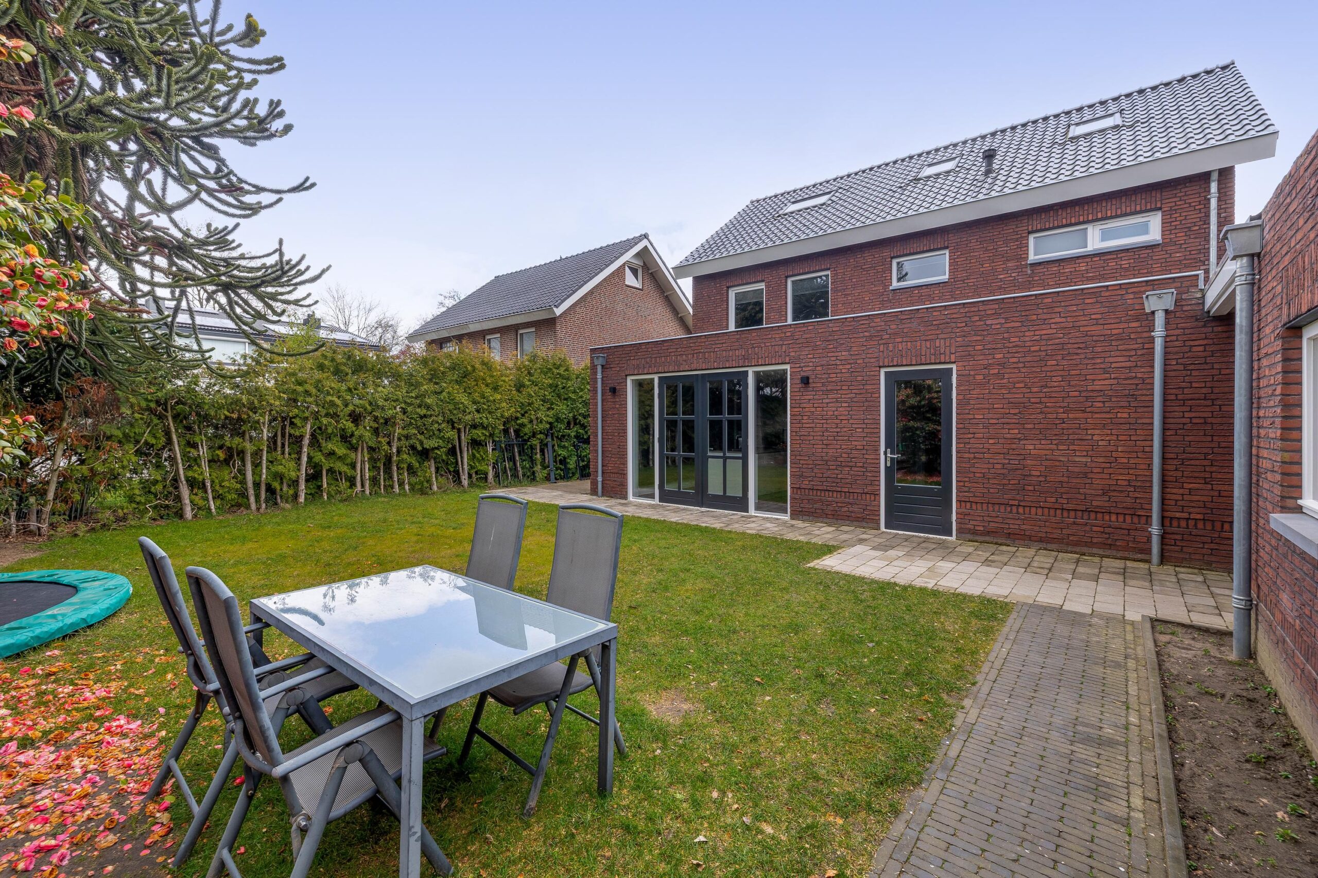 De voortuin is verzorgd aangelegd met vaste borders en beplanting. Aan de linkerzijde bevindt zich de oprit waar u meerdere auto’s op eigen terrein kunt parkeren. De achtertuin is bereikbaar vanuit de woning en vanuit de oprit. Deze is netjes aangelegd met een stenen terras, een groot gazon en diverse bomen. De garage is bereikbaar via draaideuren aan de oprit of via een loopdeur vanuit de tuin. Hier beschikt u over elektra en water. De garage is maar liefst 30 m² en biedt ruimte voor het parkeren van een auto, het stallen van fietsen en het opbergen van (tuin)gereedschap.