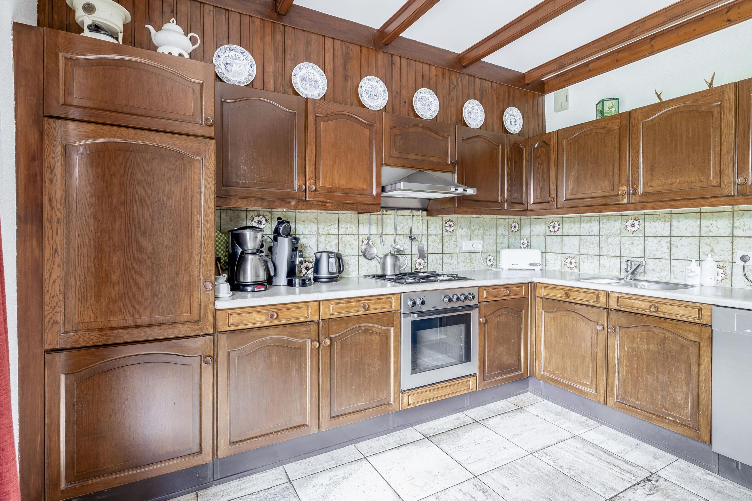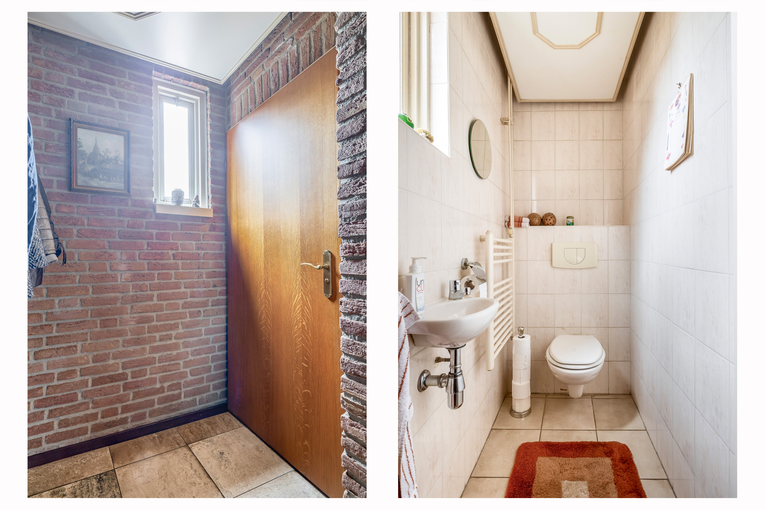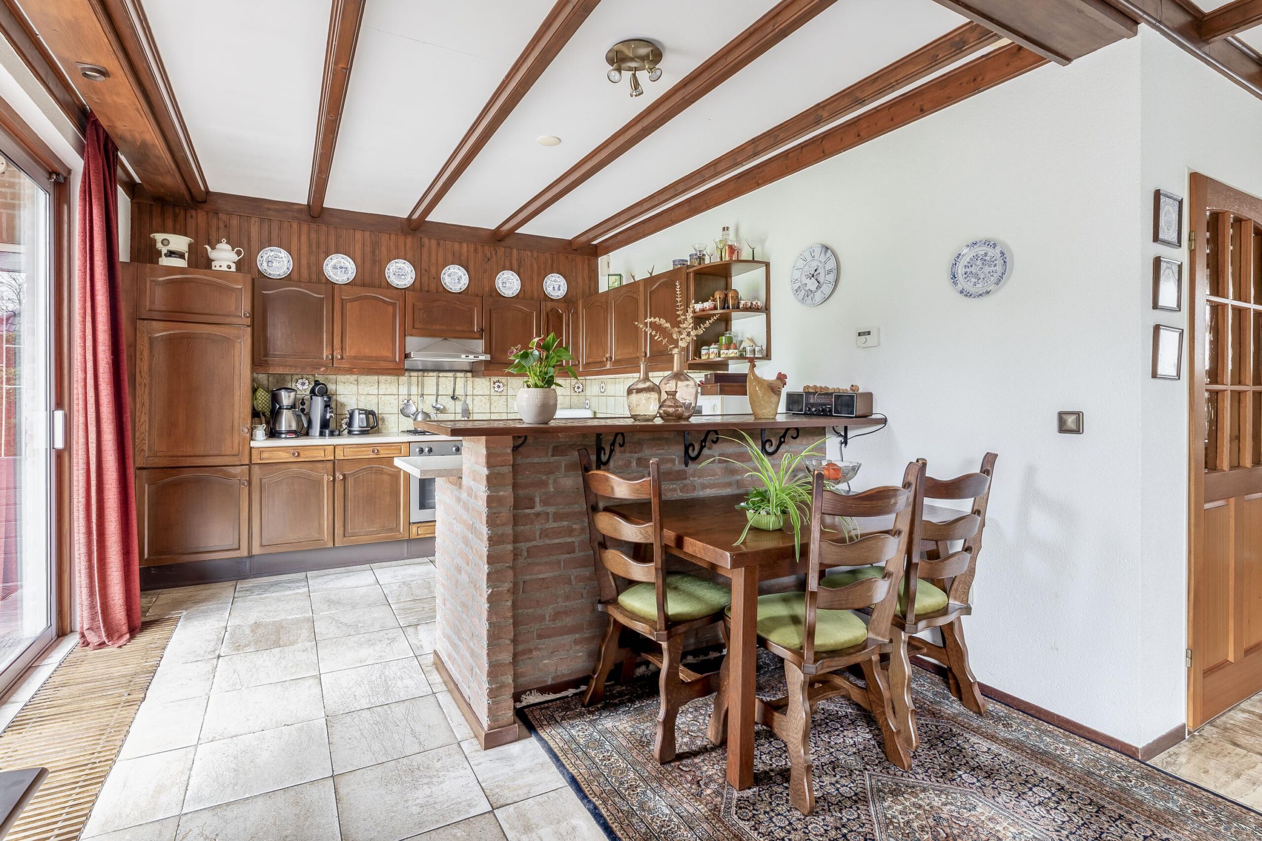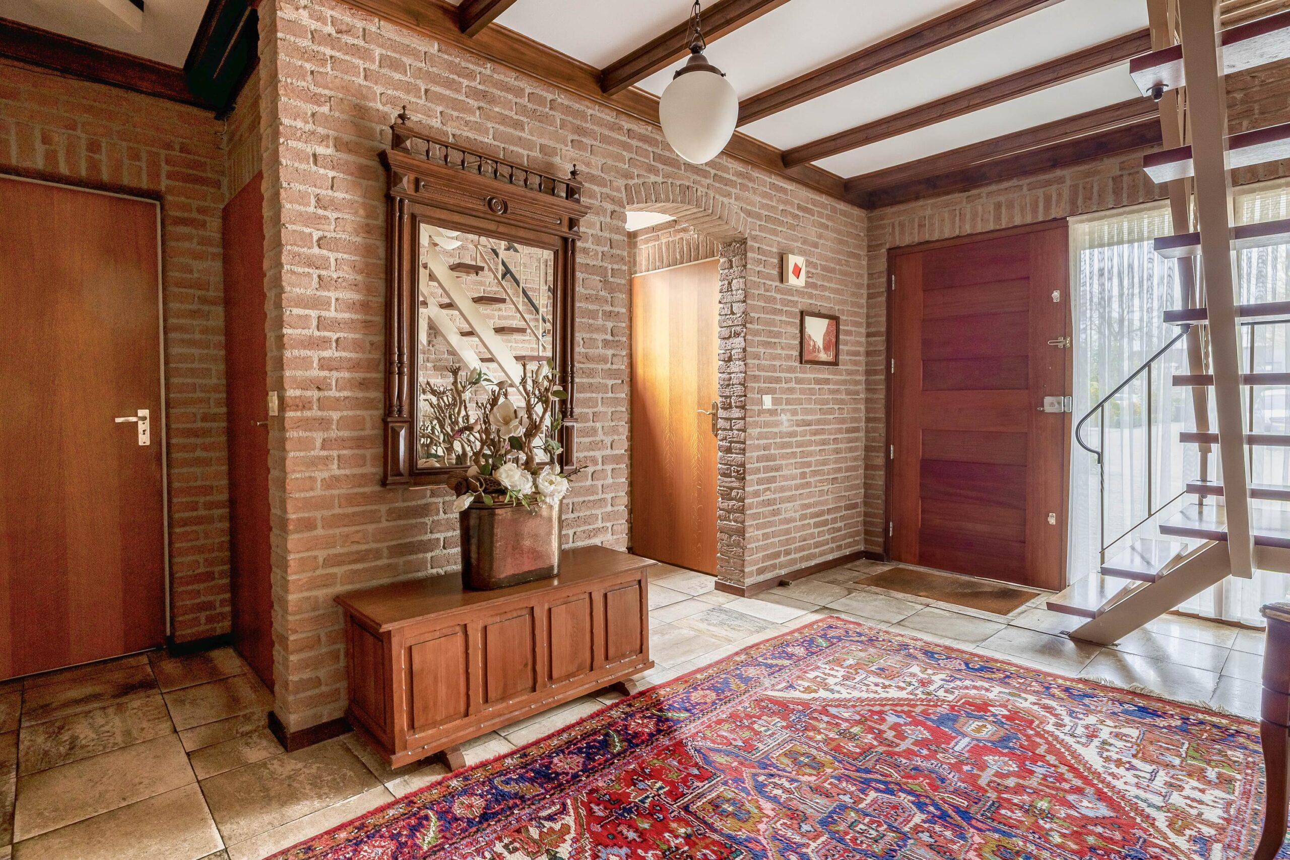 Begane grond: Via de hal met meterkast, garderobenis en toiletruimte (voorzien van een vrijhangend toilet en fonteintje) betreedt u de woning. De hal is afgewerkt met schoonmetselwerk en een tegelvloer die doorloopt in de woonkamer. De L-vormige woonkamer is ruim opgezet en beschikt over twee schuifpuien, wat zorgt voor lichtinval en direct contact met de tuin. De open haard vormt een sfeervol middelpunt. De open keuken is uitgevoerd in een U-opstelling en biedt veel werk- en bergruimte. De keuken is voorzien van een 1½ spoelbak, gaskookstel, oven, koelkast en vaatwasser. Aansluitend bevindt zich de bijkeuken met aansluitingen voor wasmachine en droger, een vaste kastenwand en toegang tot de tuin en de garage.