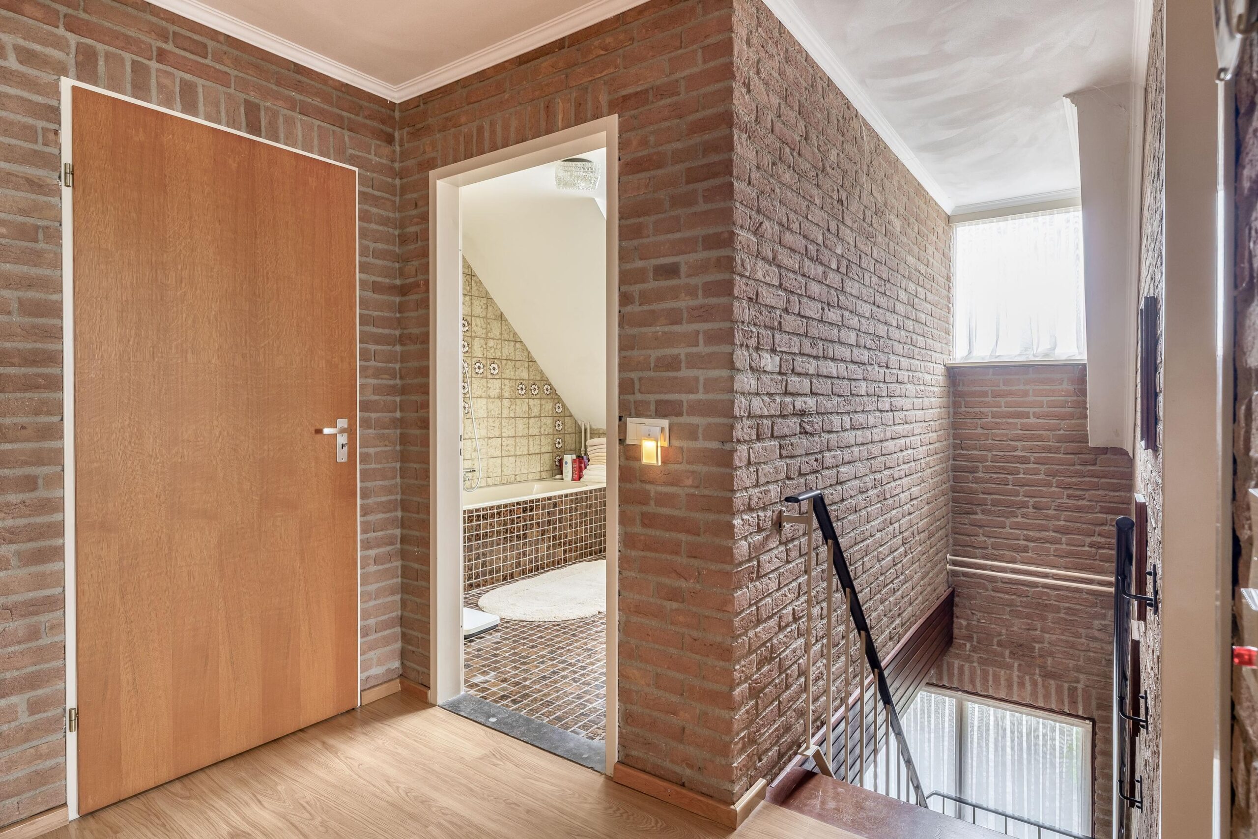Eerste verdieping: De overloop geeft toegang tot drie ruime slaapkamers, een bergkamer en de badkamer. In de bergkamer is de cv-installatie opgesteld. De badkamer is volledig betegeld en uitgerust met een ligbad, douche, toilet en twee wastafels. Een dakkapel zorgt voor extra lichtinval en ventilatie. De hoofdslaapkamer is afgewerkt met stucwerk wanden en plafond en voorzien van vloerbedekking. De overige slaapkamers zijn voorzien van een laminaatvloer en één slaapkamer heeft een eigen wastafel.