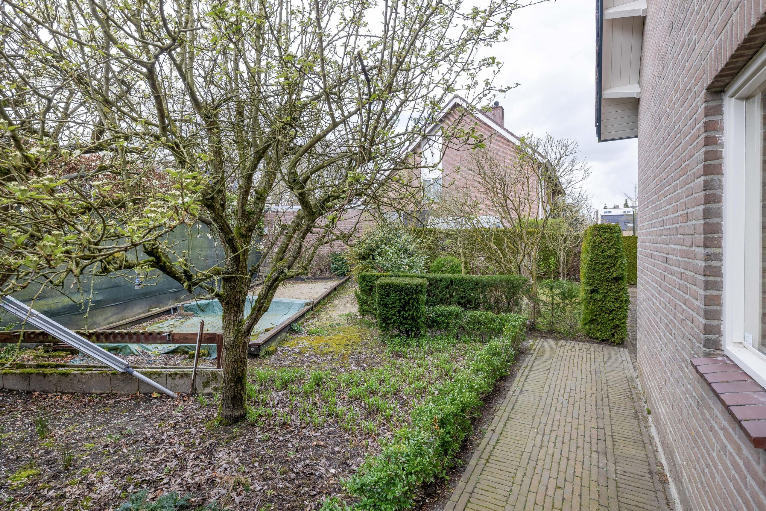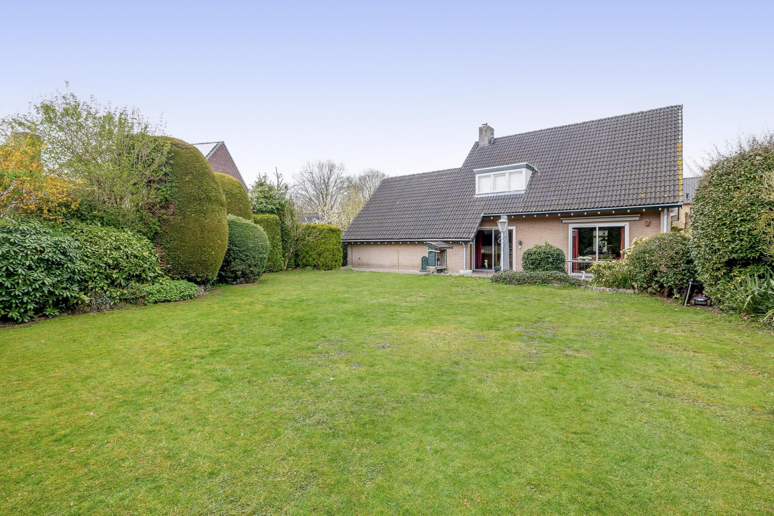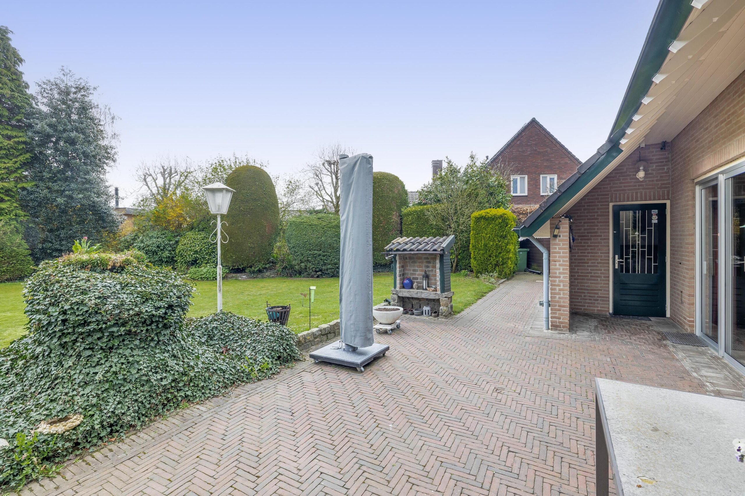 Aan de voorzijde is de tuin fraai aangelegd met diverse borders en vaste beplanting. Aan de rechterzijde kunt u maar liefst vier auto's op eigen terrein parkeren. De verzorgde tuin rondom de woning is een waar paradijs voor liefhebbers van rust, ruimte en groen. Met een groot gazon, volwassen beplanting, diverse borders, bomen en een terras (voorzien van een zonneluifel) is dit een plek om alle seizoenen van te genieten. Door de gunstige ligging van de achtertuin, geniet u hier van veel zonuren. Of u nu graag tuiniert, ontspant met een goed boek of de kinderen heerlijk buiten spelen, heer geniet het hele gezin van het buitenleven!