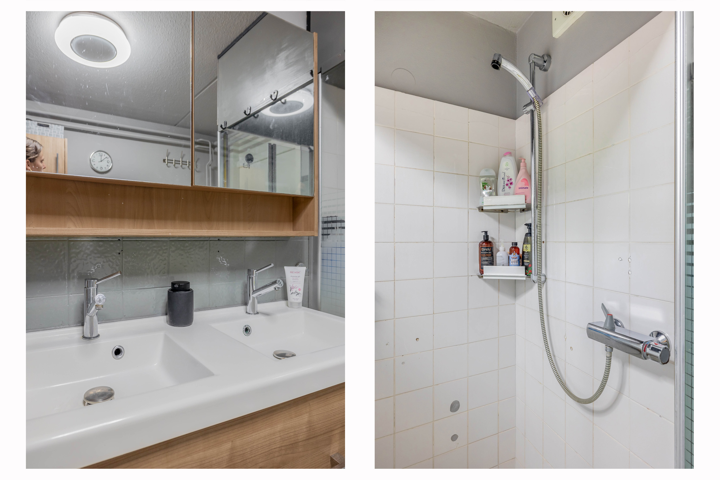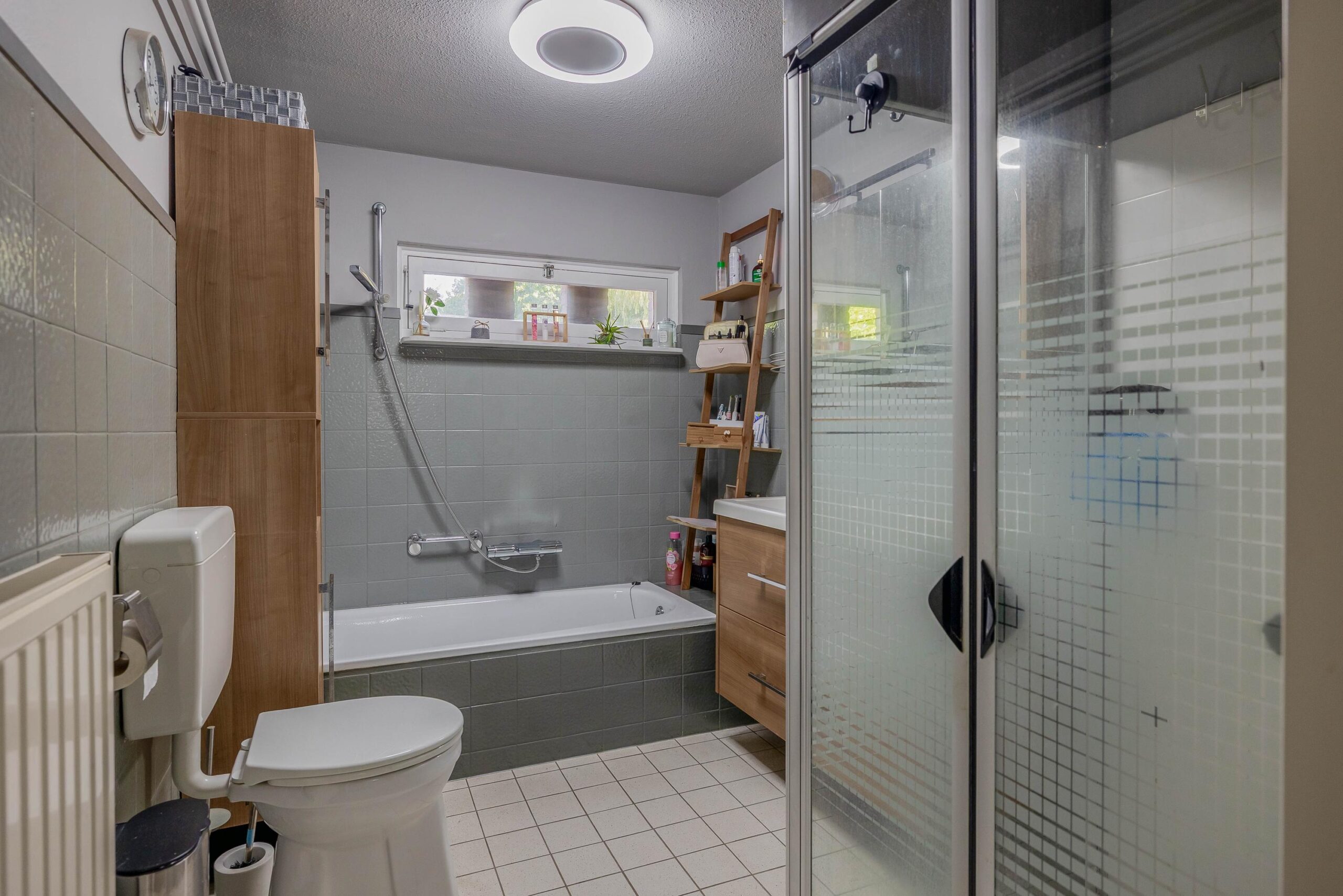 Eerste verdieping: De overloop geeft toegang tot 3 slaapkamers en de badkamer. De badkamer is grotendeels betegeld en uitgerust met een badkamermeubel met 2 wastafels, toilet, ligbad, douche en een te openen raam. De slaapkamers zijn allen afgewerkt met stucwerk en behangwanden, spuitwerk plafond en laminaatvloer. Alle kamers zijn voorzien van draai-/kiepramen.