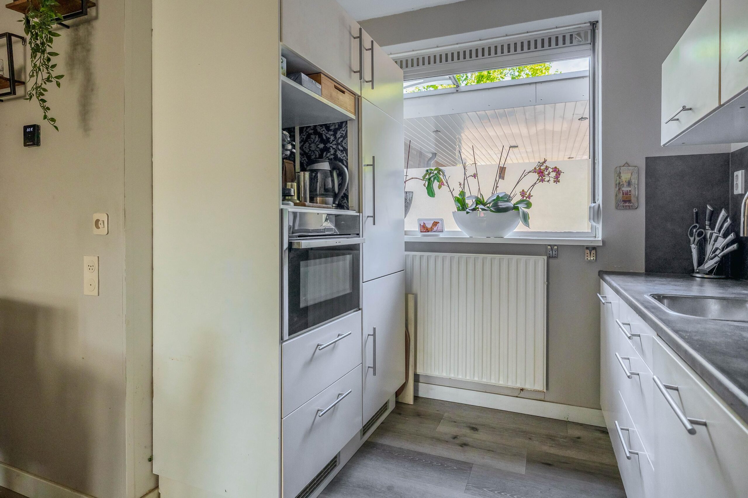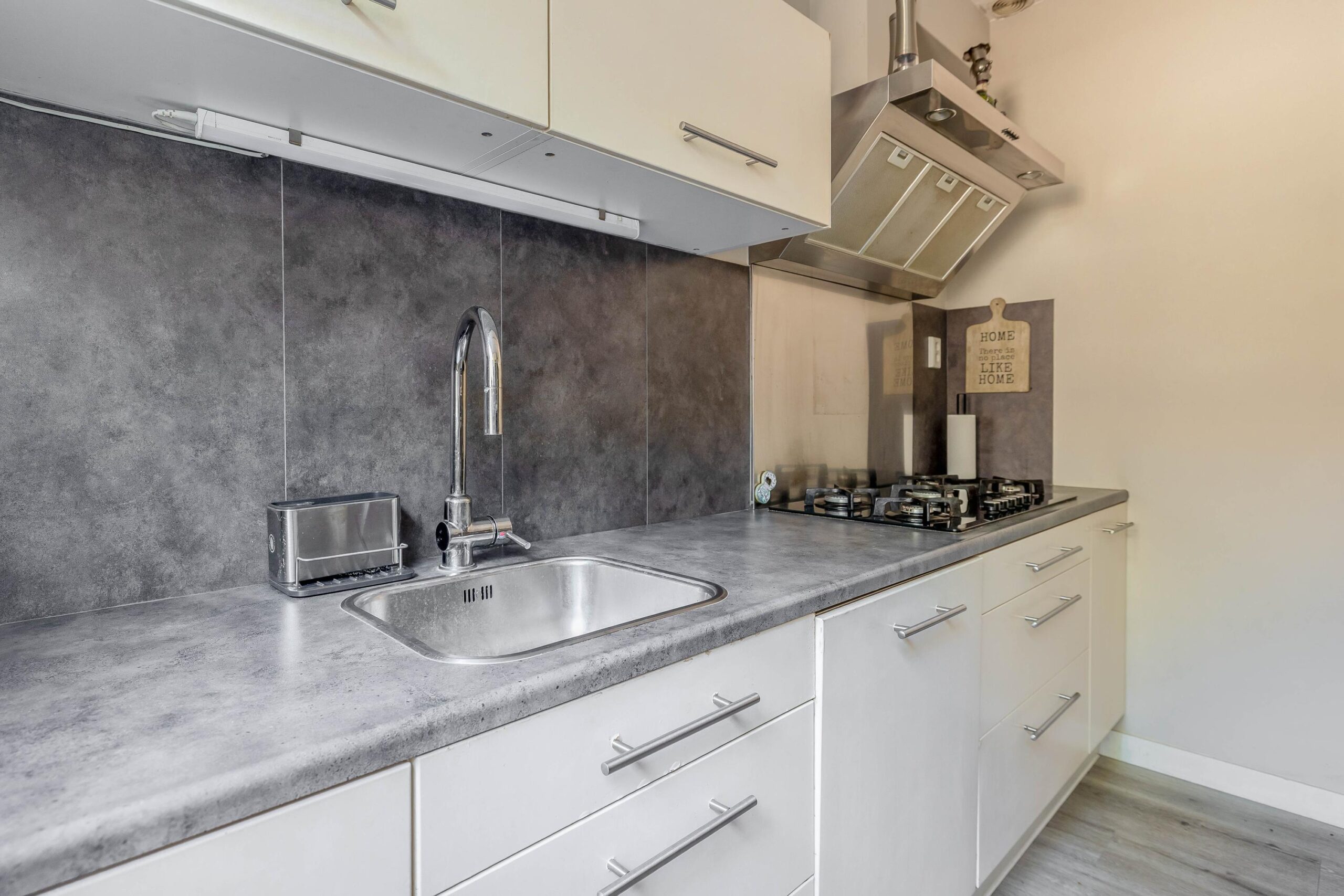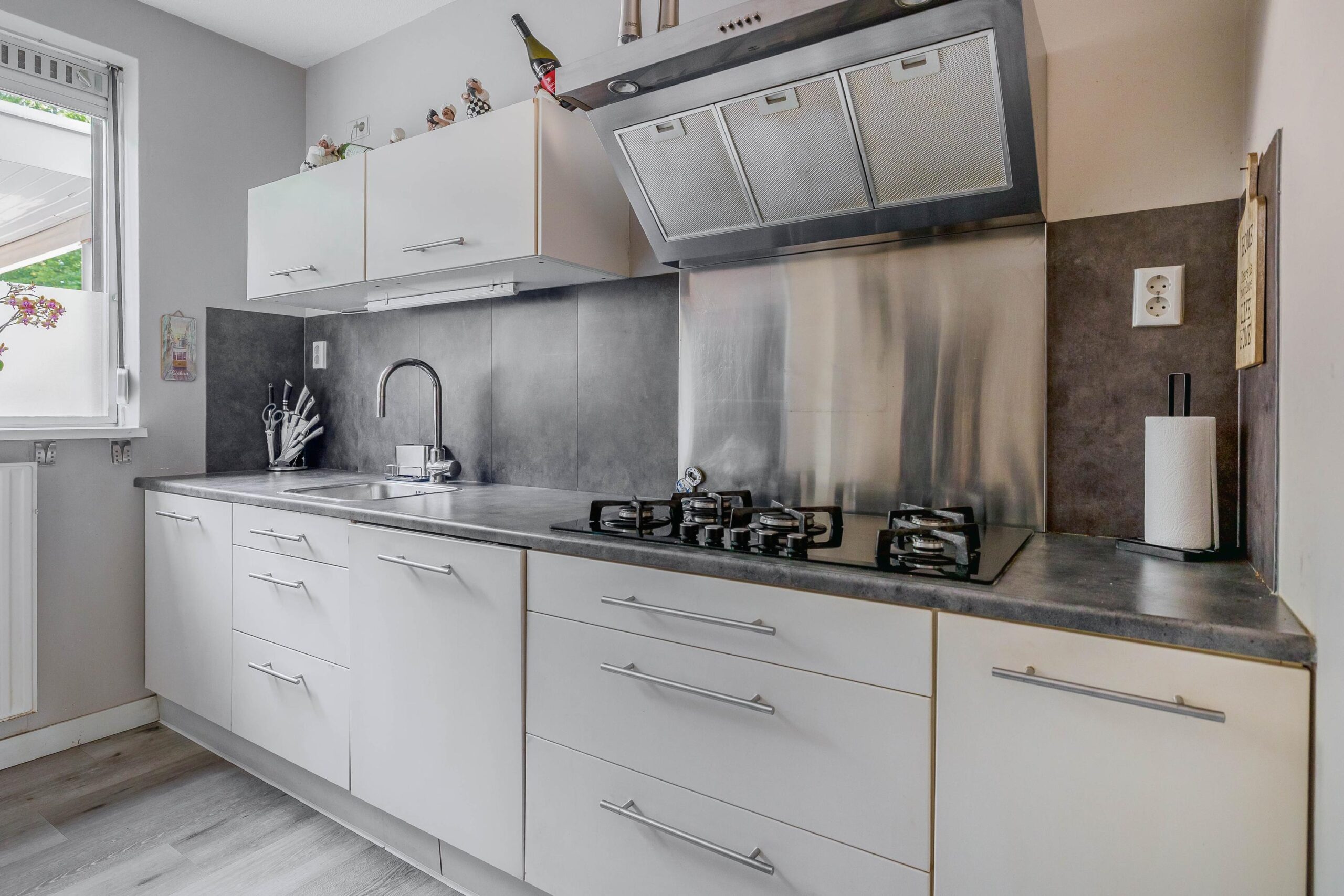 Begane grond: Middels een overdekte entree komt u in de hal. Hier bevindt zich de meterkast en de toiletruimte. De hal biedt toegang tot de leefruimte. De halfopen keuken is gesitueerd aan de voorzijde en beschikt over een recht keukenmeubel met boven- en onderkasten, een spoelbak, 5-pits gaskookplaat, afzuigkap, combi-oven, koelkast en een vaatwasser. De woonkamer is prettig ruim en voorzien van laminaatvloer en decoratief wandbehang. Openslaande deuren geven toegang tot de tuin en de grote raampartijen zorgen voor veel natuurlijk licht in de ruimte. Verder bevindt zich in de woonkamer de trapopgang naar de eerste verdieping.