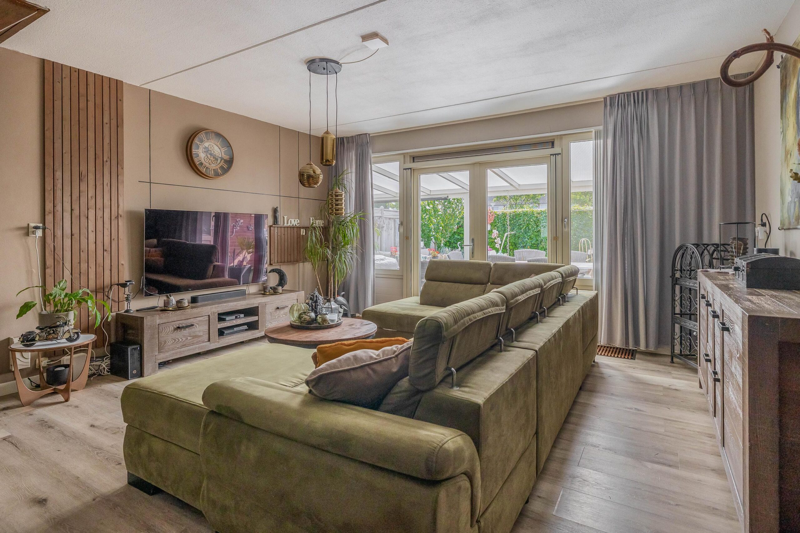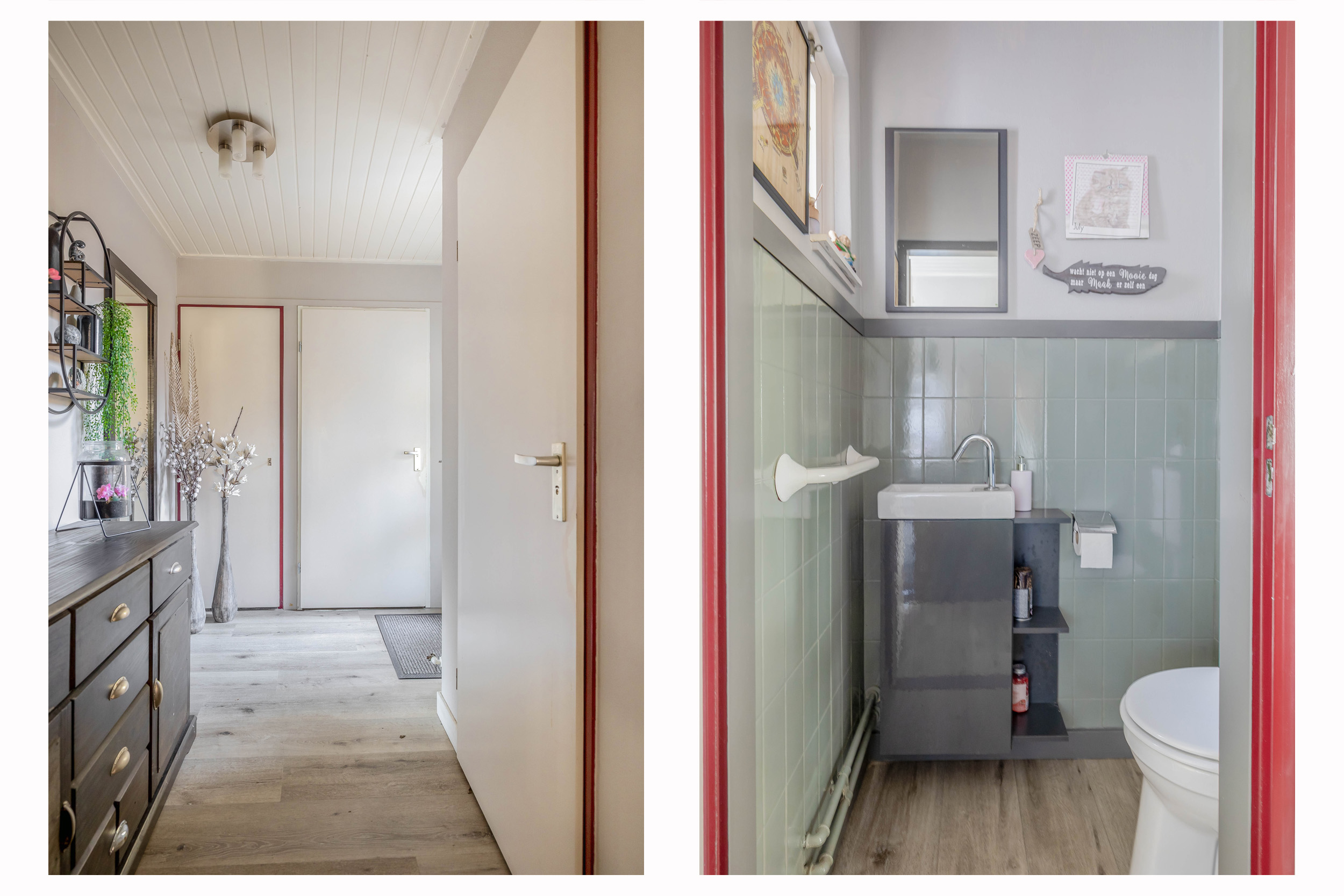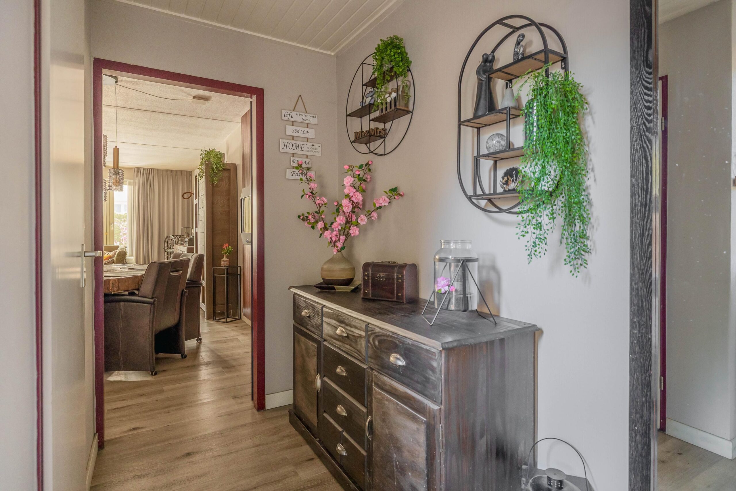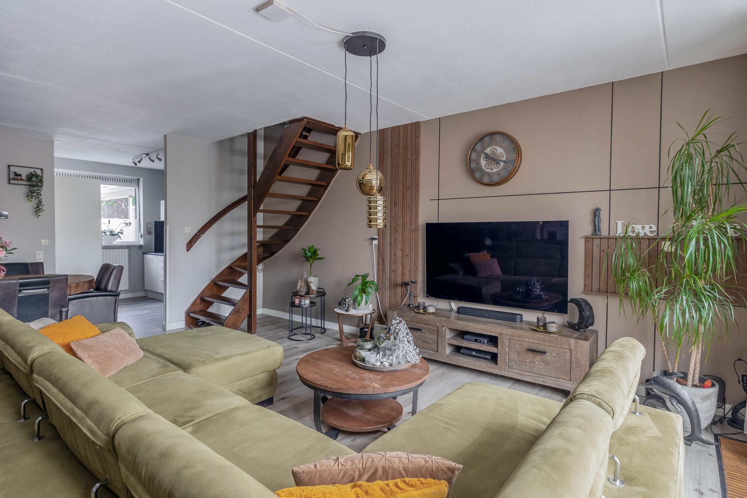 Begane grond: Middels een overdekte entree komt u in de hal. Hier bevindt zich de meterkast en de toiletruimte. De hal biedt toegang tot de leefruimte. De halfopen keuken is gesitueerd aan de voorzijde en beschikt over een recht keukenmeubel met boven- en onderkasten, een spoelbak, 5-pits gaskookplaat, afzuigkap, combi-oven, koelkast en een vaatwasser. De woonkamer is prettig ruim en voorzien van laminaatvloer en decoratief wandbehang. Openslaande deuren geven toegang tot de tuin en de grote raampartijen zorgen voor veel natuurlijk licht in de ruimte. Verder bevindt zich in de woonkamer de trapopgang naar de eerste verdieping.
