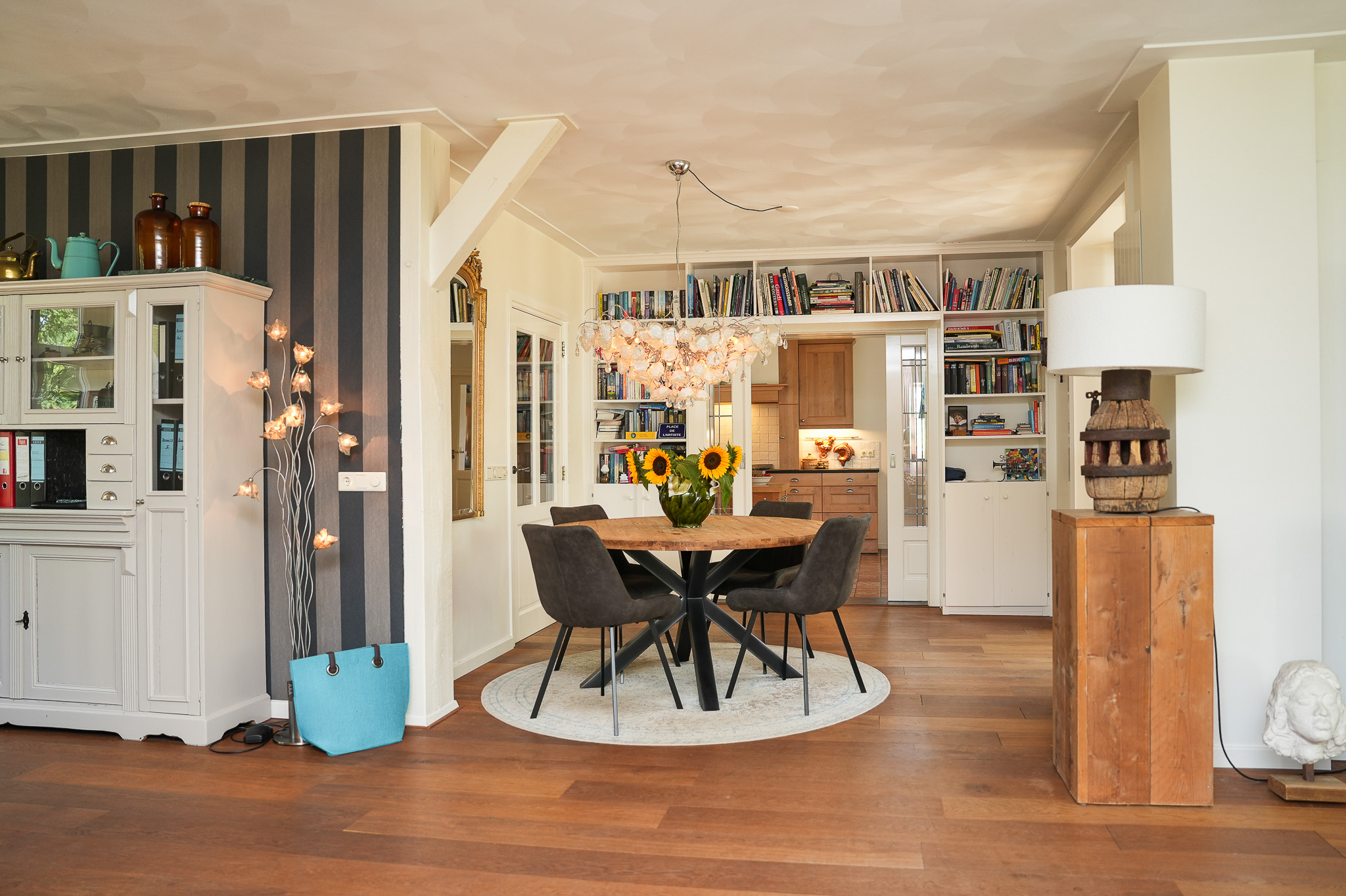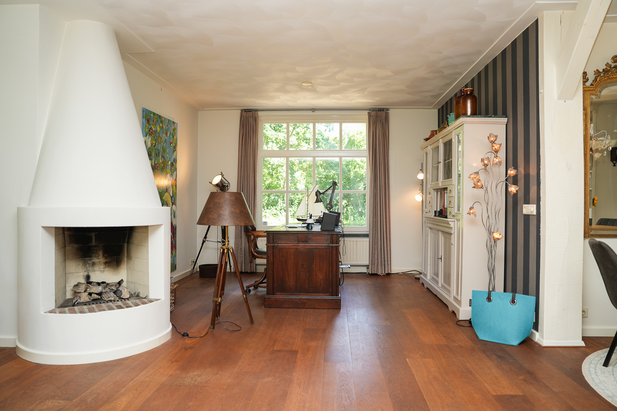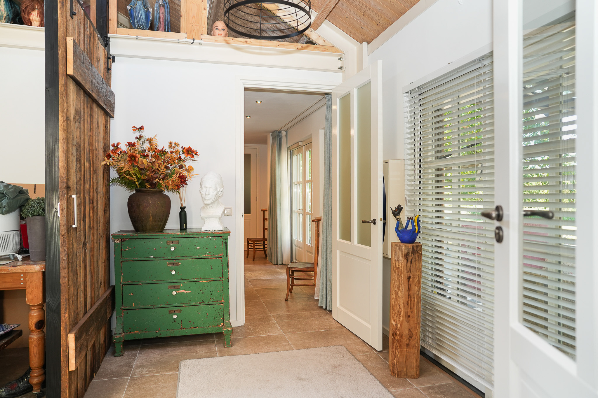 Begane grond: Bij binnenkomst wordt u verwelkomd in een stijlvolle hal met jonge voordeur, garderobenis, meterkast en waterontharder. De afwerking is van hoog niveau: strak stucwerk, een prachtige eikenhouten vloer en een gevoel van ruimte en licht. De royale woonkamer is een toonbeeld van elegantie, met een sfeervolle gashaard en dubbele houten schuifpui naar de tuin. Via en-suite deuren bereikt u enerzijds de riante keuken en anderzijds de prachtige serre. De serre is een volwaardige leefruimte, compleet met vloerverwarming, gashaard, isolatie, elektrische dakramen en een indrukwekkende harmonicapui die volledig geopend kan worden. De keuken is een culinair paradijs: massief houten kasten, een zwart granieten werkblad en plaats voor een royale eettafel. Hier vindt u onder andere een Boretti-fornuis met dubbele oven, afzuigkap, vaatwasser, koelkast en dubbele spoelbak. Aansluitend bevindt zich de praktische bijkeuken met het toilet (vrijhangend), fonteintje, provisiekast met CV-installatie, aparte kast voor witgoed, gootsteen en toegang tot zowel de serre als de oprit. Daarnaast vindt u op de begane grond een veelzijdige kamer die dienst kan doen als speel-, werk- of slaapkamer, compleet met vaste kasten, openslaande tuindeuren en vloerverwarming. De moderne badkamer (2023) is voorzien van een vrijhangend toilet, een badkamermeubel met dubbele wastafel en een inloopdouche. Verder is er een ruim atelier met hoge nok en twee Velux-dakramen, bereikbaar via openslaande deuren, een inspirerende plek die ook uitstekend kan fungeren als tweede woonkamer. Tot slot heeft de woning een royale hobbyruimte, uitgerust met twee boilers, een warmtepomp, openslaande deuren en een gootsteen. Middels een trap is een grote bergzolder bereikbaar.