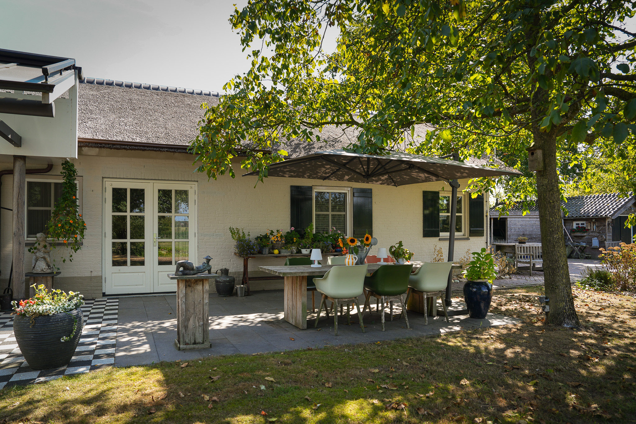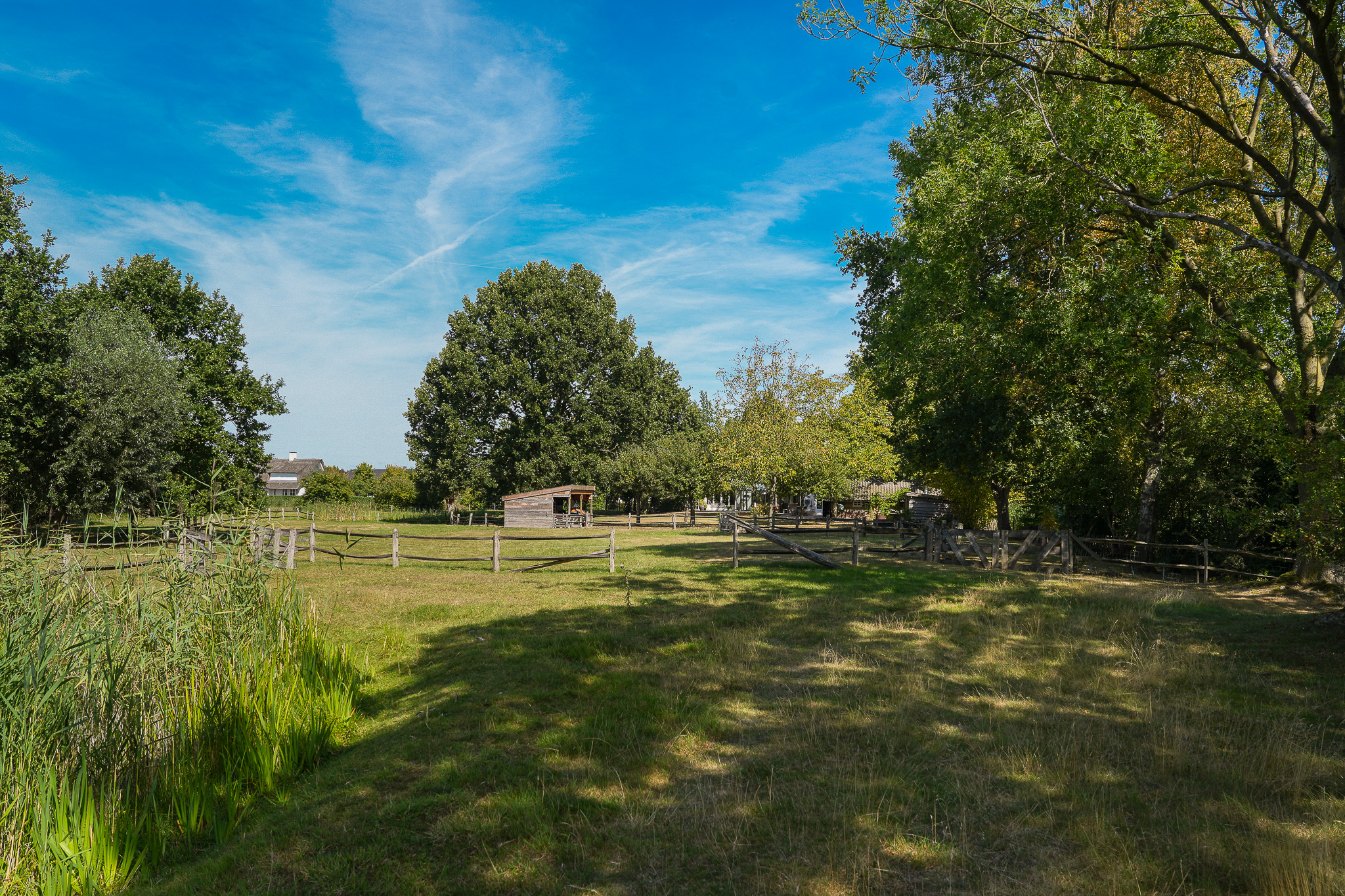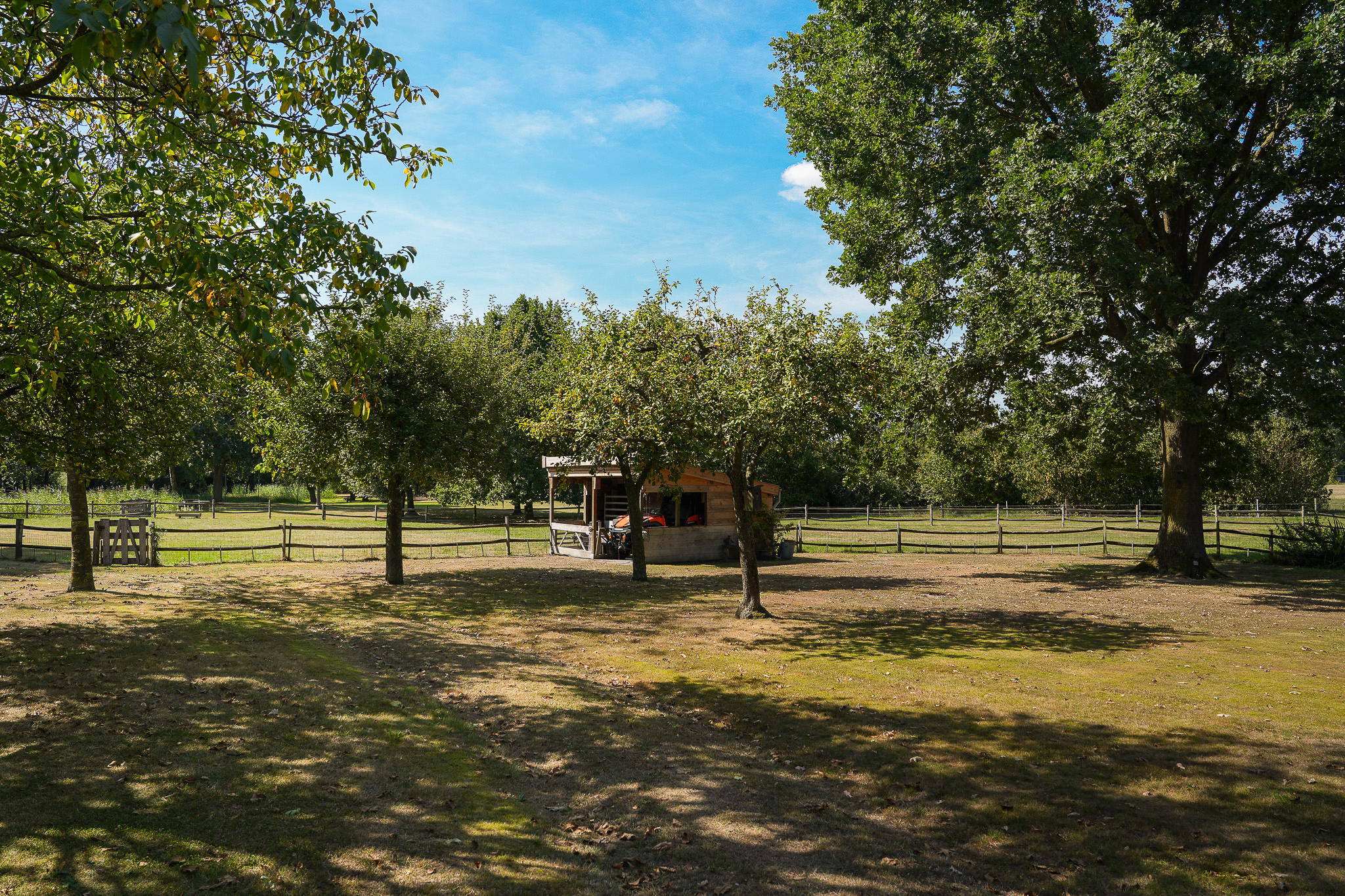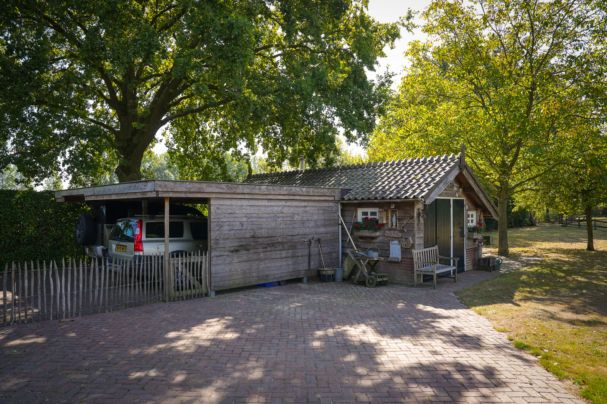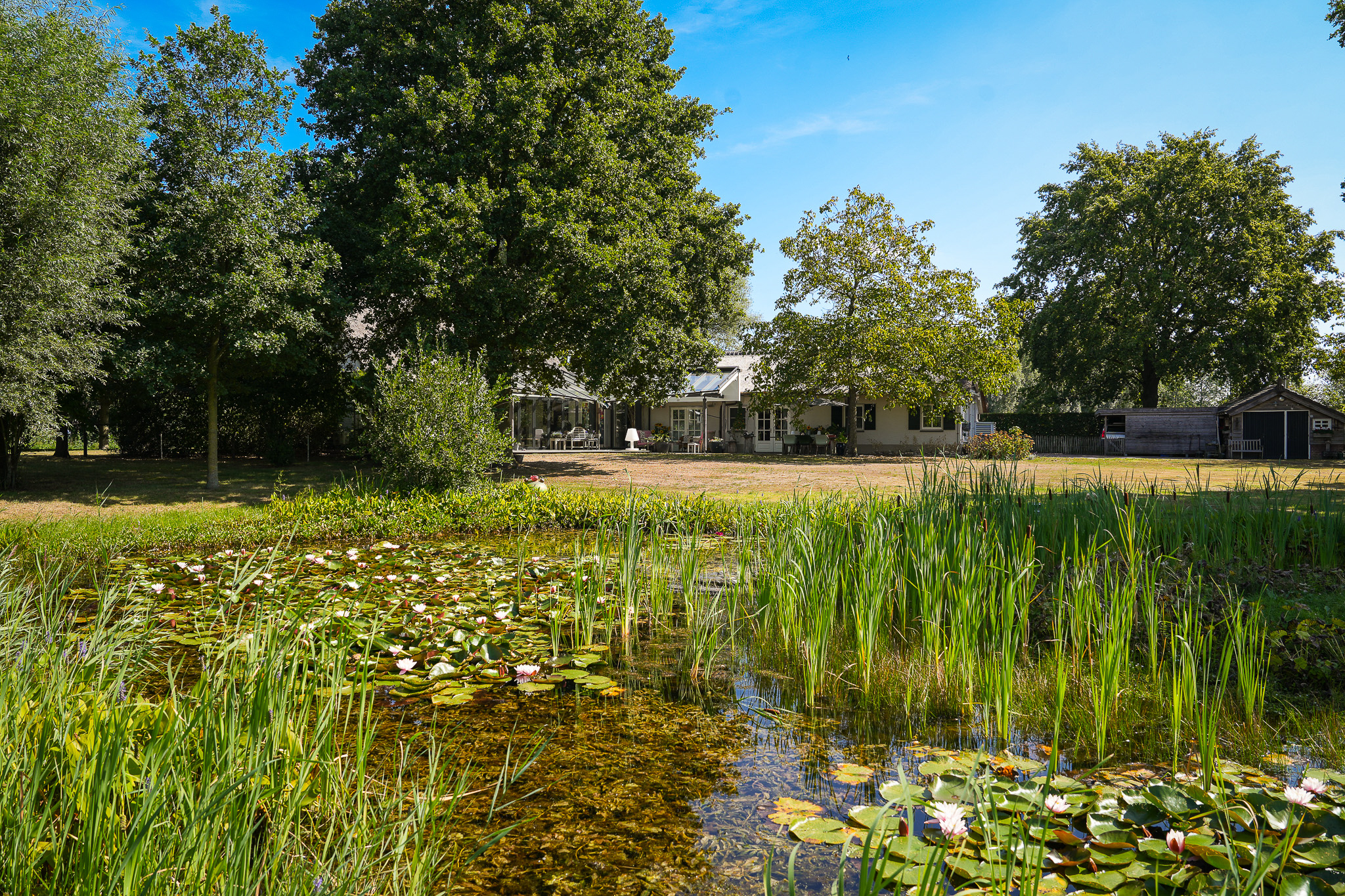 De fraai aangelegde tuin rondom de woning vormt het perfecte decor voor het genieten van het buitenleven in al zijn facetten. Een royaal gazon, twee grote vijvers, volwassen bomen, kleurrijke borders en vaste beplanting zorgen voor een parkachtige sfeer. Het uitzicht is weids en adembenemend, met overal groen om u heen. In de tuin bevindt zich bovendien een charmant houten tuinhuis dat is voorzien van een kachel, twee paar openslaande deuren en zelfs een eigen toilet, perfect als ontspanningsruimte. Aansluitend aan dit tuinhuis bevindt zich een carport met ruimte voor twee auto’s. Verder treft u een sfeervol schapenverblijf met daarboven een prachtige blokhut, evenals een bergschuur met overkapping, ideaal voor het opbergen van tuingereedschap of andere materialen.