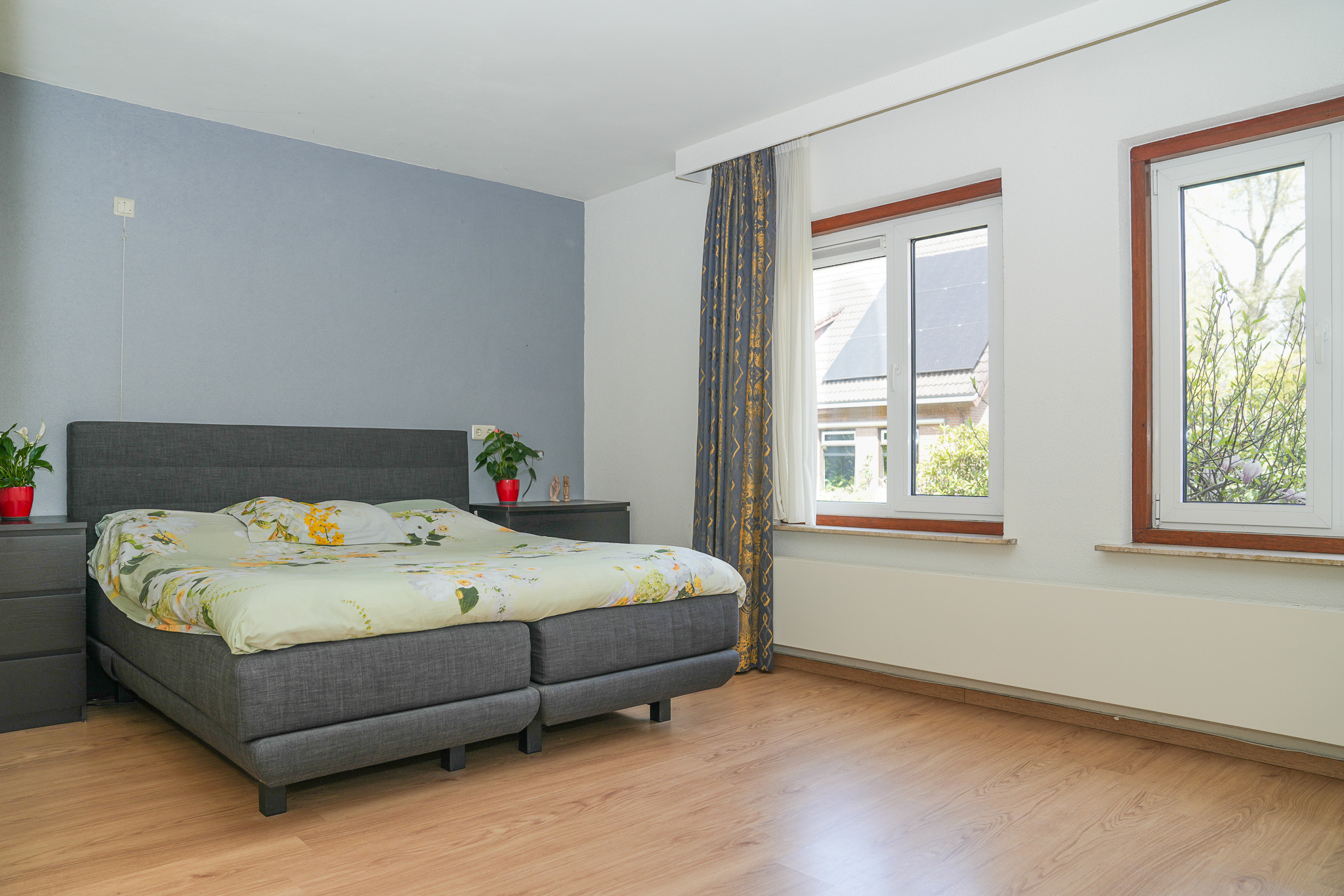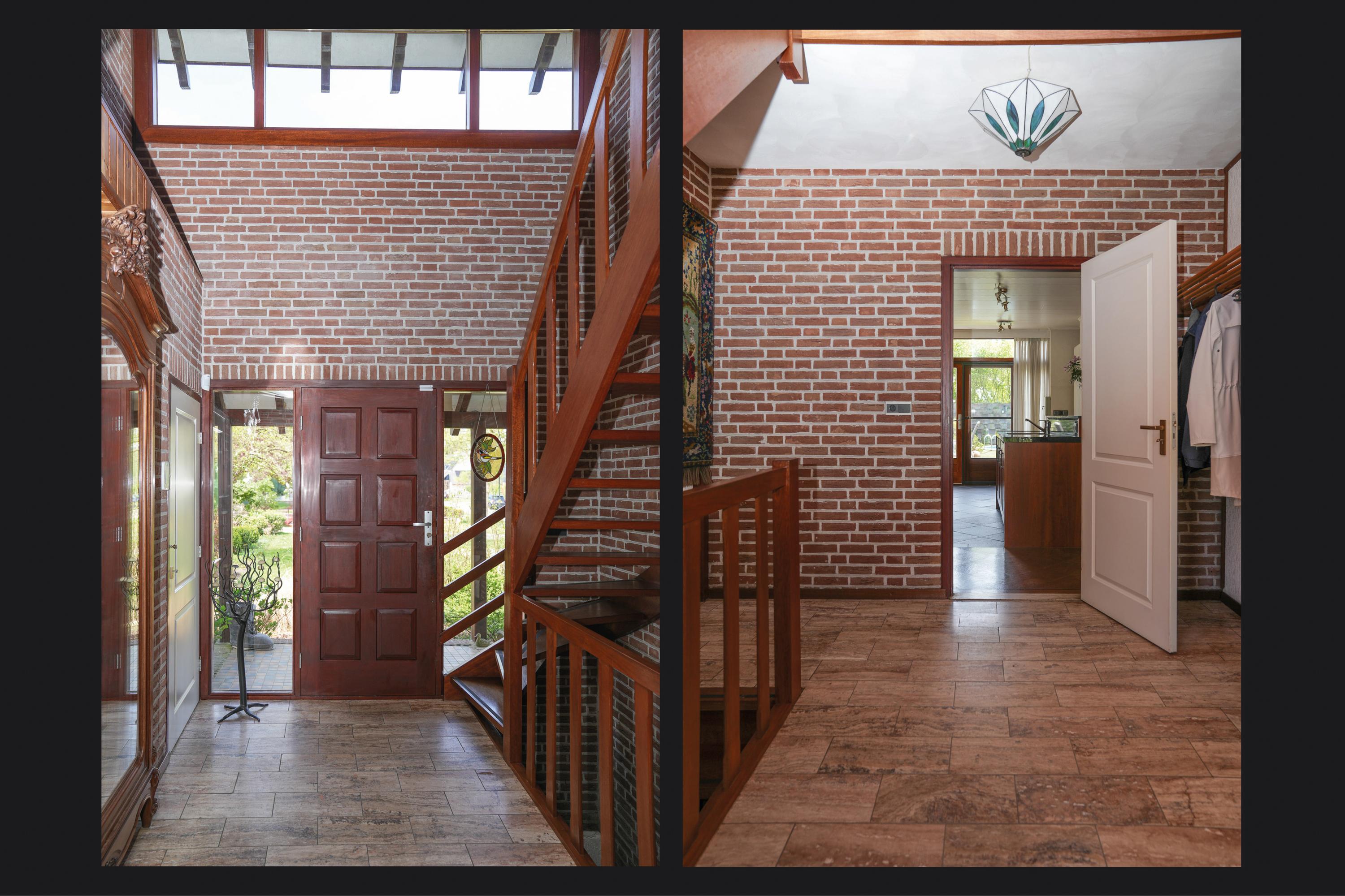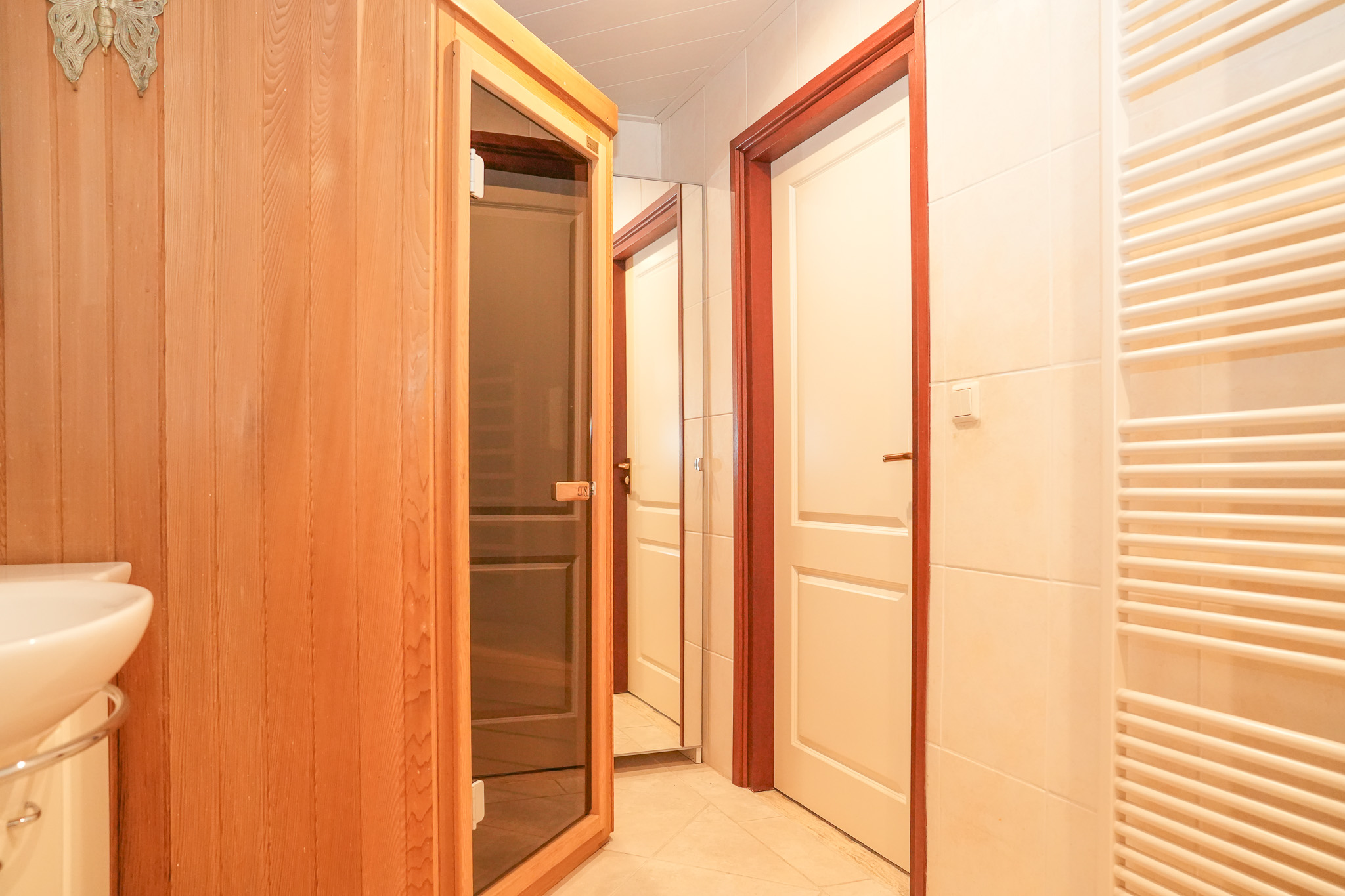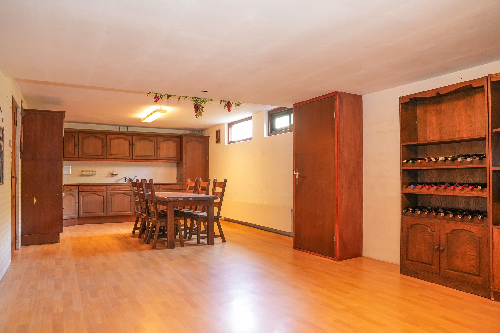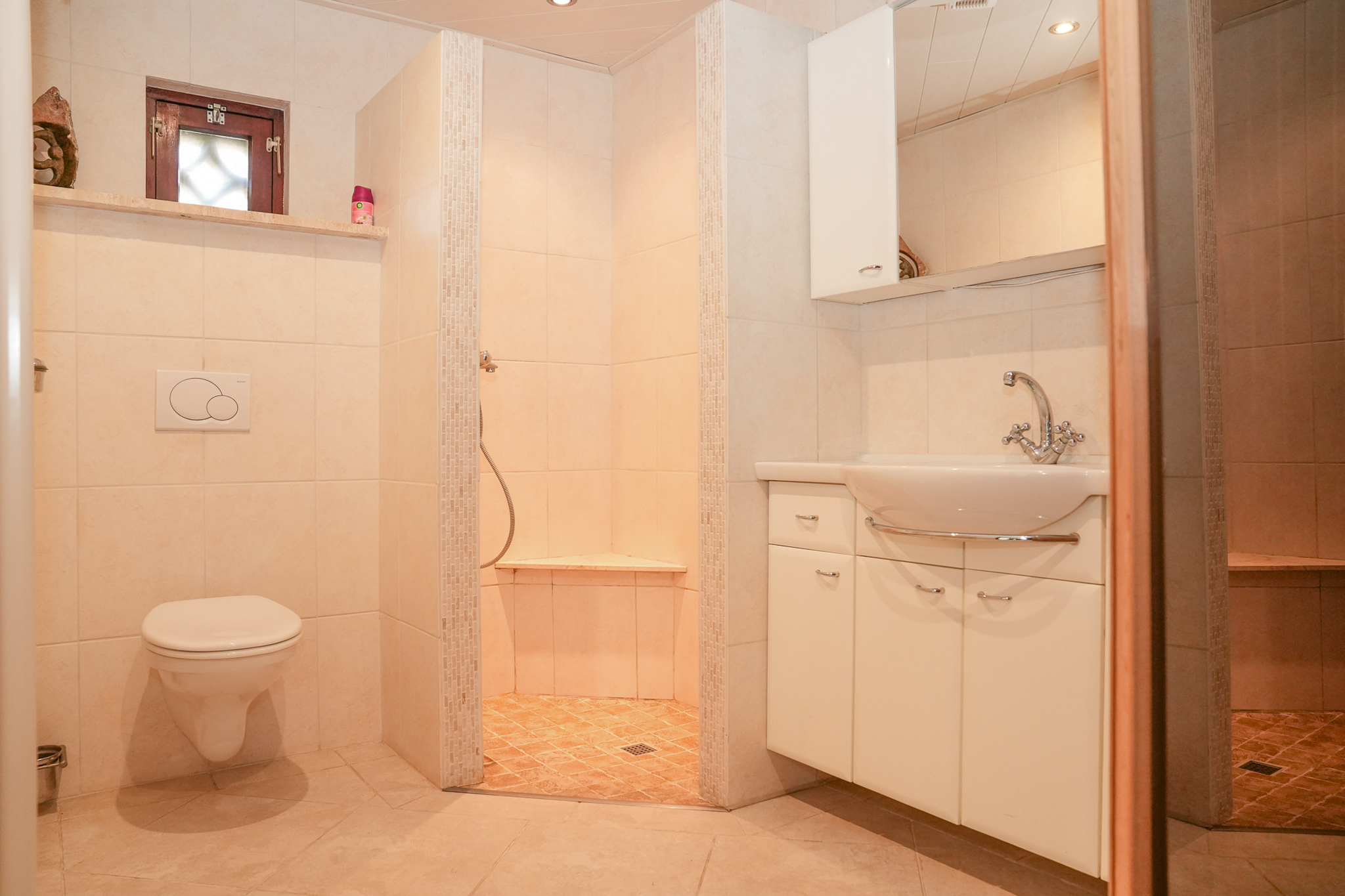Begane grond: Middels het overdekte entree komt u binnen in de statige hal met de meterkast (12 groepen, krachtstroom en 3 aardlekschakelaars) en heeft u toegang tot de grote vide en de kelder. De L-vormige woonkamer is afgewerkt met stucwerk op de wanden en het plafond en een sfeervolle parketvloer. De woonkamer is voorzien van een pelletkachel en airconditioning. Aansluitend komt u in een riante serre met lichtkoepel en een bergkast. De serre is voorzien van veel lichtinval en een schuifpui naar de tuin. De open keuken is voorzien van een recht keukenmeubel met spoeleiland, veel werk- en kastruimte, laden en inbouwapparatuur: een inductiekookplaat, afzuigkap, combi-oven, koelkast en een vaatwasser op hoogte. Het werkblad is uitgevoerd in kras- en hittebestendig graniet. Aansluitend komt u in een tussenportaal met de toiletruimte, witgoedaansluitingen, een voorraadkast en plaats voor een vriezer. Verder bevindt zich op de begane grond een slaapkamer en een badkamer, waardoor de woning levensloopbestendig is. De slaapkamer is afgewerkt met stucwerk op de wanden en het plafond, en een laminaatvloer. De badkamer is volledig betegeld en uitgerust met een badkamermeubel met wastafel, inbouwcloset, inloopdouche en een tweepersoons infrarood- en opgietsauna. De kelder is opgedeeld in meerdere ruimtes met elk een eigen functie. Eén gedeelte is sfeervol ingericht als bar, ideaal voor gezellige avonden of het ontvangen van gasten. Een ander deel doet dienst als kantoorruimte, perfect voor werken aan huis. Daarnaast is er een praktische opslagruimte aanwezig. Ook is hier de cv-installatie geplaatst. Dankzij de indeling en het gebruik van de kelder biedt deze verdieping verrassend veel extra leef- en werkruimte.