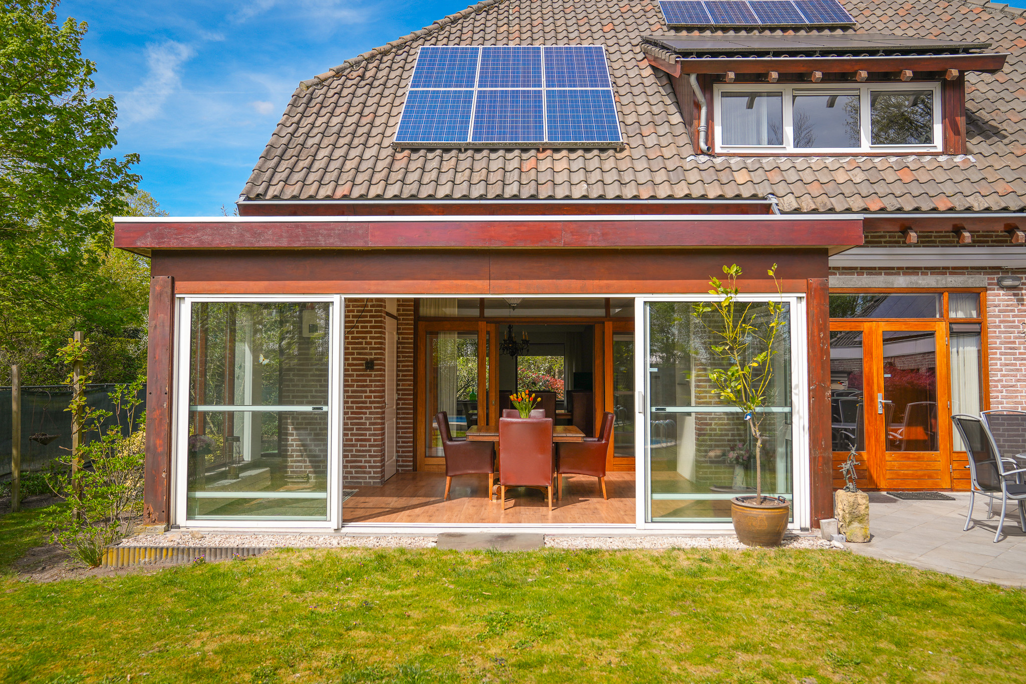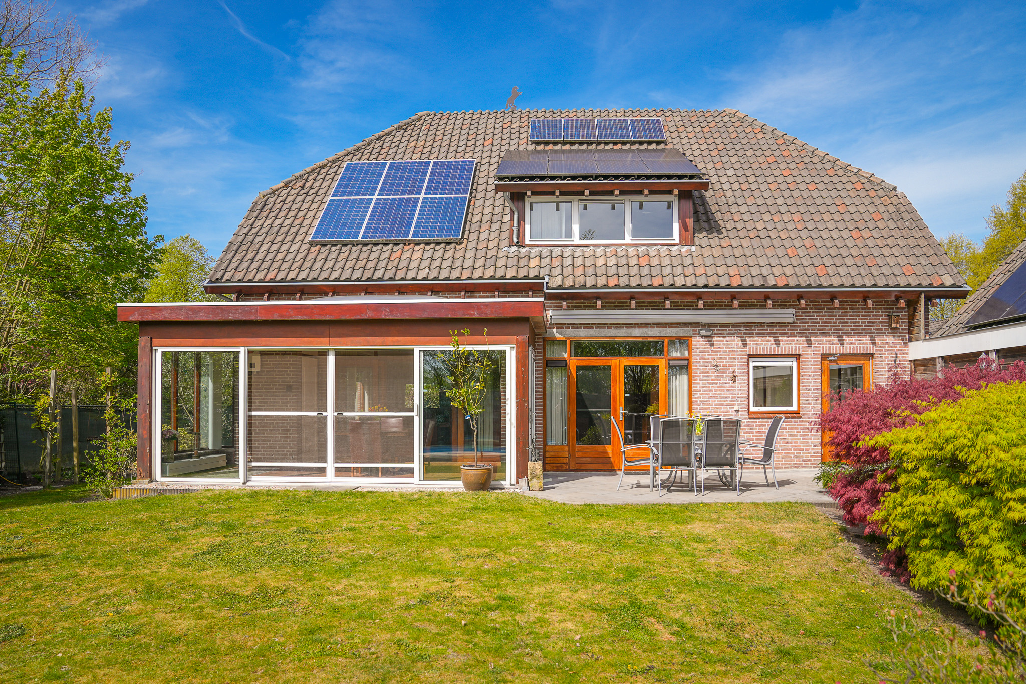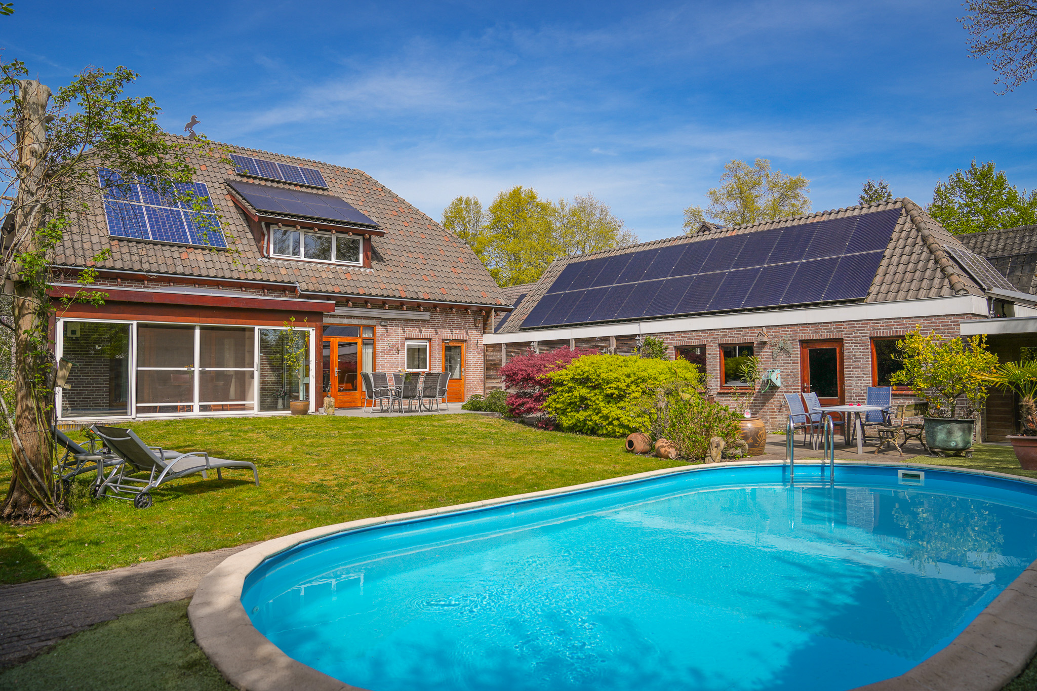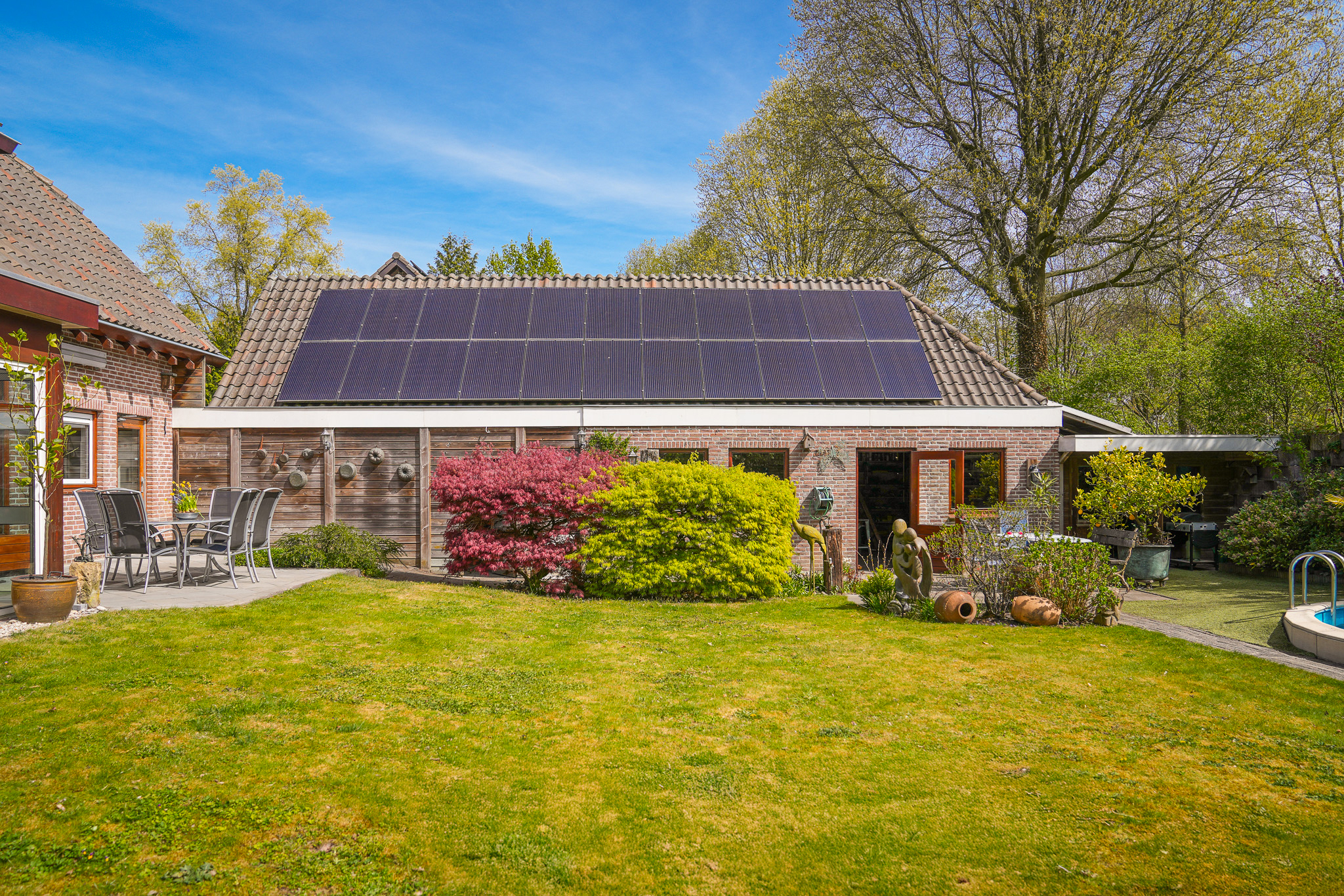 De woning beschikt rondom over een mooie grote tuin. Door de grootte van de tuin en de gunstige ligging met de achtertuin op het zuidoosten is er altijd een plekje in de zon te vinden. De tuin is fraai aangelegd met volwassen bomen en struiken, plantenborders, gazon en een terras. Ook vindt u hier een heerlijk zwembad en een gezellige overkapping waar u lange avonden kunt vertoeven. Achter in de tuin treft u een houten berging, voorzien van elektra. Aan de linkerzijde is een oprit met carport met plaats voor het parkeren van meerdere auto's. Vanaf de oprit heeft u direct toegang tot de garage, woning en achtertuin. Op het dak van de woning liggen maar liefst 44 zonnepanelen. Een gedeelte van het perceel wordt gepacht. Er zijn mogelijkheden deze af te kopen. Wij kunnen u dit toelichten.