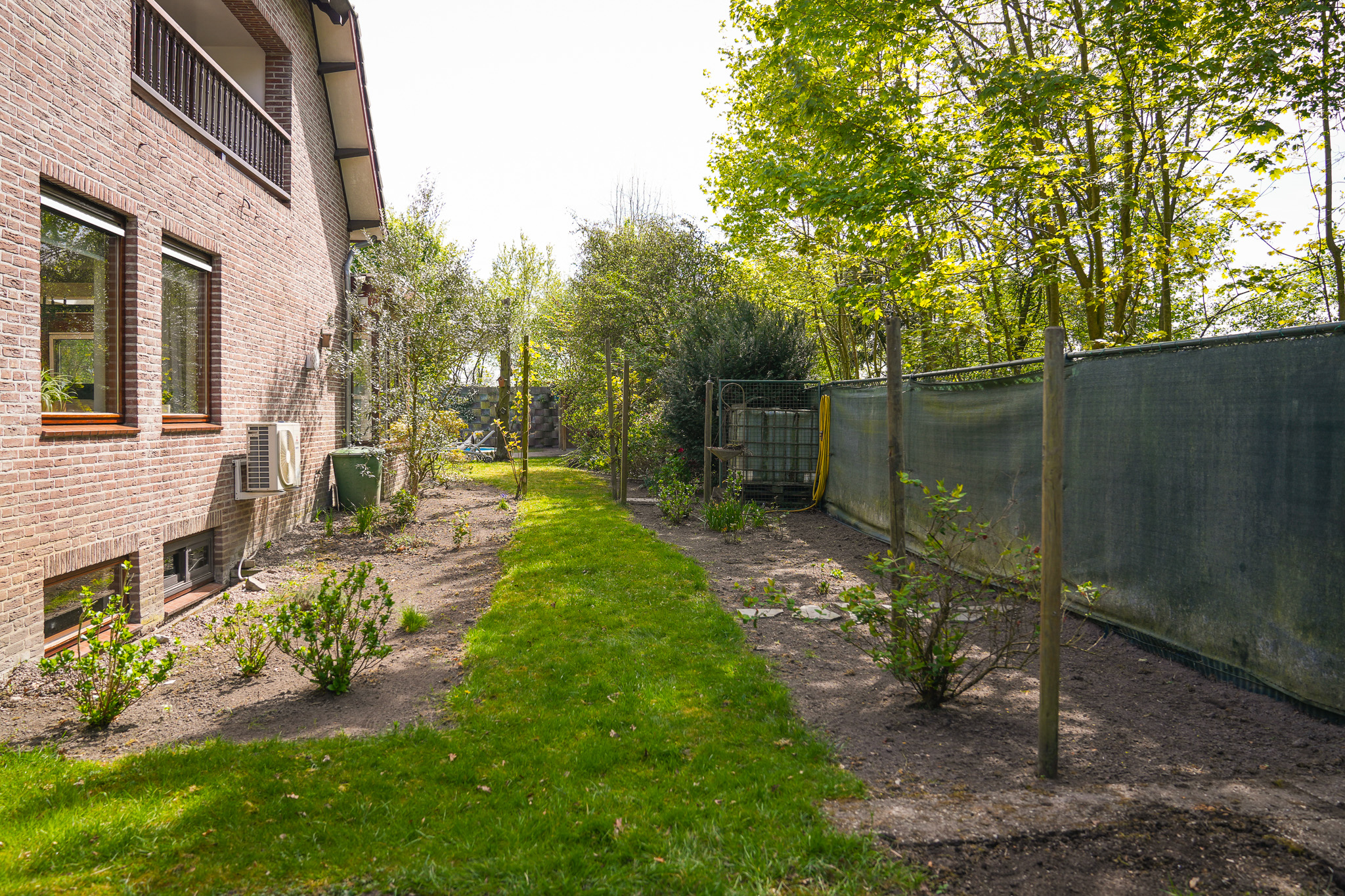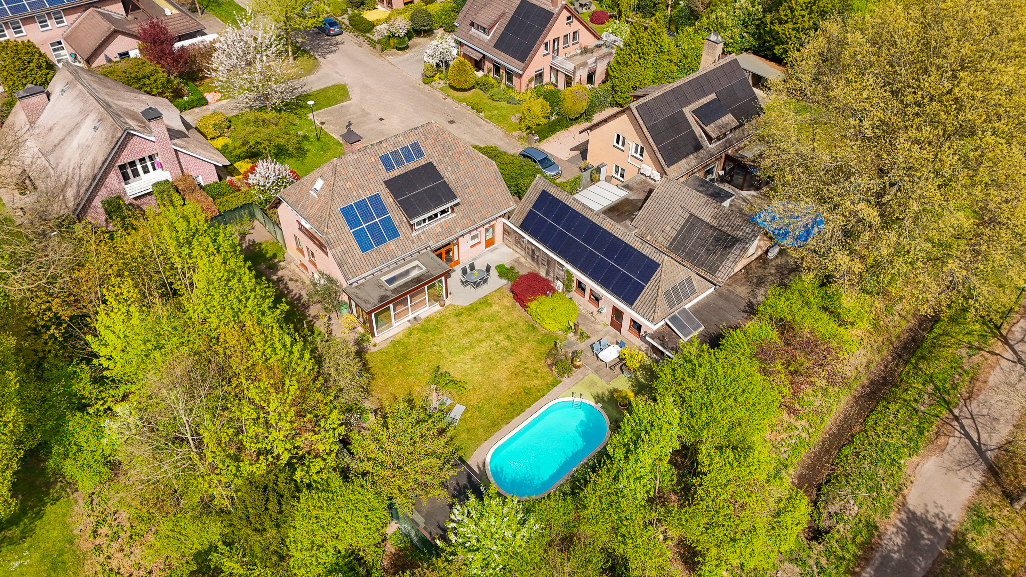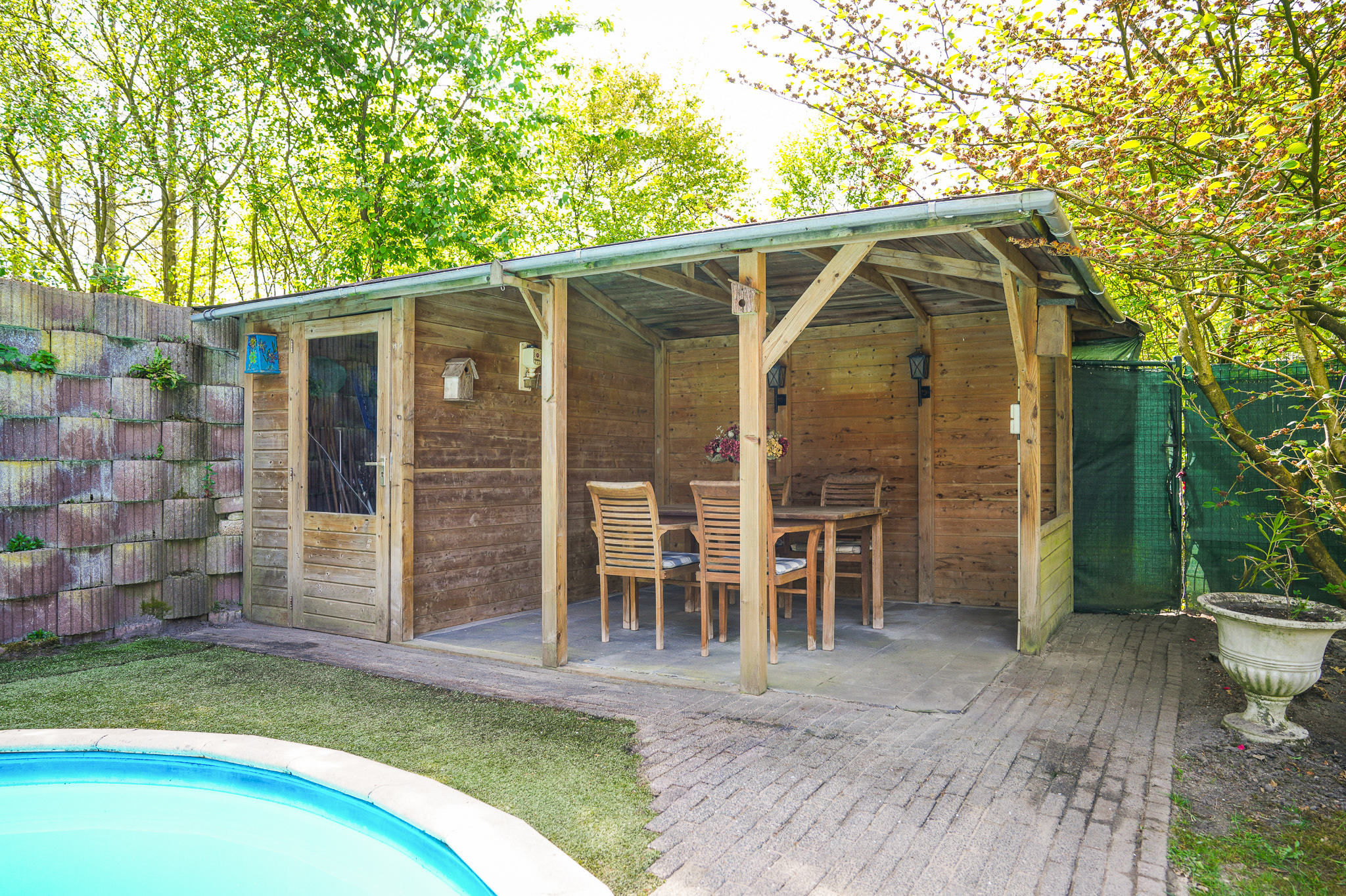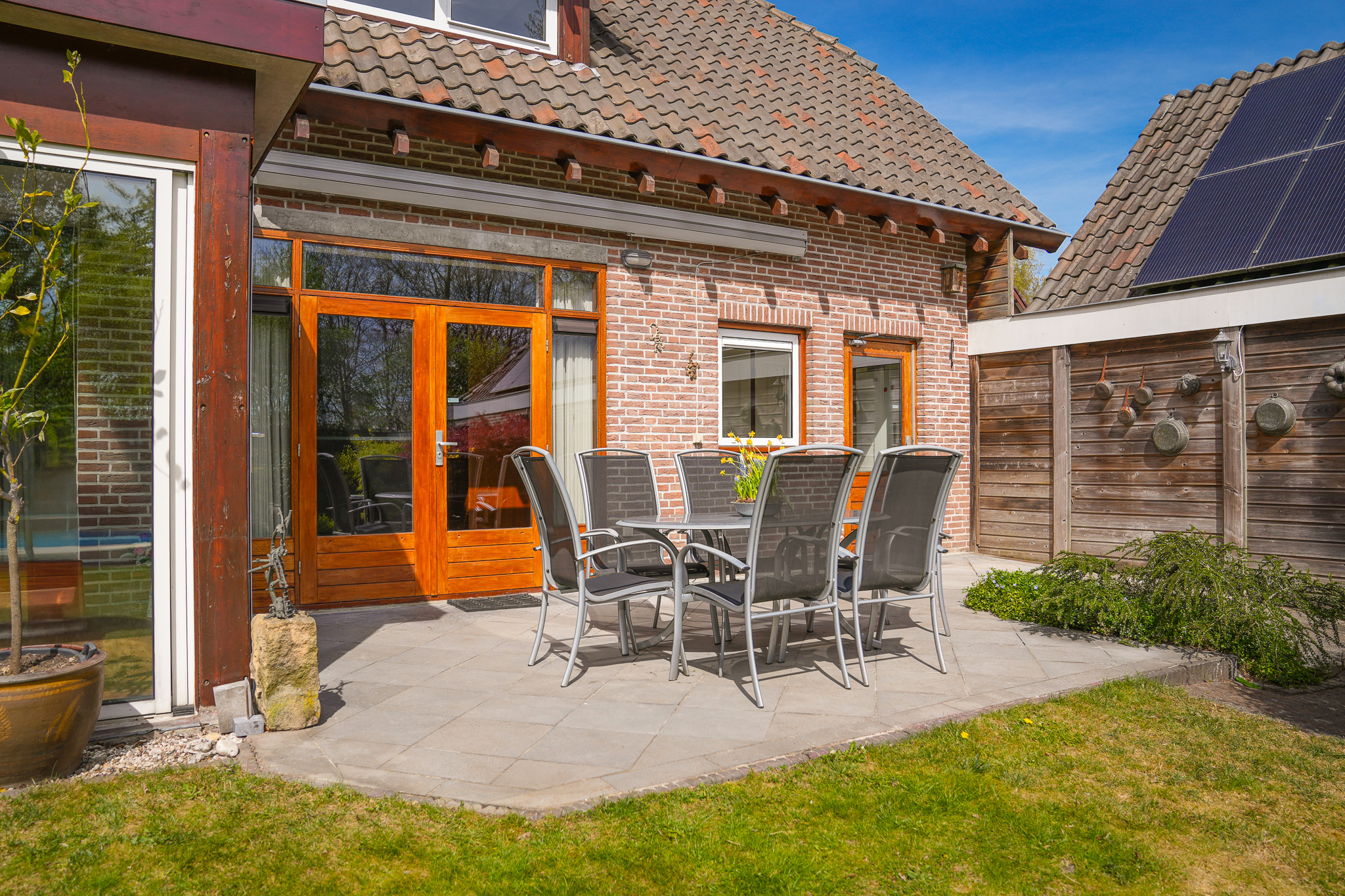 De woning beschikt rondom over een mooie grote tuin. Door de grootte van de tuin en de gunstige ligging met de achtertuin op het zuidoosten is er altijd een plekje in de zon te vinden. De tuin is fraai aangelegd met volwassen bomen en struiken, plantenborders, gazon en een terras. Ook vindt u hier een heerlijk zwembad en een gezellige overkapping waar u lange avonden kunt vertoeven. Achter in de tuin treft u een houten berging, voorzien van elektra. Aan de linkerzijde is een oprit met carport met plaats voor het parkeren van meerdere auto's. Vanaf de oprit heeft u direct toegang tot de garage, woning en achtertuin. Op het dak van de woning liggen maar liefst 44 zonnepanelen. Een gedeelte van het perceel wordt gepacht. Er zijn mogelijkheden deze af te kopen. Wij kunnen u dit toelichten.