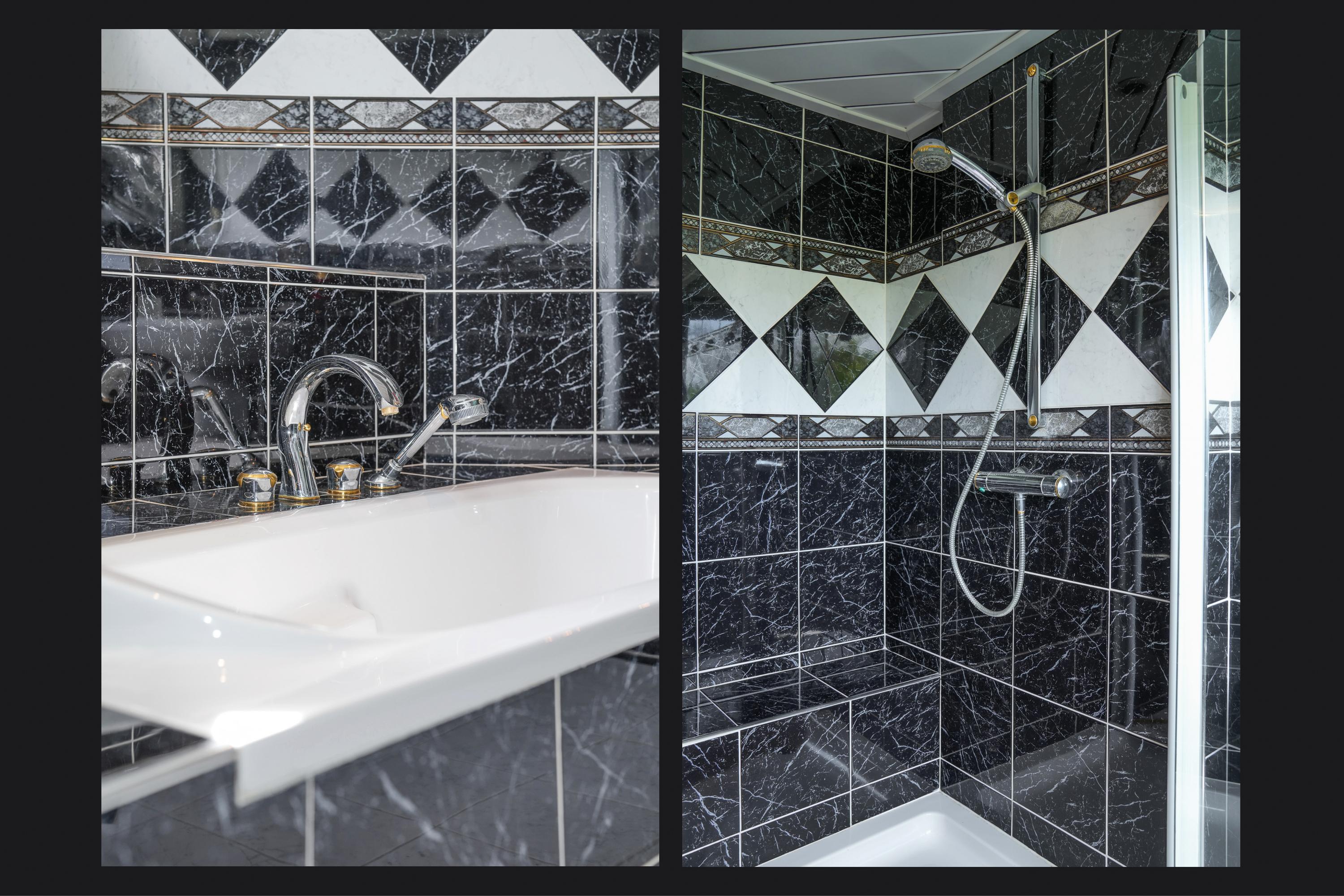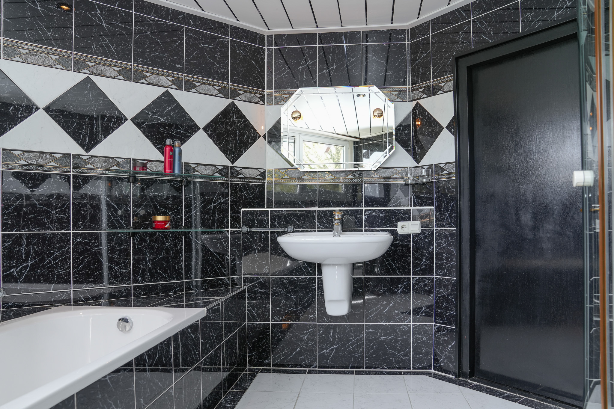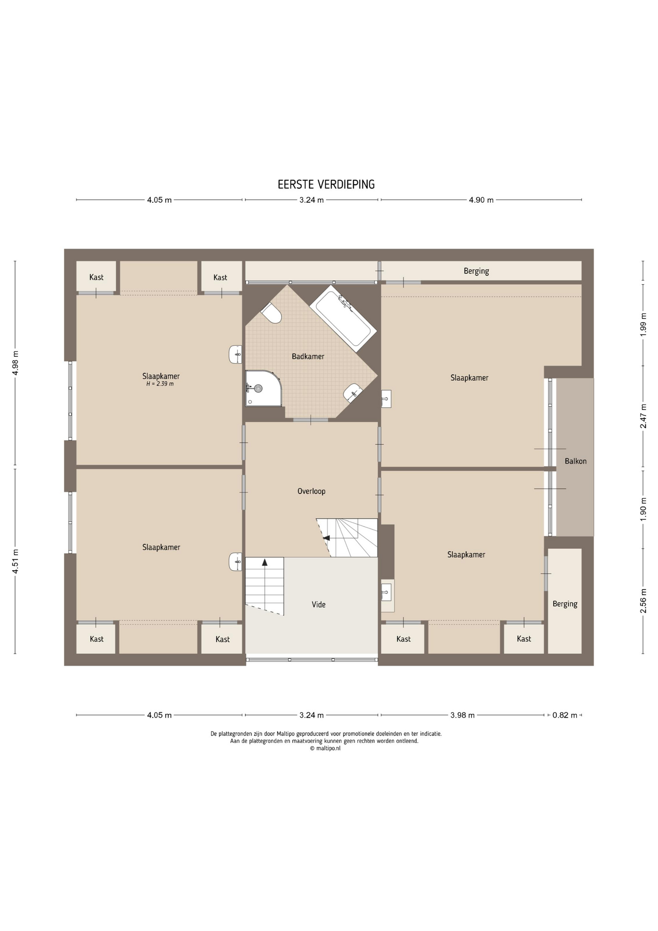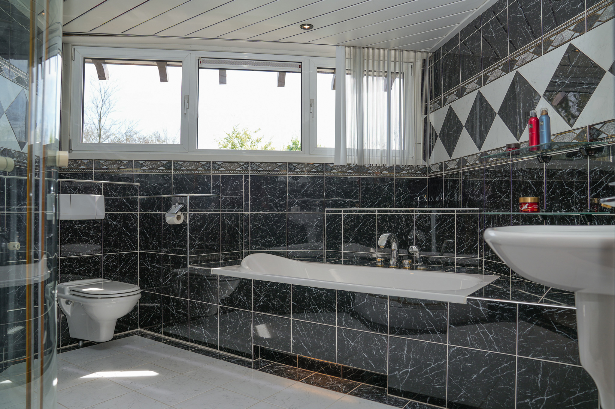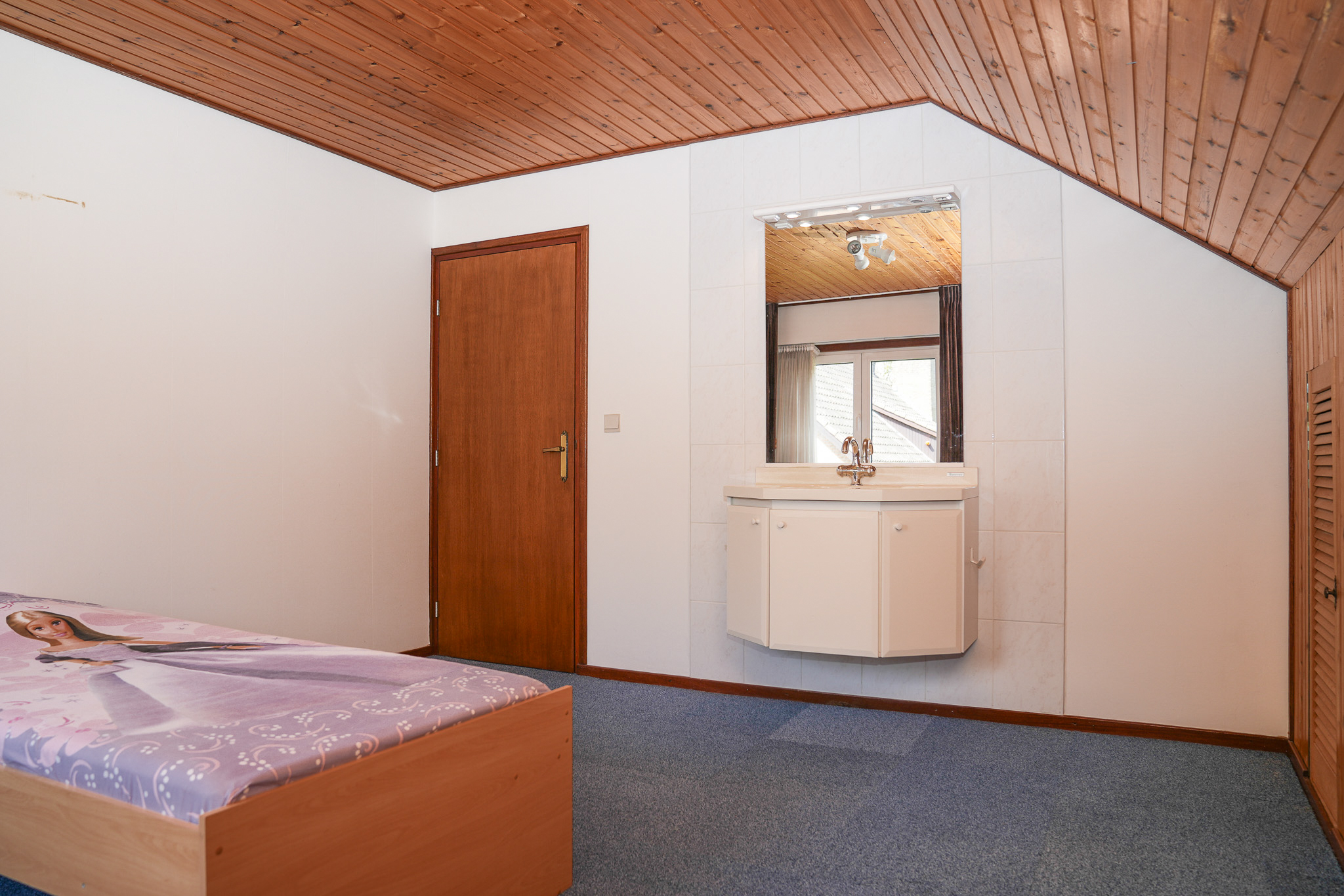 Eerste verdieping: Een grote vide geeft toegang tot vier ruime slaapkamers, elk voorzien van een eigen wastafel. Twee van de slaapkamers beschikken over een balkon. De tweede badkamer is afgewerkt met tegelvloer en -wanden, en beschikt over een inbouwtoilet, wastafel, douche, een comfortabel ligbad en 3 ramen (waarvan 2 te openen).
