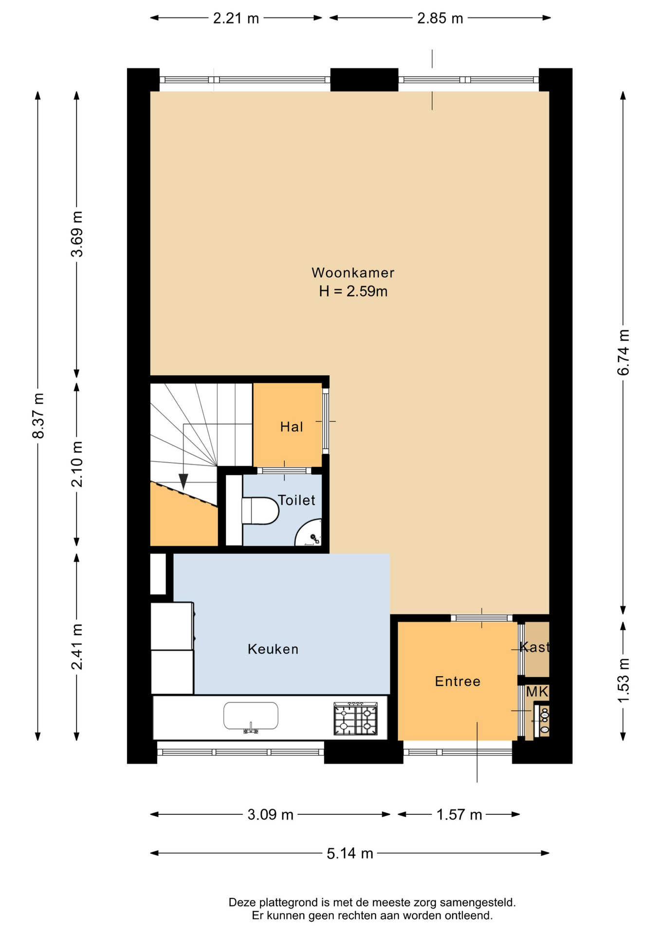 Begane grond: In de entree/hal tref je de meterkast. Vanuit de hal kom je in de keuken en woonkamer. De half-open keuken beschikt over een licht in hoekopgesteld keukenmeubel met veel werk- en bergruimte, 1½ spoelbak en diverse apparatuur: 4-pits gaskookstel, afzuigkap, koelkast, magnetron en een vaatwasser. Aansluitend komt u in de tuingerichte woonkamer. De woonkamer is voorzien van riante raampartijen die zorgen voor een fijne lichtinval. Middels een tuindeur heb je toegang tot de achtertuin. In een portaal in de woonkamer tref je de toiletruimte met wandcloset en fonteintje en de trapopgang naar de verdieping.
