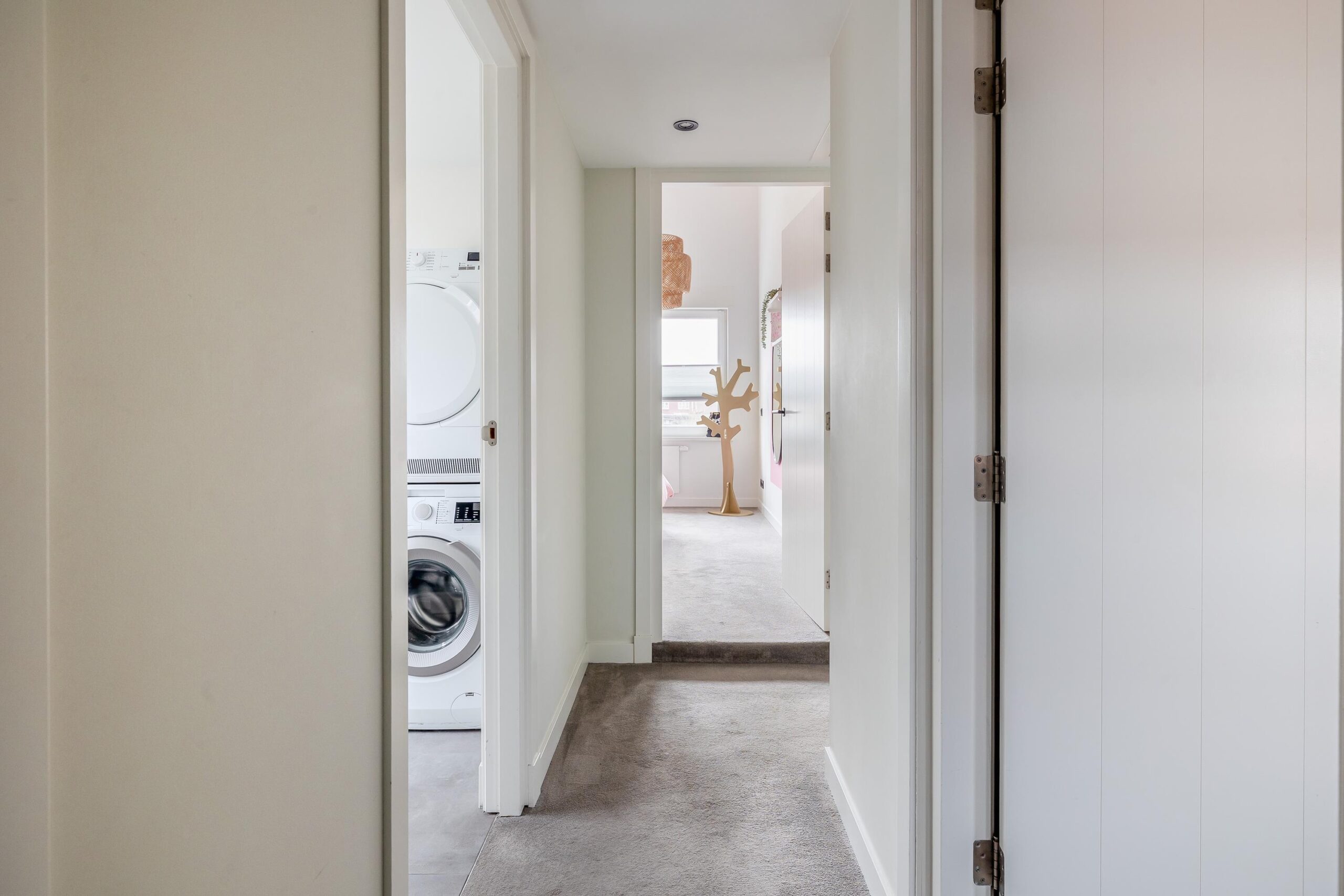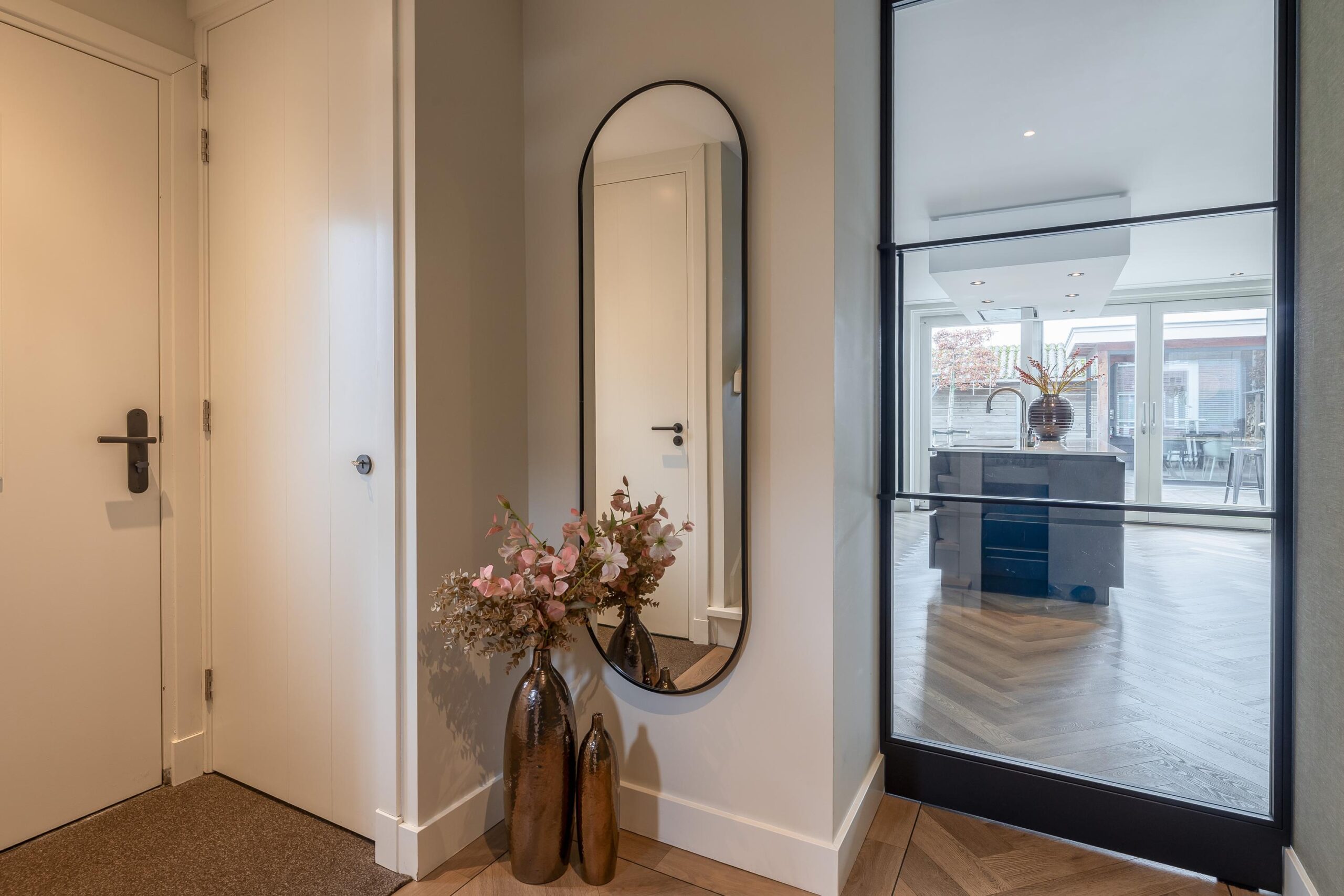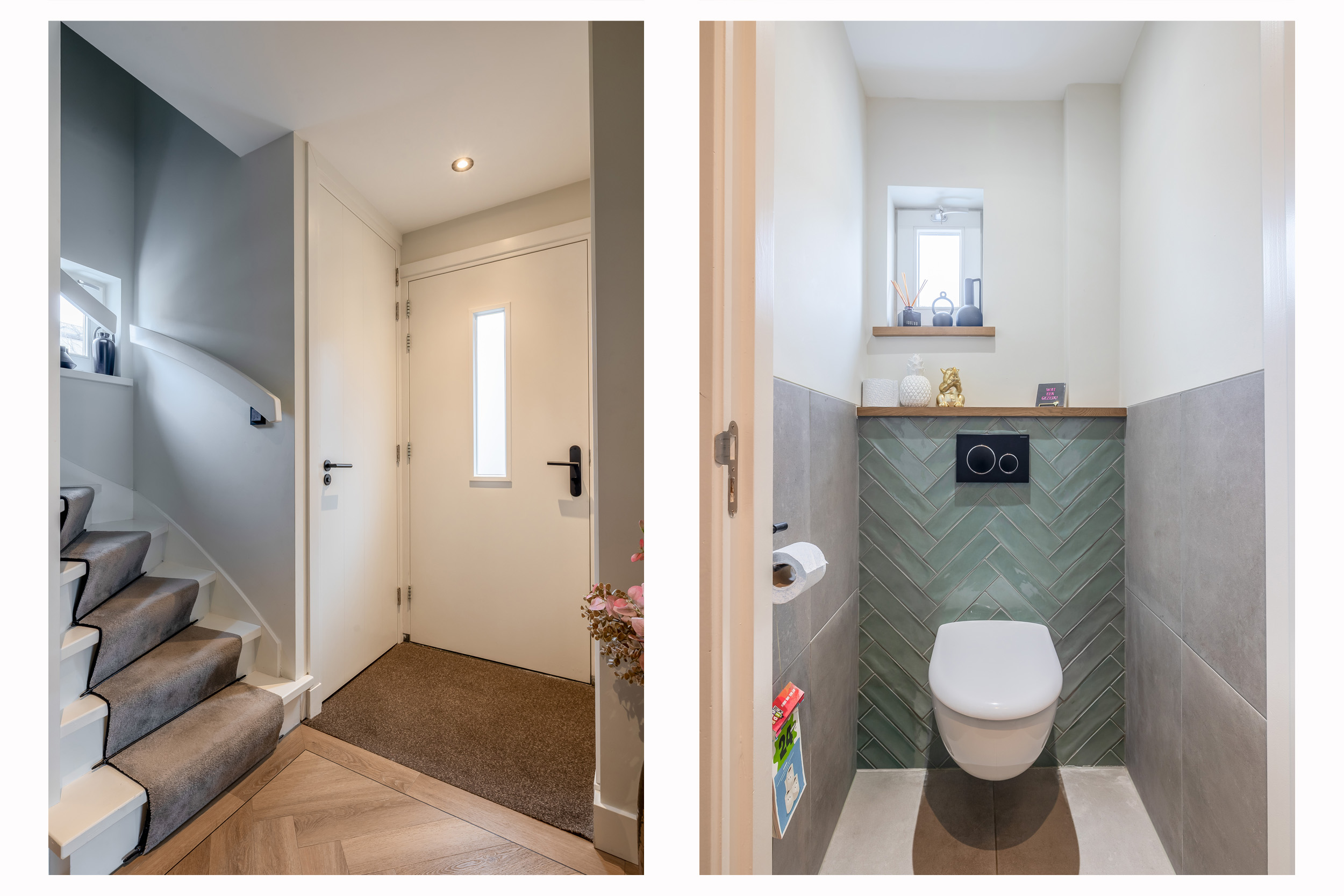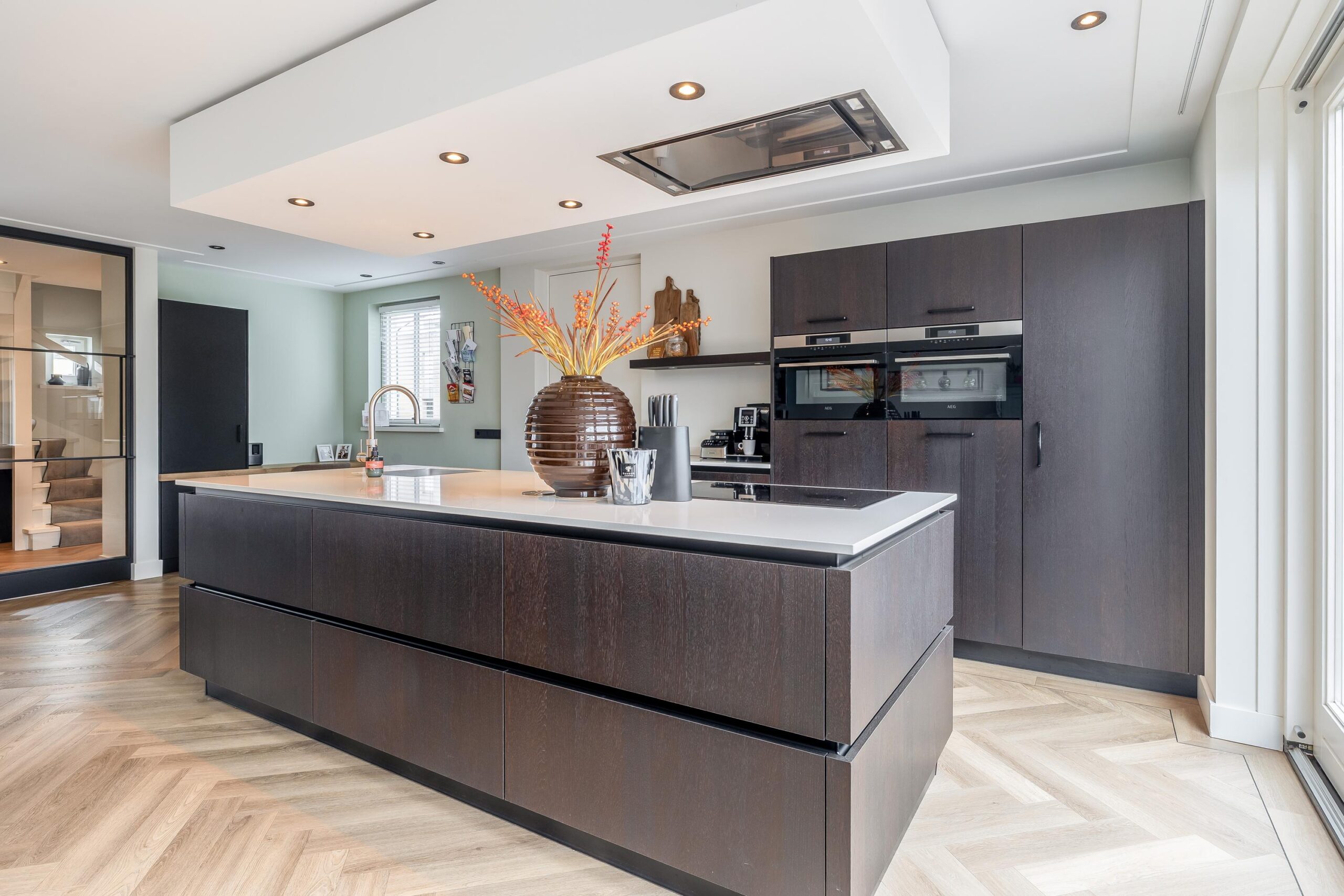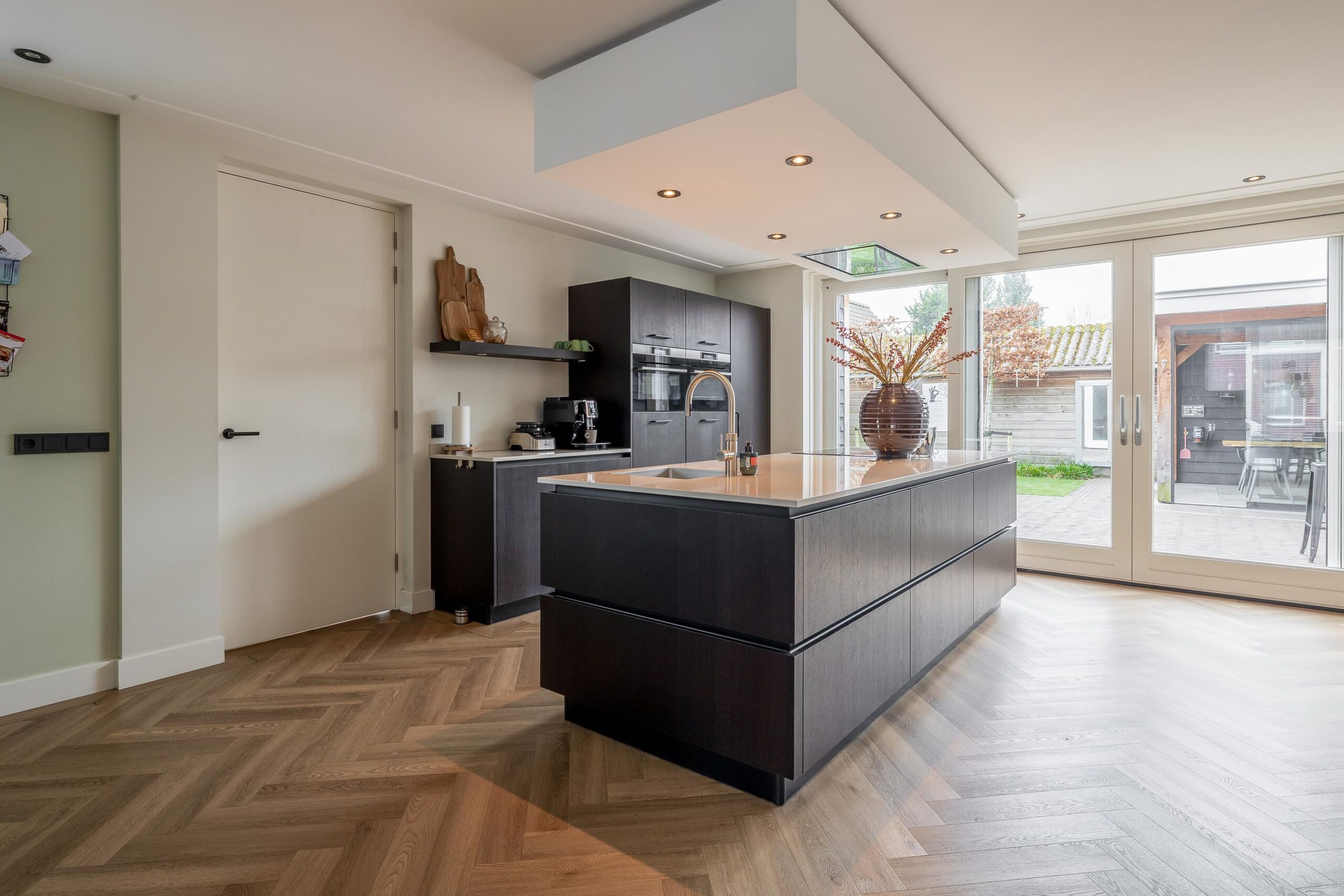 Begane grond: Bij binnenkomst ervaart u direct de hoogwaardige afwerking. In de hal bevinden zich de meterkast, de trapopgang naar de verdieping en de toiletruimte met inbouwcloset, fonteintje en raam. De gehele begane grond is afgewerkt met strak stucwerk op wanden en plafonds, inclusief ingestucte gordijnrails en een sfeervolle pvc-vloer met comfortabele vloerverwarming. Dankzij de uitbouw is een ruime woonkamer ontstaan met plaats voor een gezellige zit- en eethoek. Via de schuifpui heeft u toegang tot de tuin. De open keuken heeft een luxe uitstraling en beschikt over een kastenwand en een kook- en spoeleiland met een composiet werkblad. De keuken is voorzien van een spoelbak met Quooker (2020) en bruisendwaterkraan (2025), een oven, combi-oven, koelkast, inductiekookplaat, afzuigkap en een vaatwasser op hoogte, ideaal in gebruik. Vanuit de keuken komt u in de bijkeuken. Deze is ook bereikbaar vanuit zowel de voor- als achtertuin. Hier kunt u uw fietsen stallen en (tuin)gereedschap opbergen. De berging is afgewerkt met gestucte wanden en plafond, een tegelvloer, elektra en vloerverwarming. Dankzij deze hoogwaardige afwerking is de ruimte bovendien uitstekend geschikt als hobbyruimte of praktijk aan huis. Vanuit de berging is er toegang tot een werkkamer.