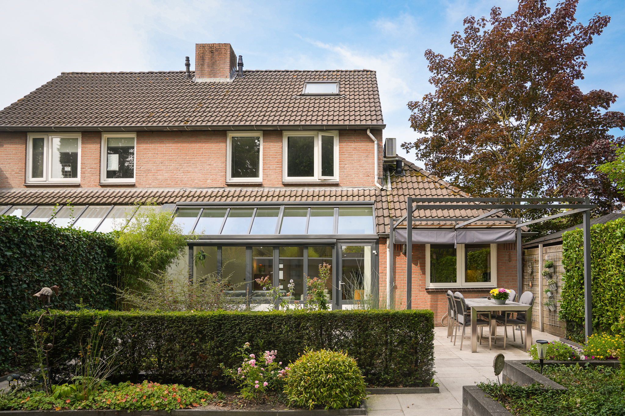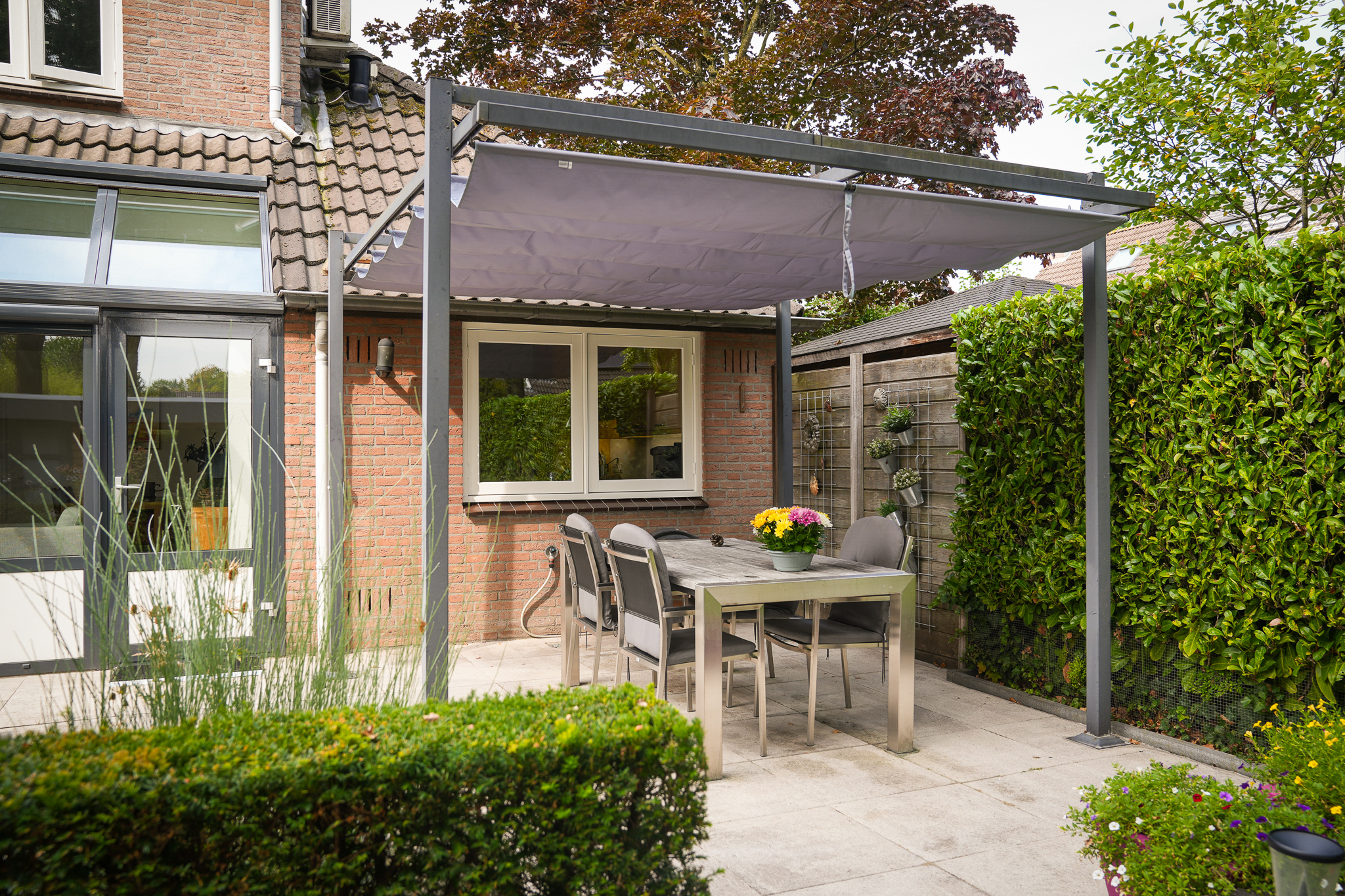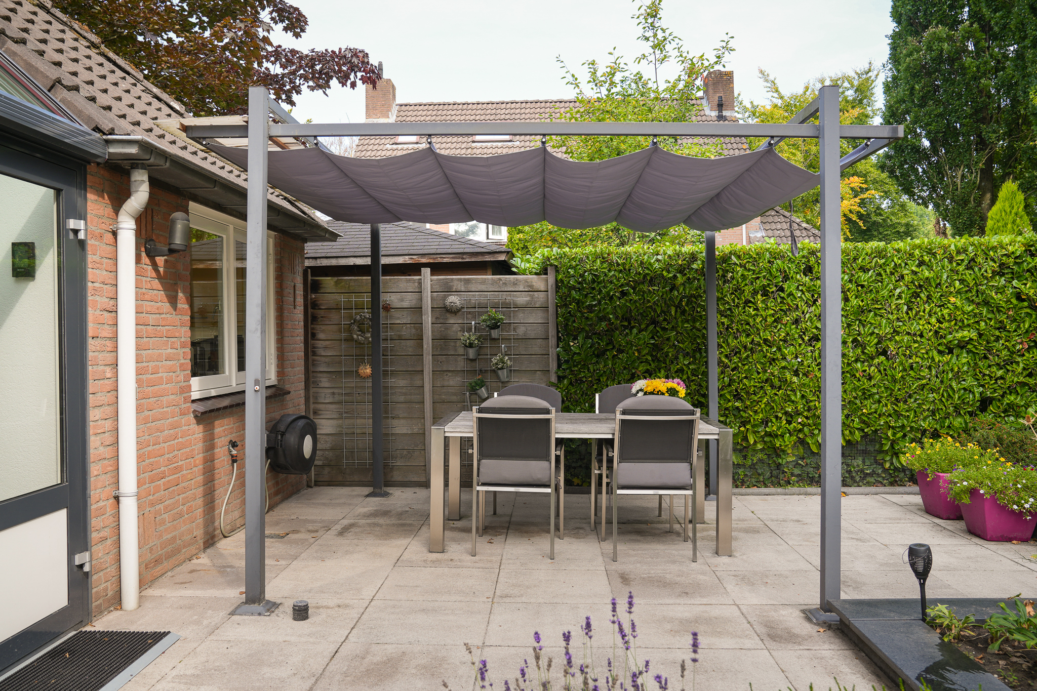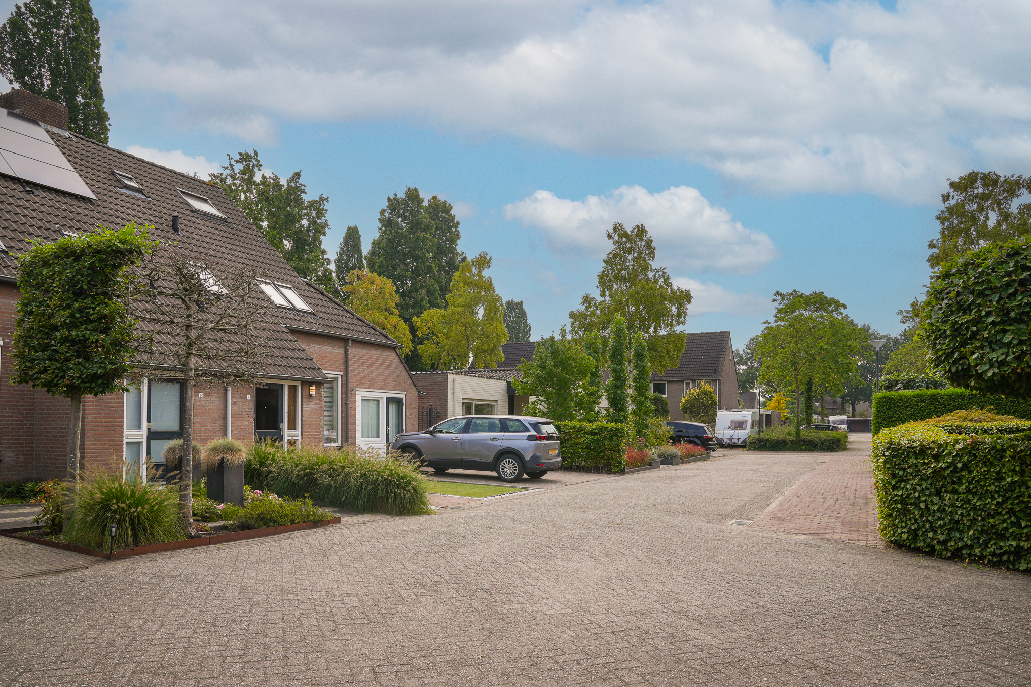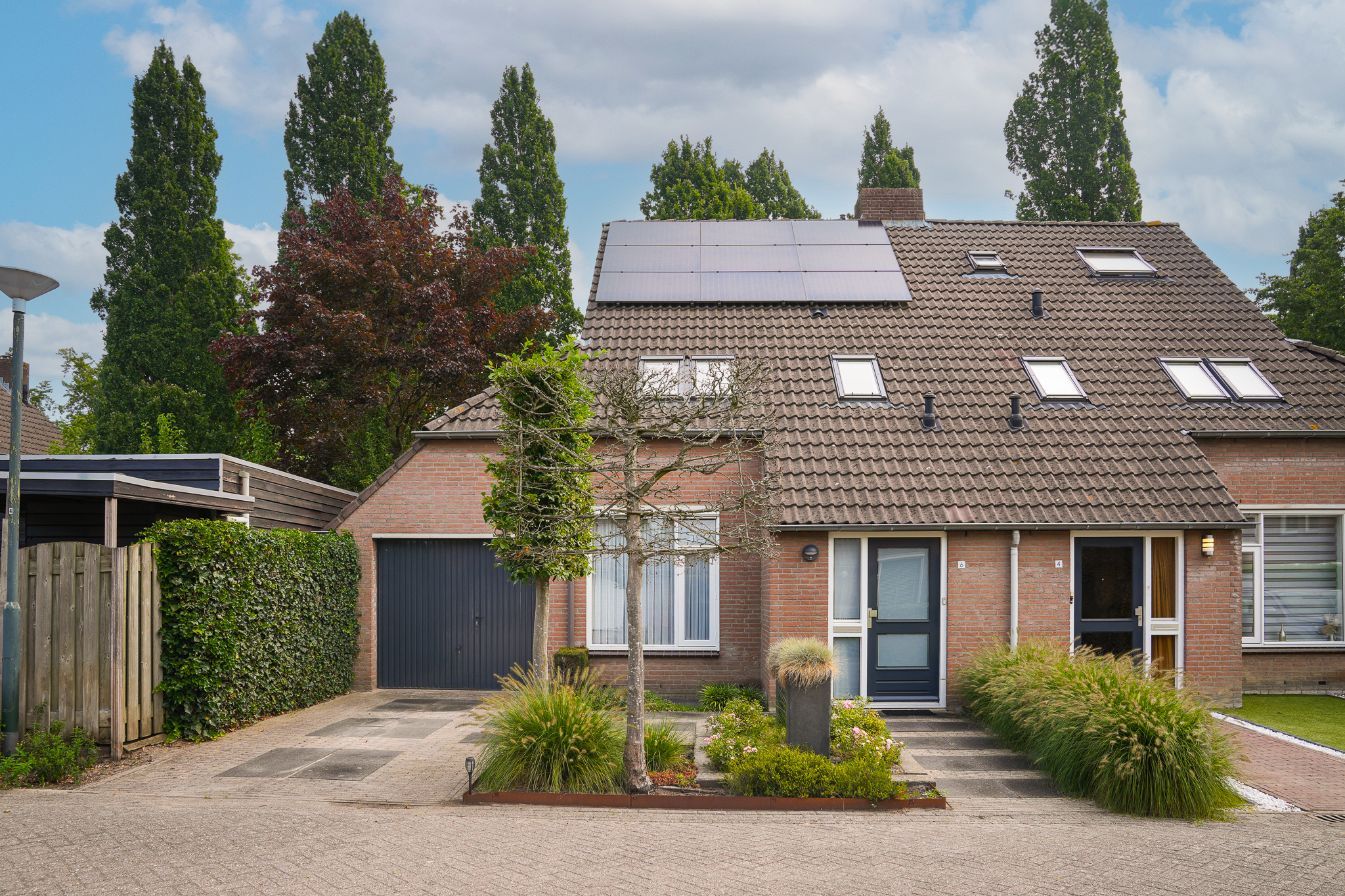De woning beschikt over een eigen oprit, met daarnaast diverse openbare parkeerplaatsen in de straat. De voortuin is smaakvol aangelegd met bomen, borders en vaste beplanting. De achtertuin is via een achterom bereikbaar en verzorgd ingericht met een terras, gazon, diverse vaste planten en een overkapping. Dankzij de indeling en beplanting geniet je hier van optimale privacy. Op het dak liggen 9 zonnepanelen (geplaatst in 2022).