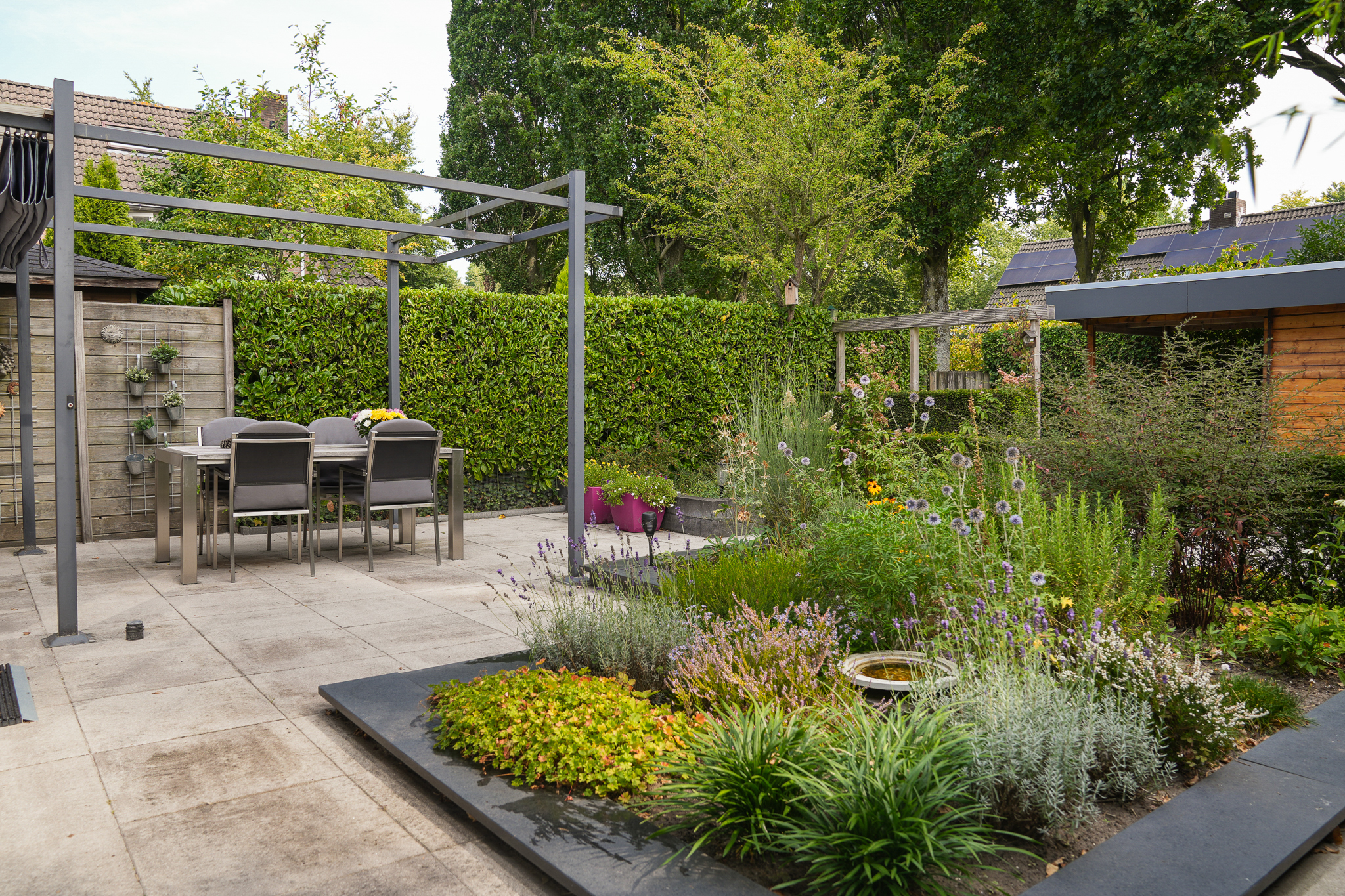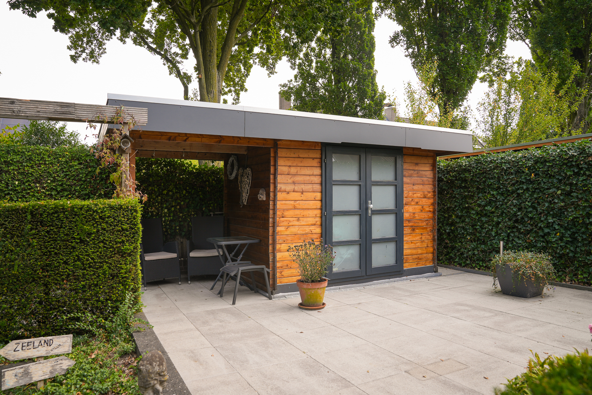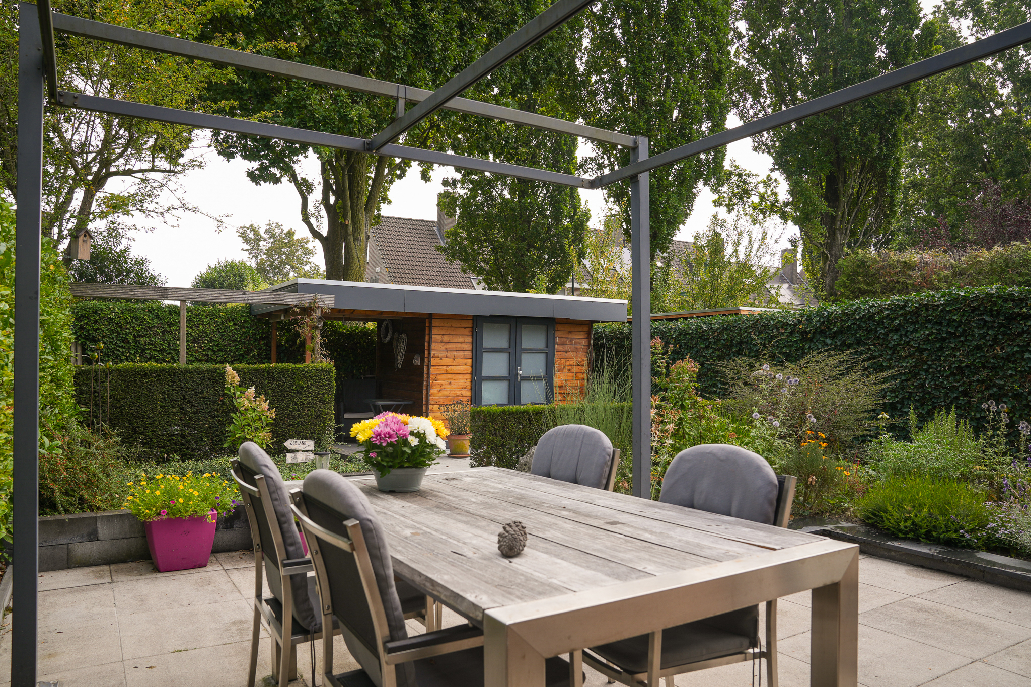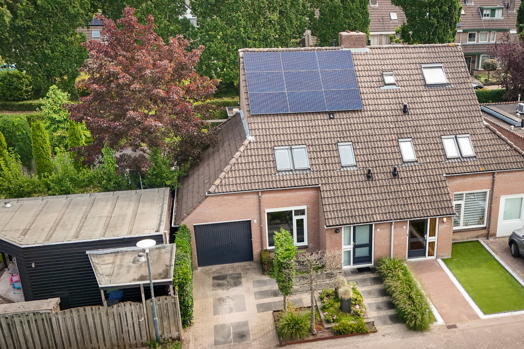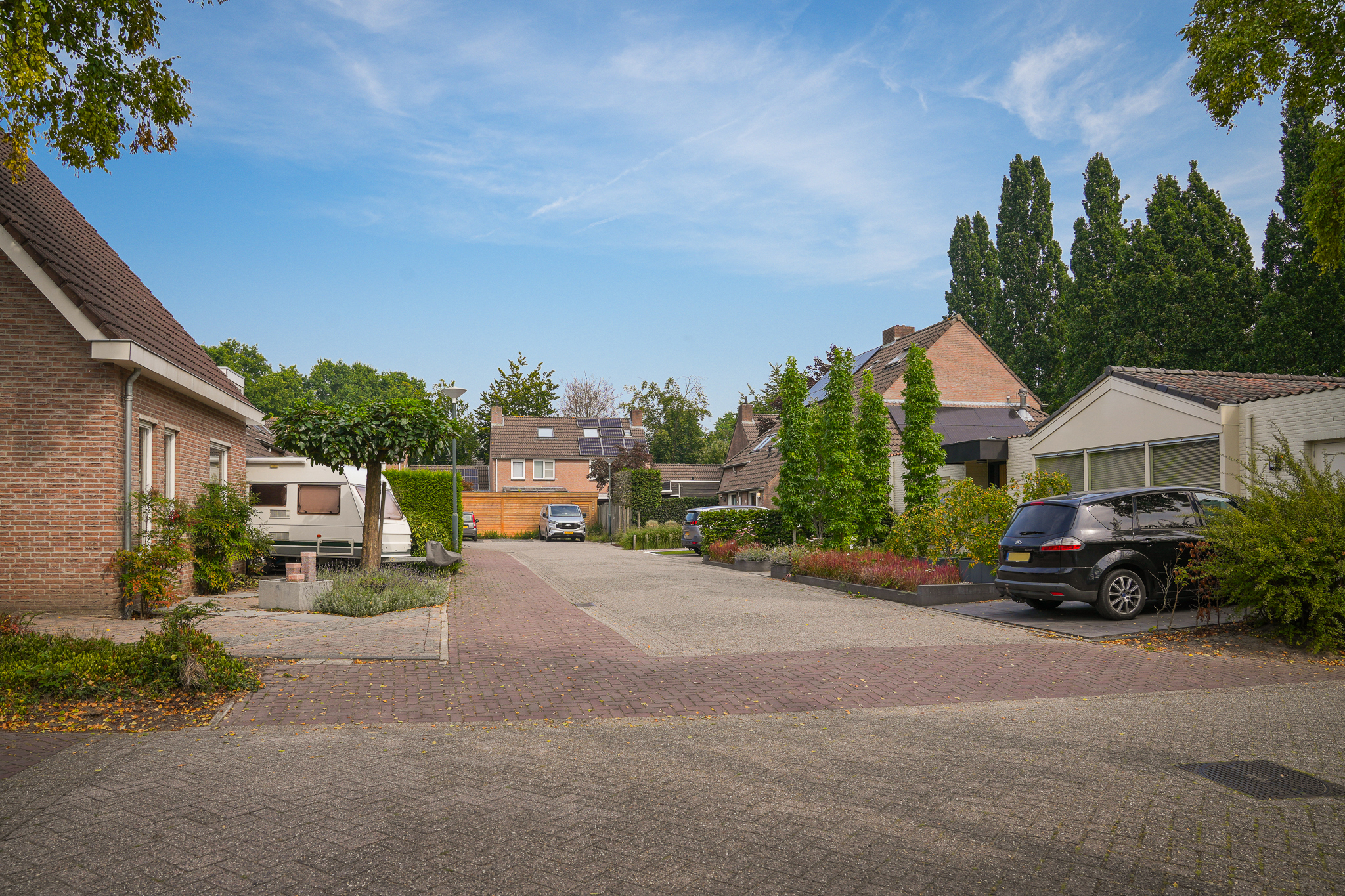 De woning beschikt over een eigen oprit, met daarnaast diverse openbare parkeerplaatsen in de straat. De voortuin is smaakvol aangelegd met bomen, borders en vaste beplanting. De achtertuin is via een achterom bereikbaar en verzorgd ingericht met een terras, gazon, diverse vaste planten en een overkapping. Dankzij de indeling en beplanting geniet je hier van optimale privacy. Op het dak liggen 9 zonnepanelen (geplaatst in 2022).