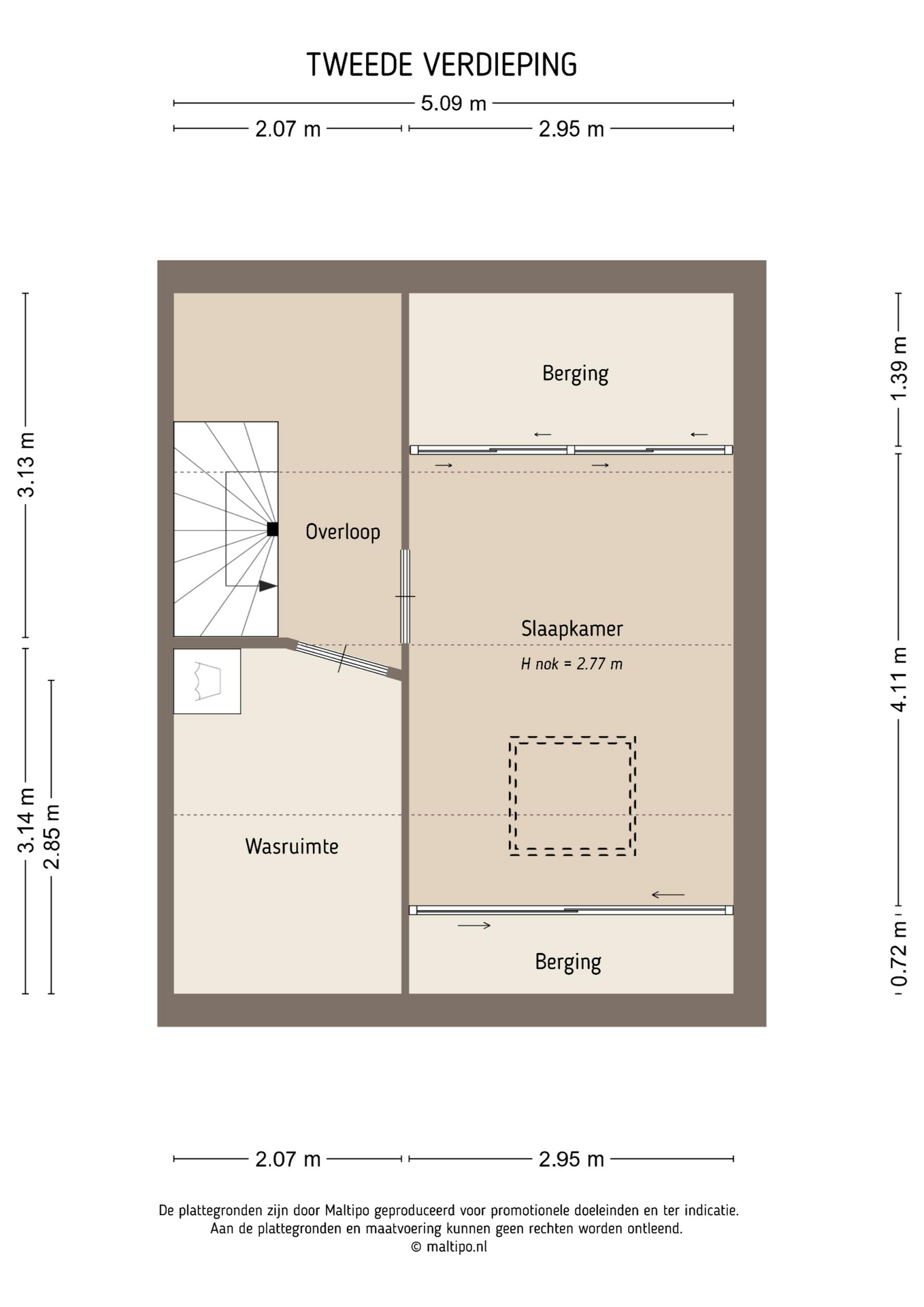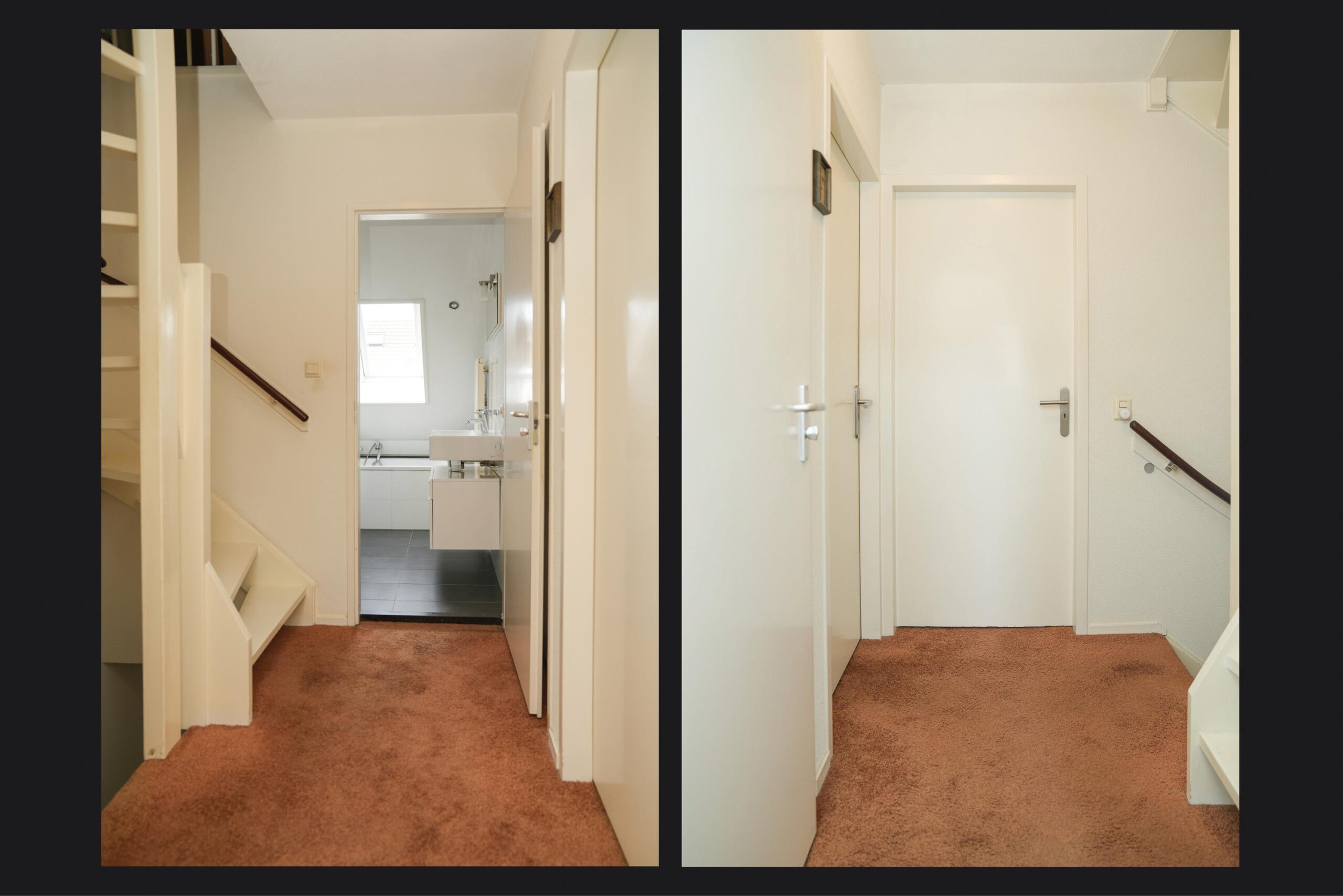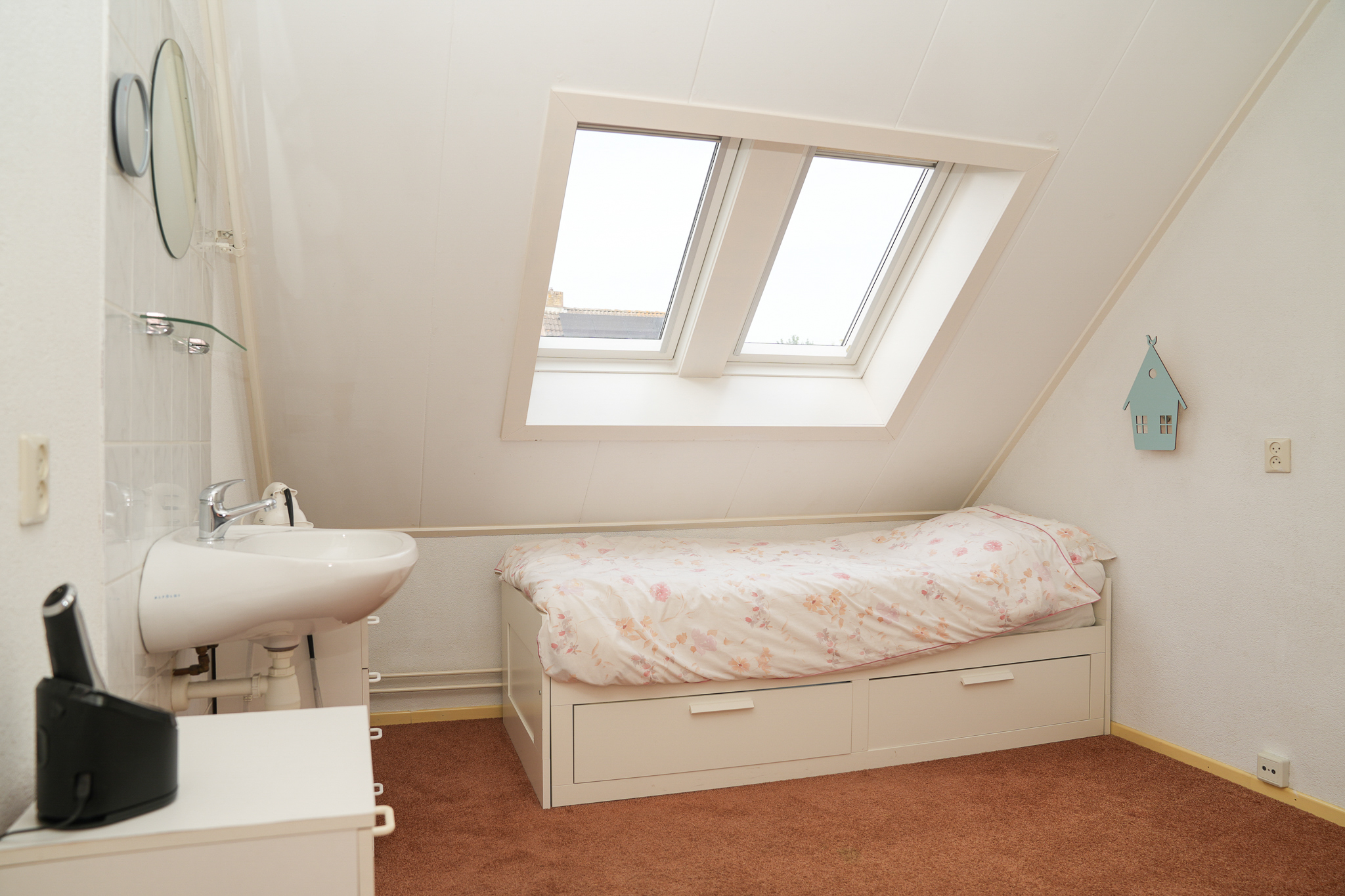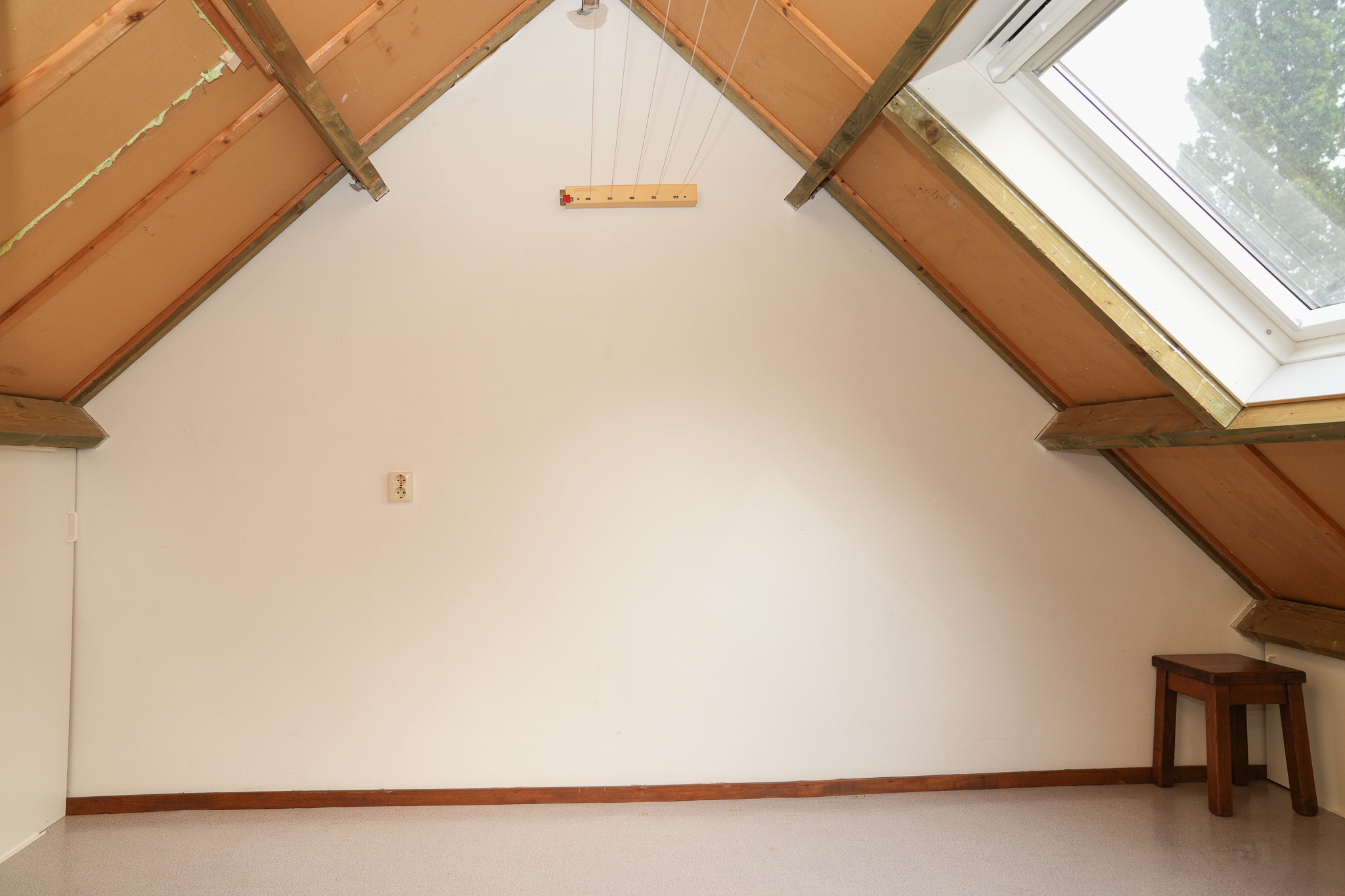 Tweede verdieping: Via een vaste trap bereik je de voorzolder met opstelling van de cv-installatie (Intergas, 2020), de omvormer van de zonnepanelen en extra witgoedaansluitingen. De vierde slaapkamer heeft een Velux dakraam en veel bergruimte achter de knieschotten.