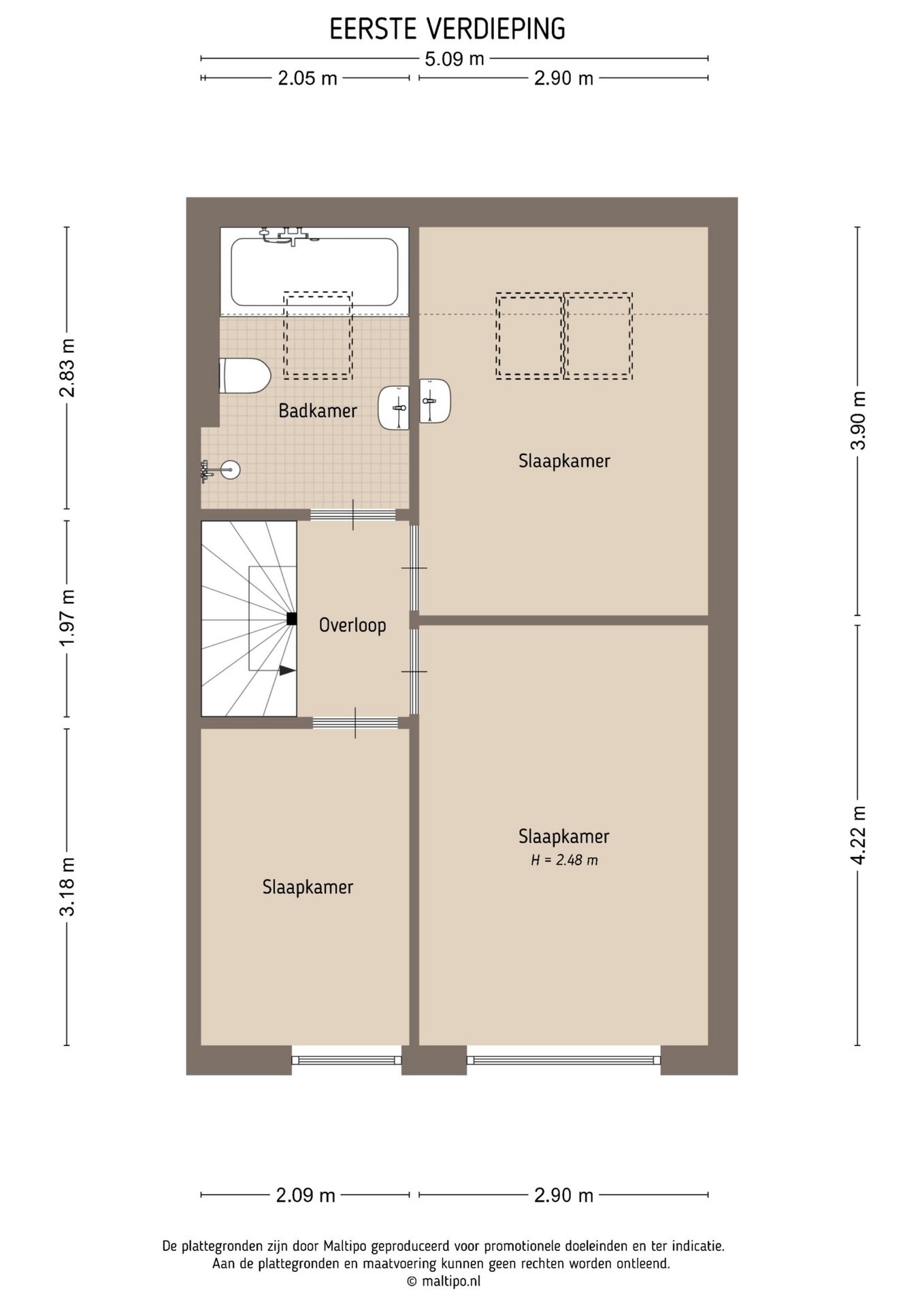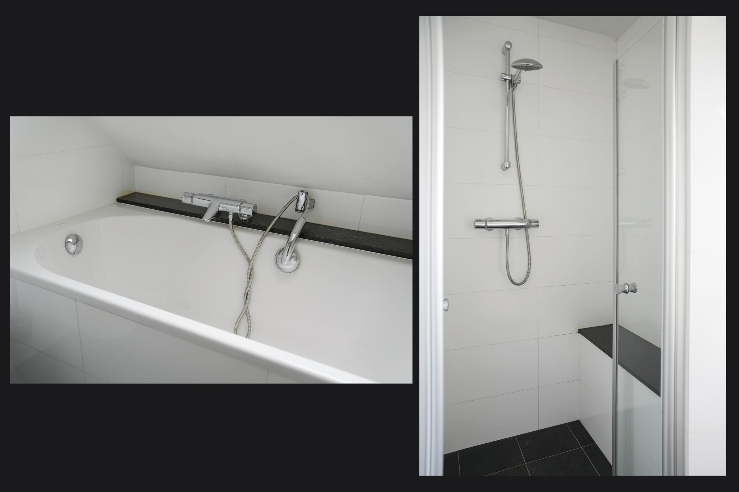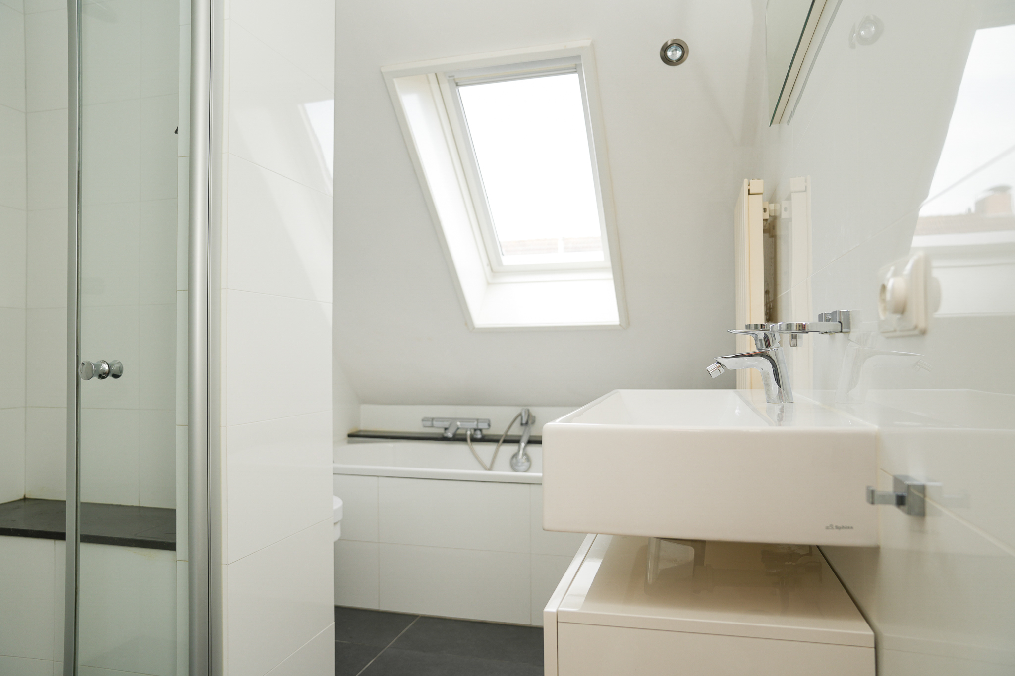 Eerste verdieping: Overloop met toegang tot drie slaapkamers en de badkamer. De overloop en slaapkamers zijn afgewerkt met stucwerk wanden en vloerbedekking. De hoofdslaapkamer beschikt over airconditioning. De nette badkamer is volledig betegeld en compleet uitgerust met een wastafel, inloopdouche, ligbad, inbouwcloset, thermostaatkranen, inbouwspots, conventionele vloerverwarming en een Velux dakraam.