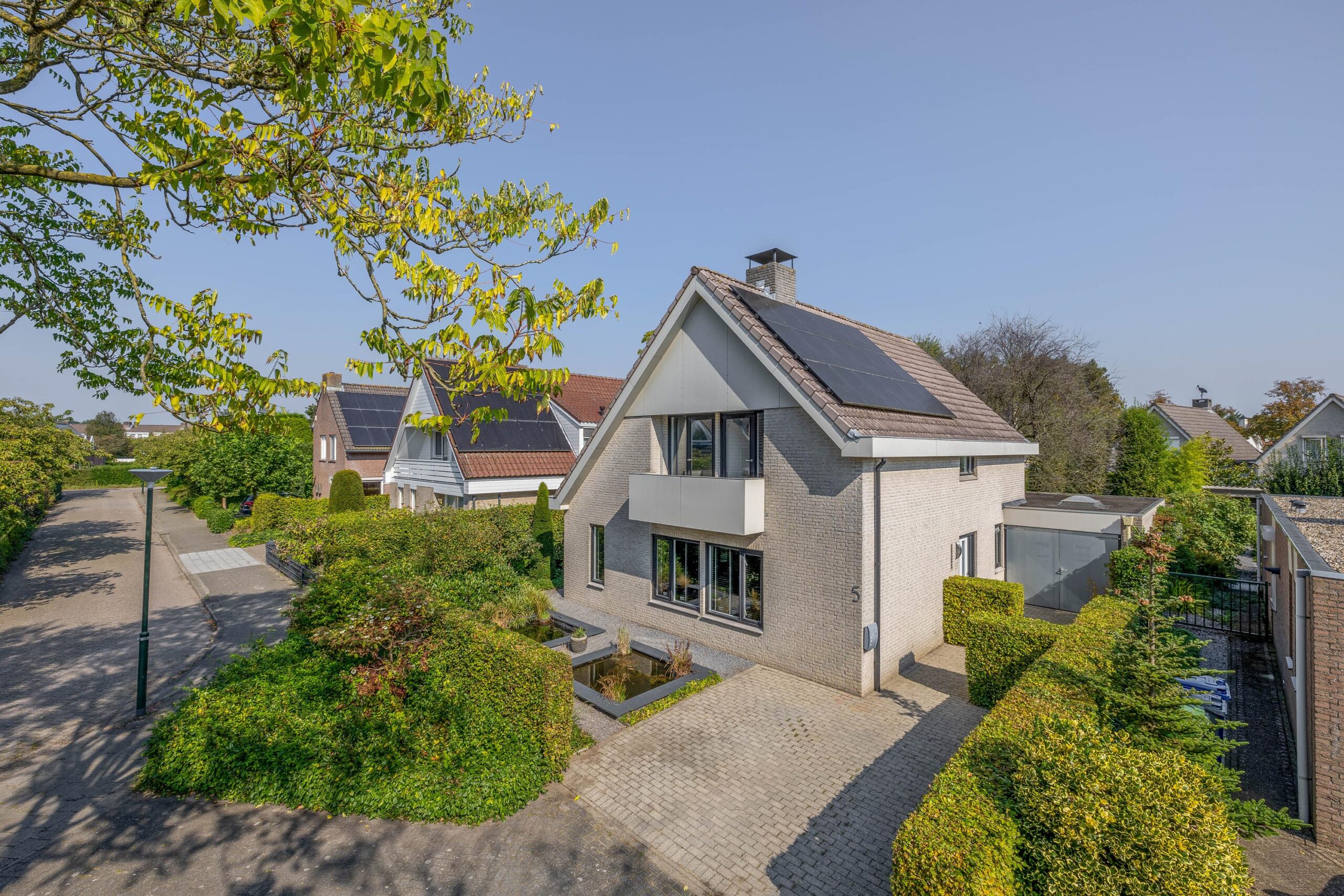 Aan de voorzijde is de tuin fraai aangelegd met vaste plantenborders. De rechterzijde is verhard zodat u hier 2 auto's op eigen terrein kunt parkeren. Aan de linkerzijde vindt u de achterom naar de achtertuin. Deze is ca. 17 meter diep en fraai aangelegd met meerdere terrassen, bomen, borders met volwassen beplanting, vijver en 2x een overkapping. De tuin beschikt over veel privacy. Een plek waar u heerlijk buiten kunt genieten.
