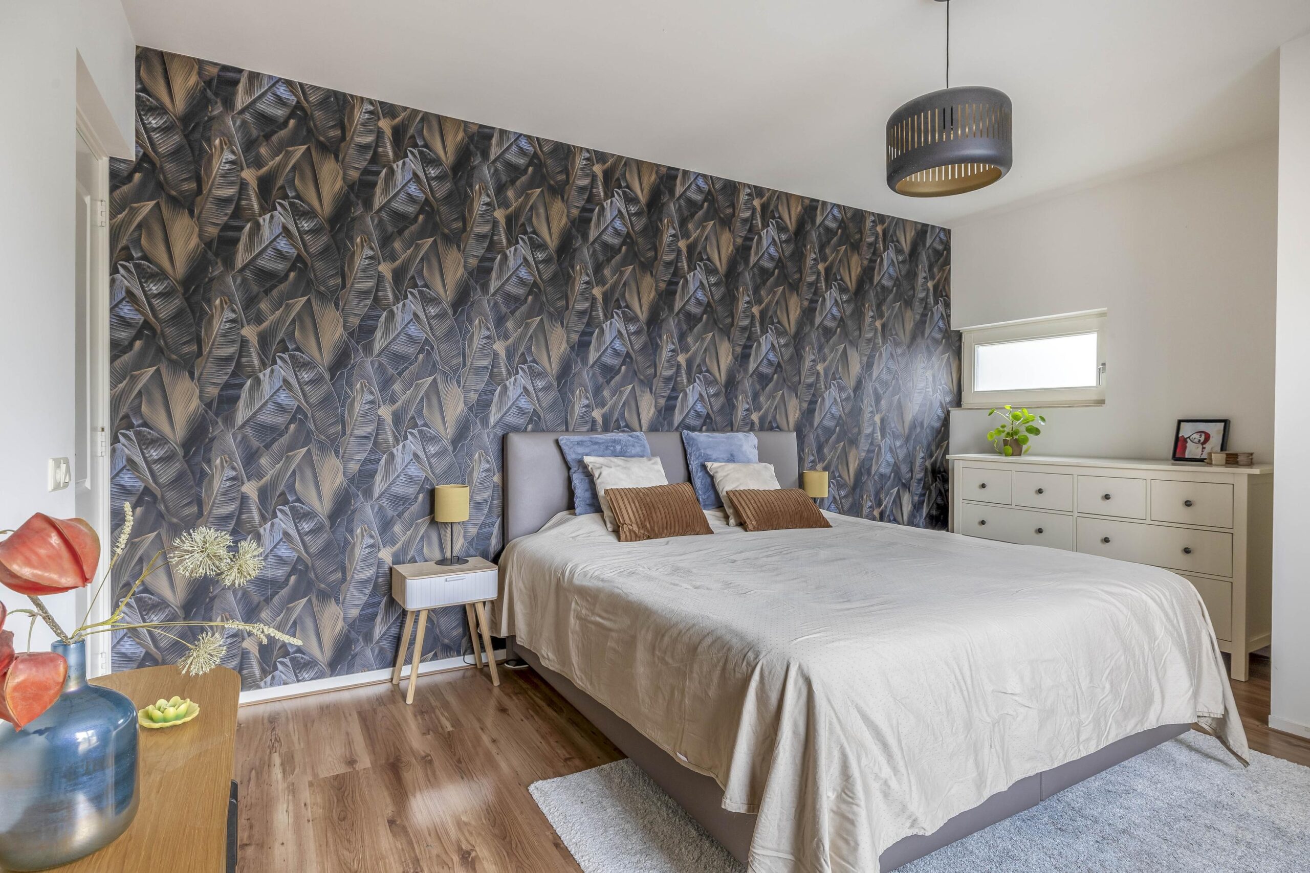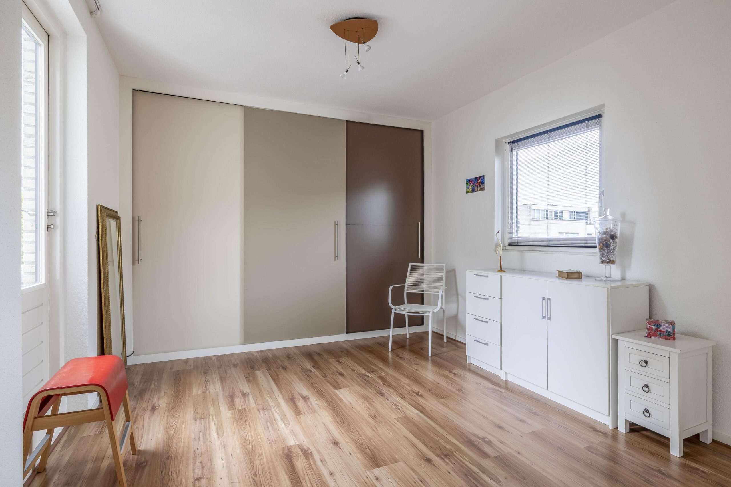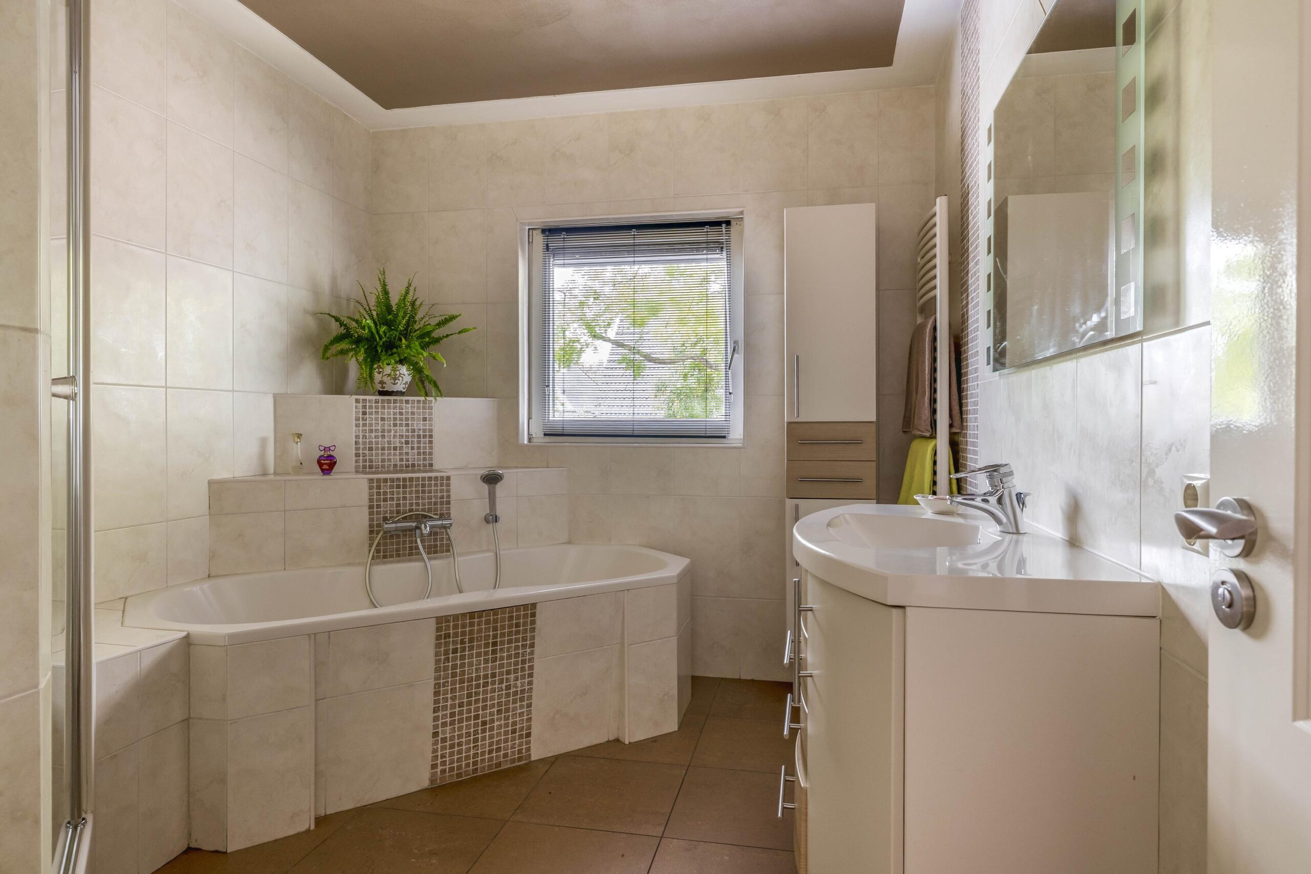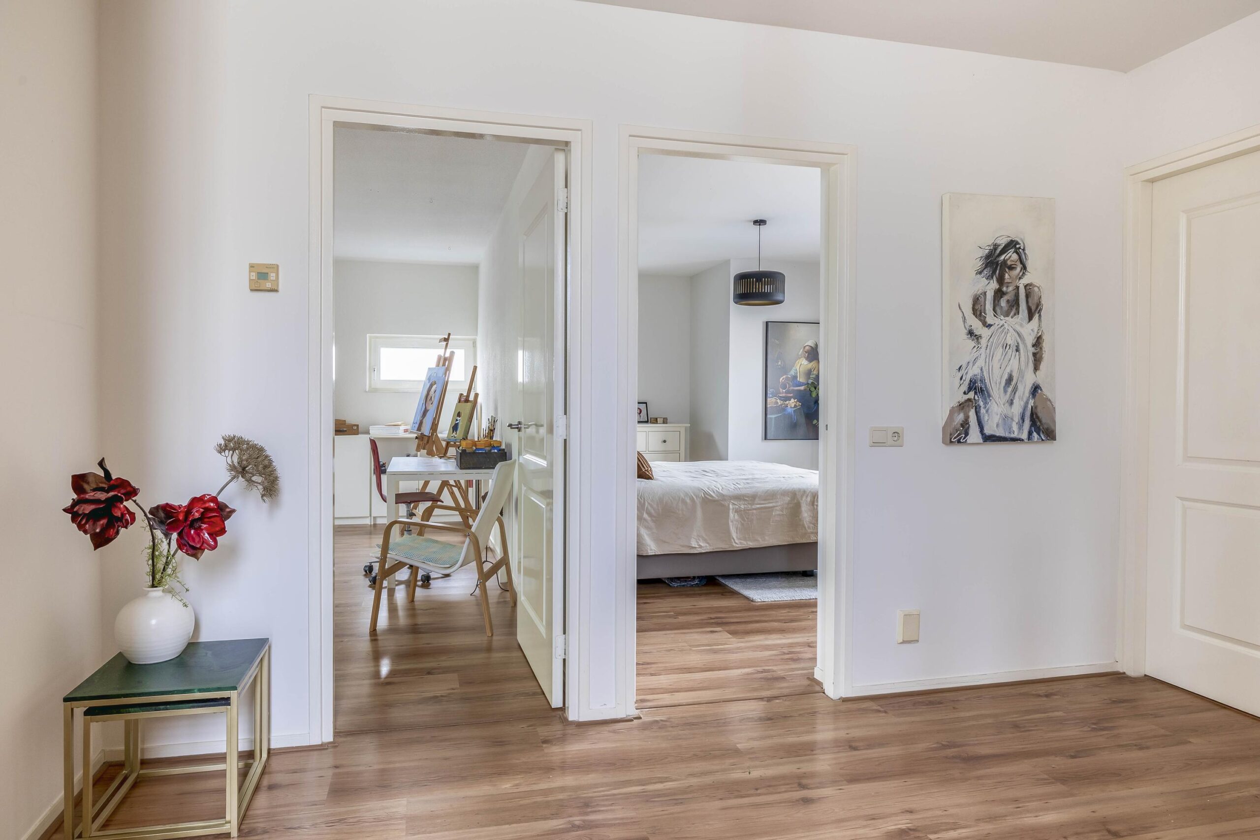 Eerste verdieping: De overloop biedt toegang tot drie ruime slaapkamers, de badkamer en een separaat toilet. De twee grootste slaapkamers beschikken over toegang tot een balkon aan zowel de voor- als achterzijde. De kamers zijn voorzien van een laminaatvloer en draai-/kiepramen. Twee slaapkamers beschikken over een bergkast en twee kamers zijn uitgerust met airconditioning. De volledig betegelde badkamer is afgewerkt met beige wandtegels en mozaïektegels. De ruimte is ingericht met een ligbad, een douche (beide voorzien van thermostaatkranen), een badkamermeubel met wastafel, een designradiator, vloerverwarming en een te openen raam voor natuurlijke ventilatie.