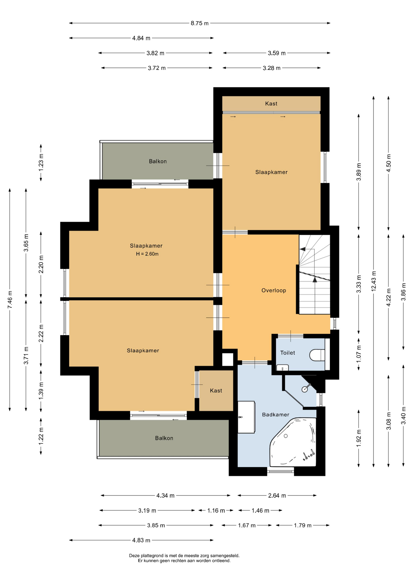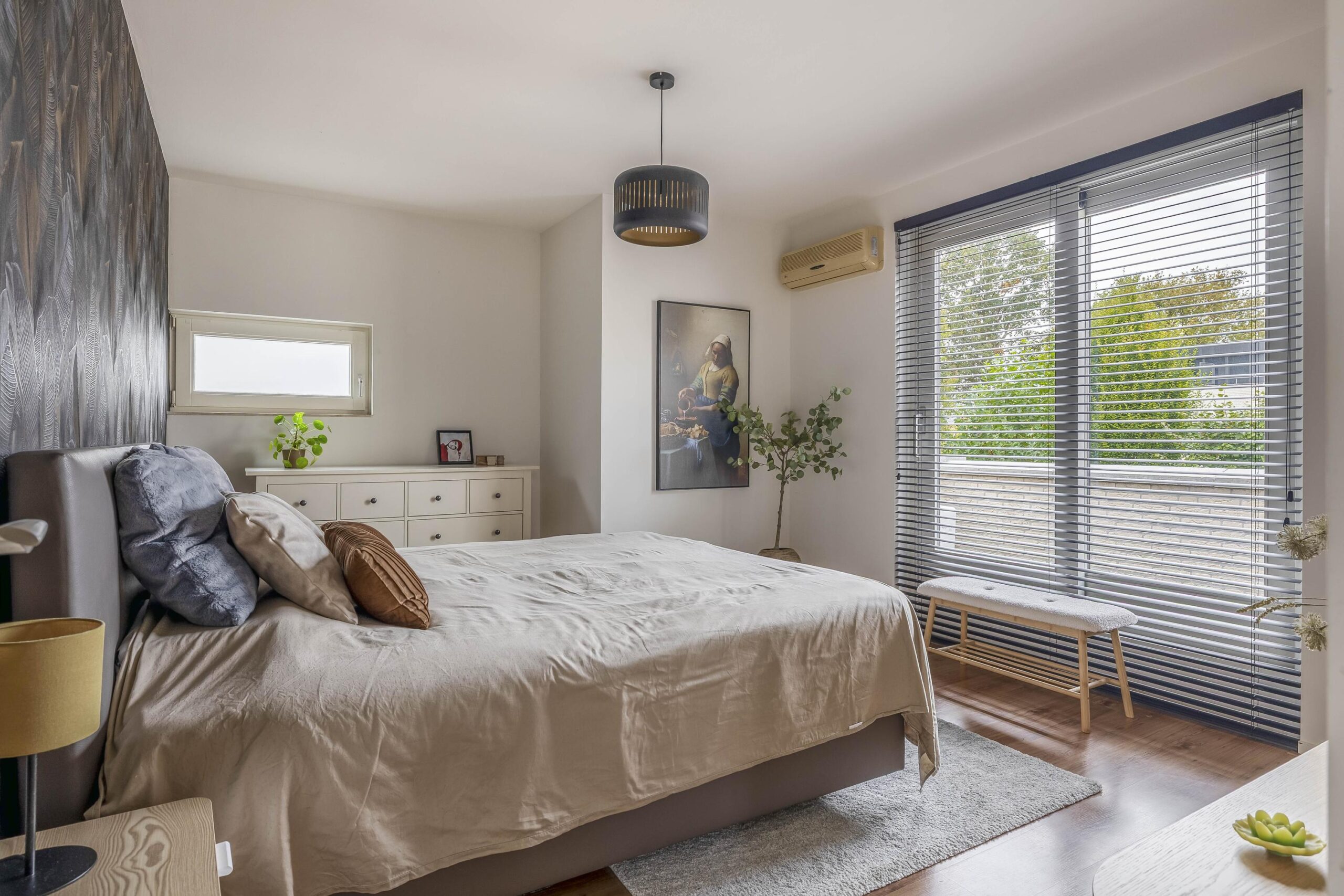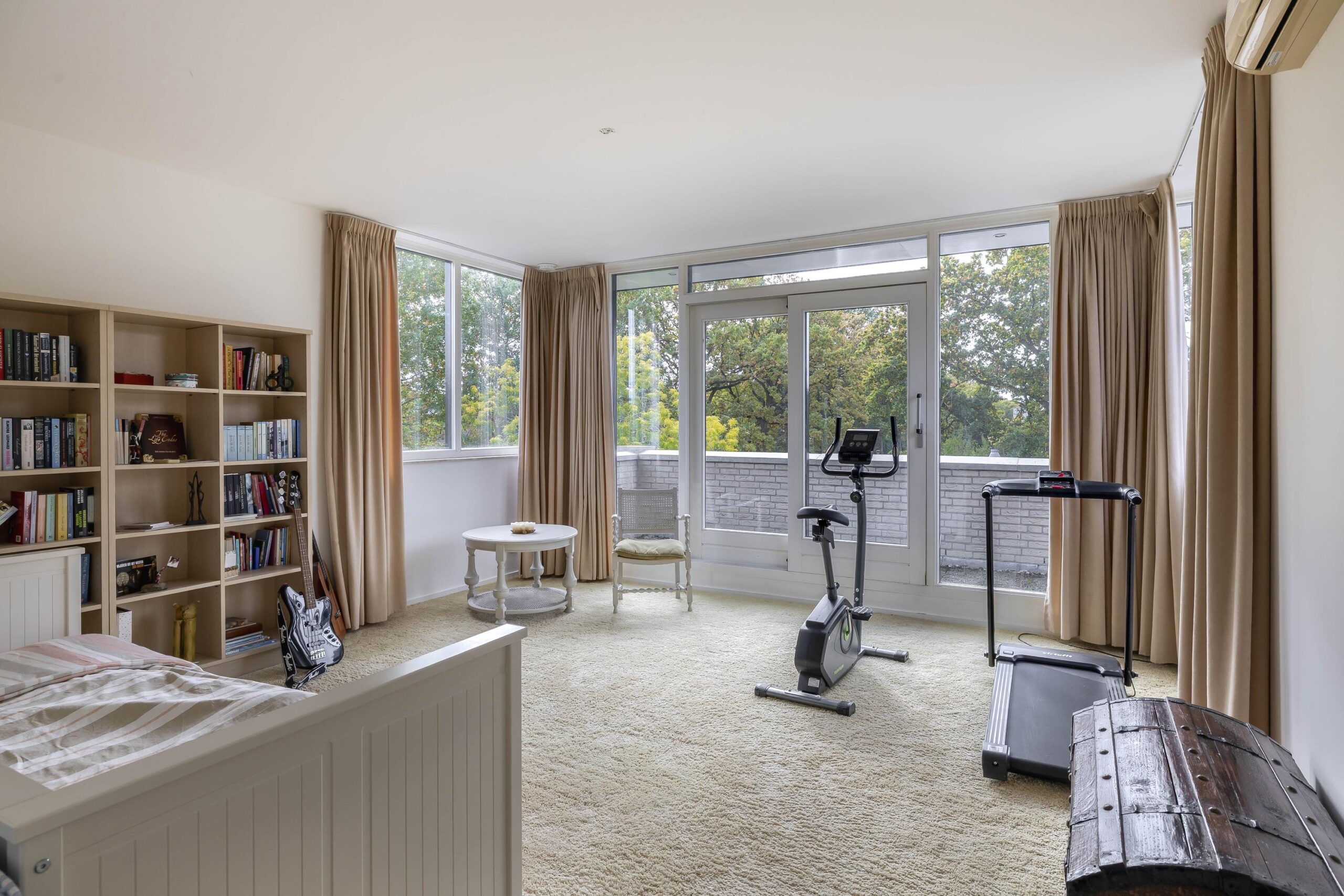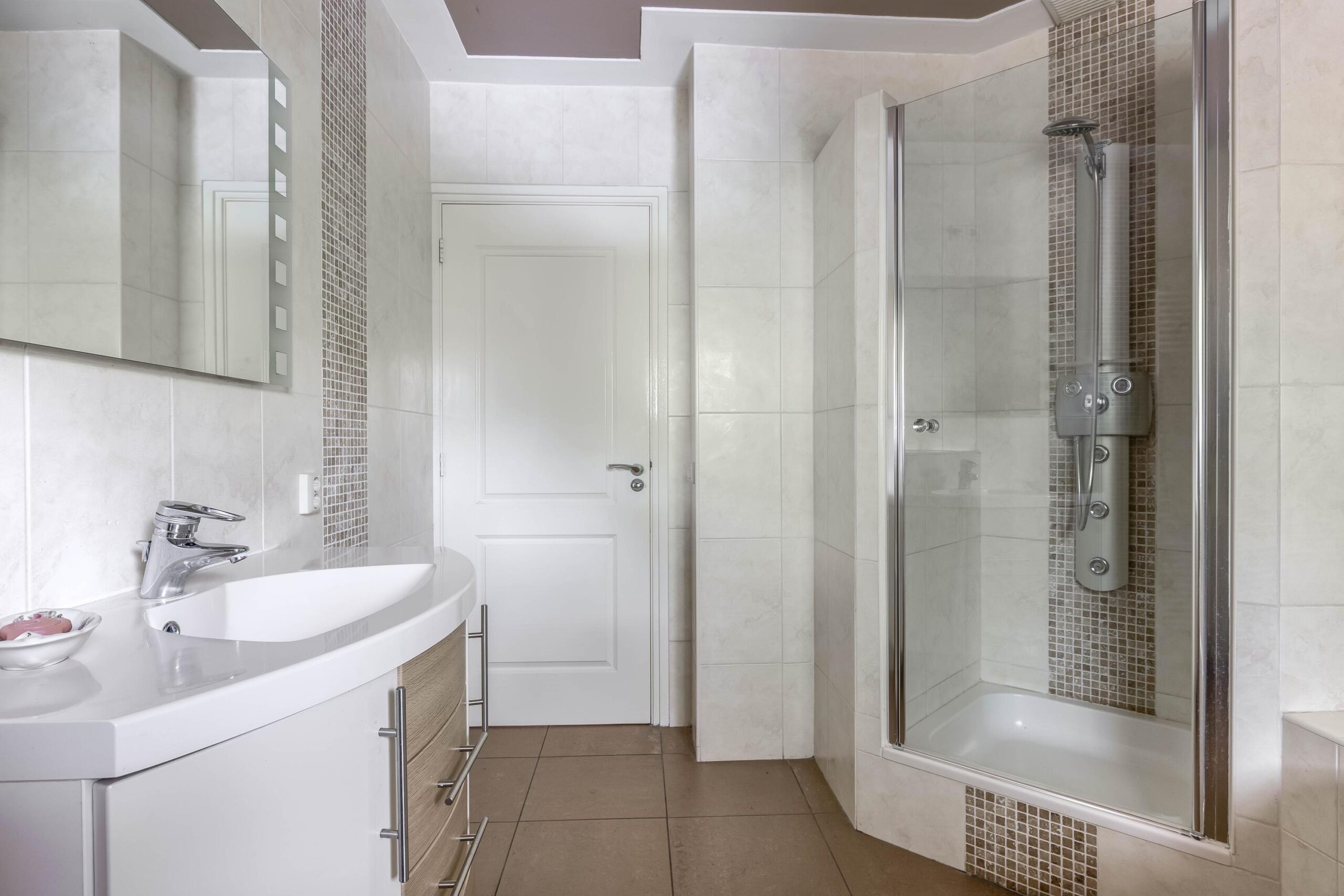 Eerste verdieping: De overloop biedt toegang tot drie ruime slaapkamers, de badkamer en een separaat toilet. De twee grootste slaapkamers beschikken over toegang tot een balkon aan zowel de voor- als achterzijde. De kamers zijn voorzien van een laminaatvloer en draai-/kiepramen. Twee slaapkamers beschikken over een bergkast en twee kamers zijn uitgerust met airconditioning. De volledig betegelde badkamer is afgewerkt met beige wandtegels en mozaïektegels. De ruimte is ingericht met een ligbad, een douche (beide voorzien van thermostaatkranen), een badkamermeubel met wastafel, een designradiator, vloerverwarming en een te openen raam voor natuurlijke ventilatie.
