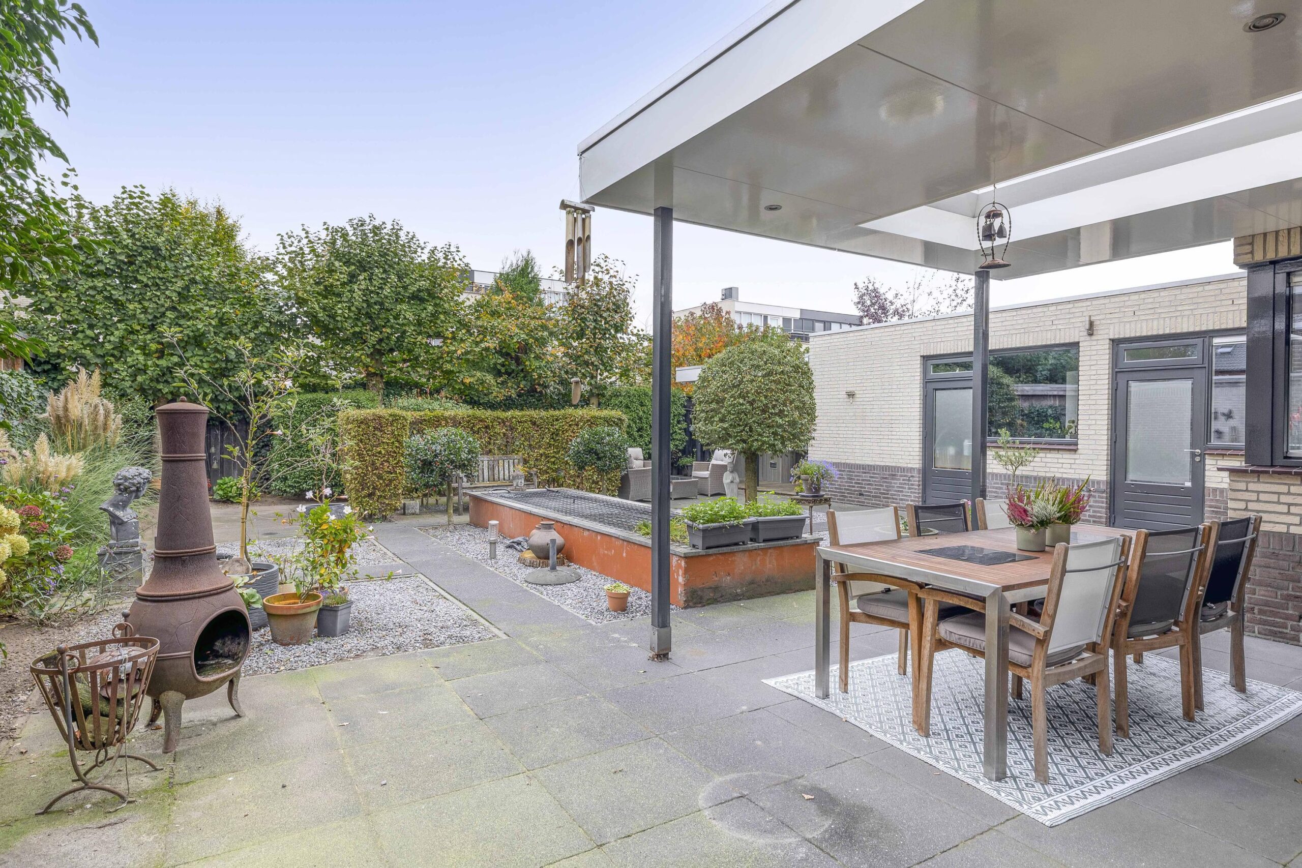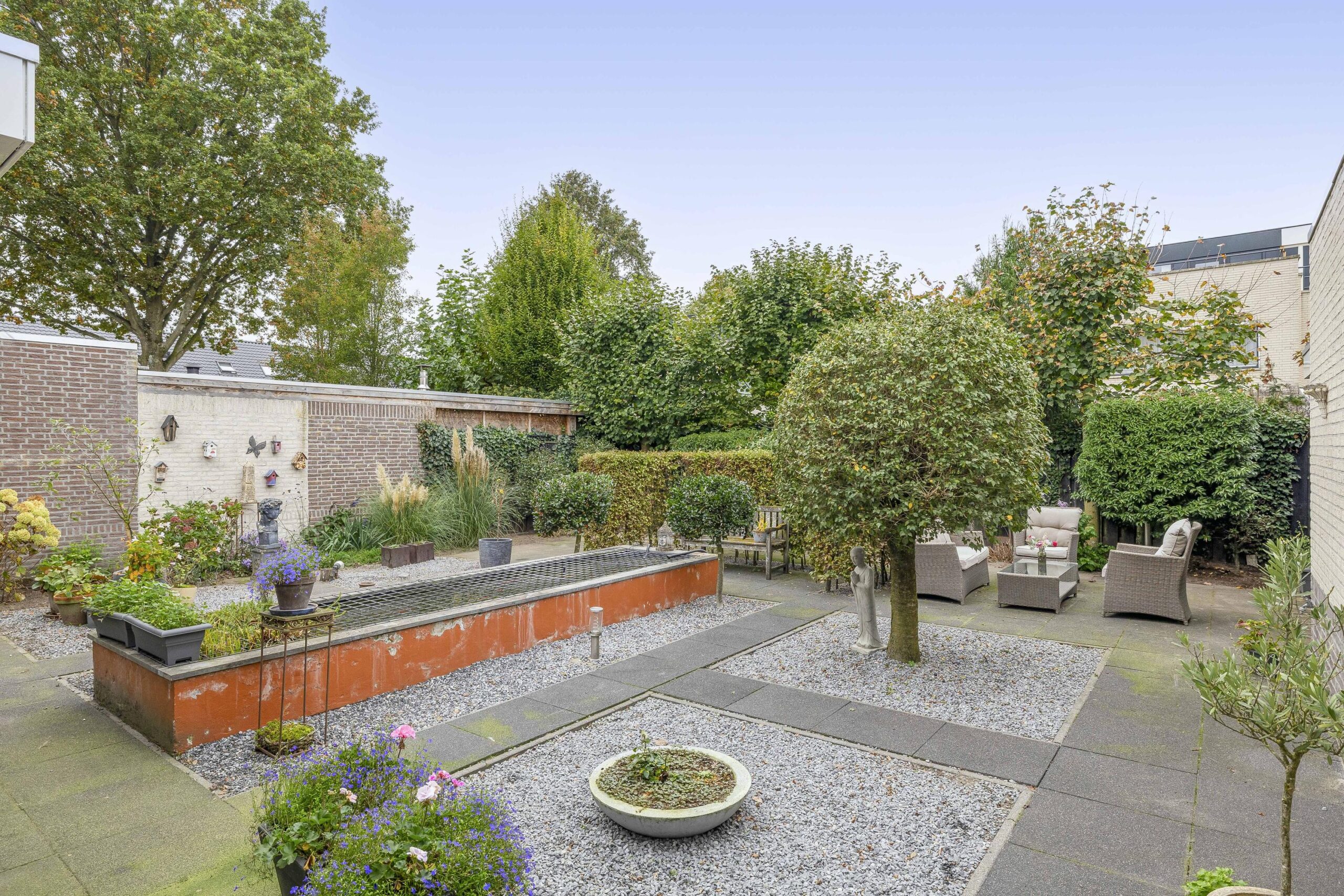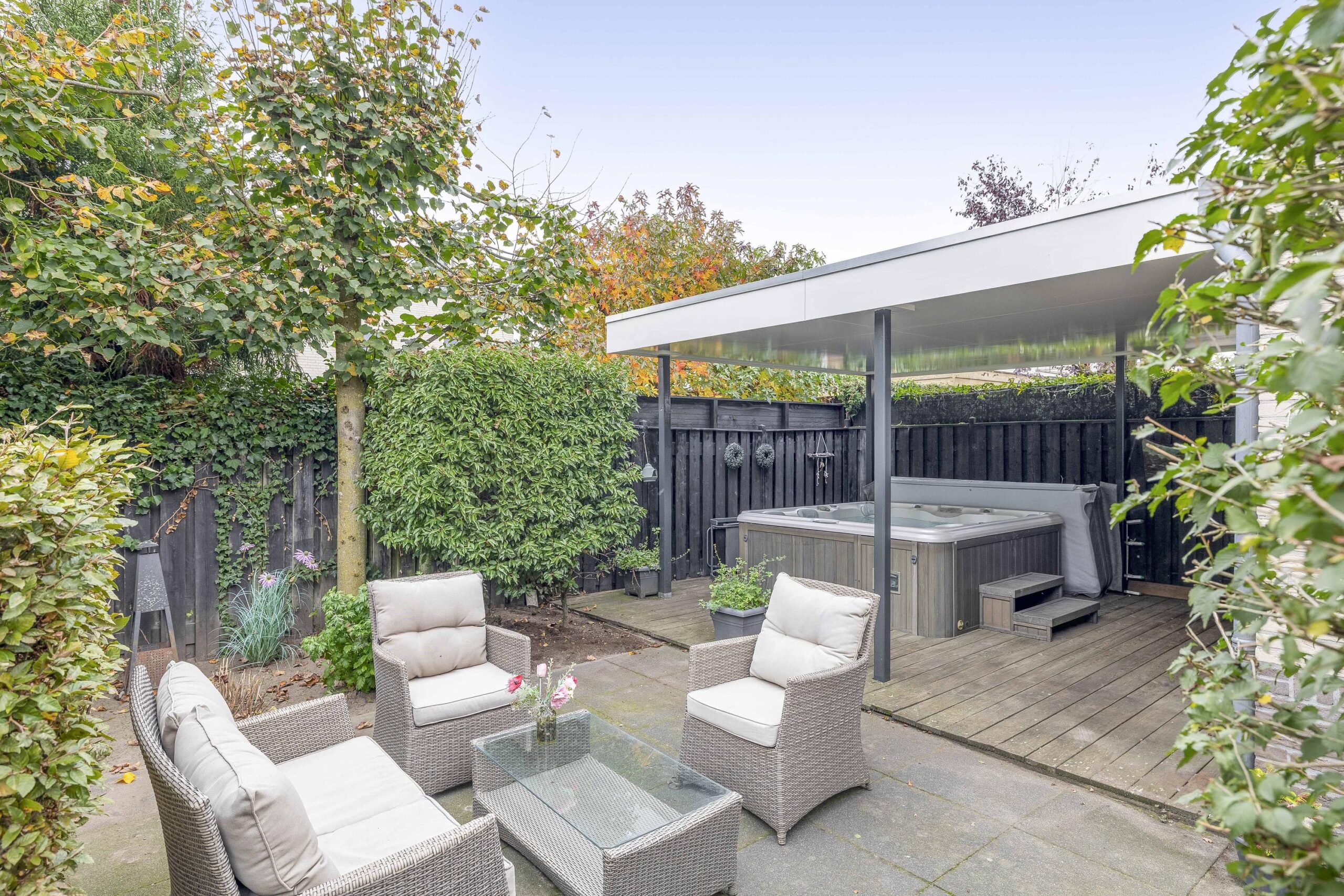 De achtertuin is zowel via de woning als via een achterom bereikbaar en is fraai aangelegd met diverse plantenborders, een stenen terras en een vijver. Er zijn twee overkappingen waar u heerlijk kunt zitten, waarvan één met jacuzzi (deze blijft achter). Daarnaast is er een derde overkapping geschikt voor opslag, bijvoorbeeld van uw kliko’s. In de tuin bevindt zich ook een houten berging, ideaal voor het opbergen van (tuin)gereedschap of het stallen van fietsen. Hier geniet u in alle rust van optimale privacy.