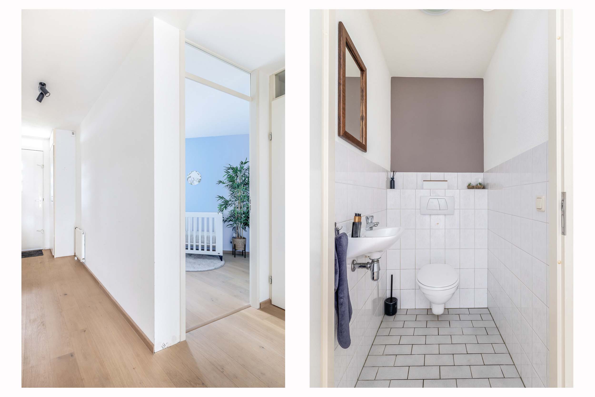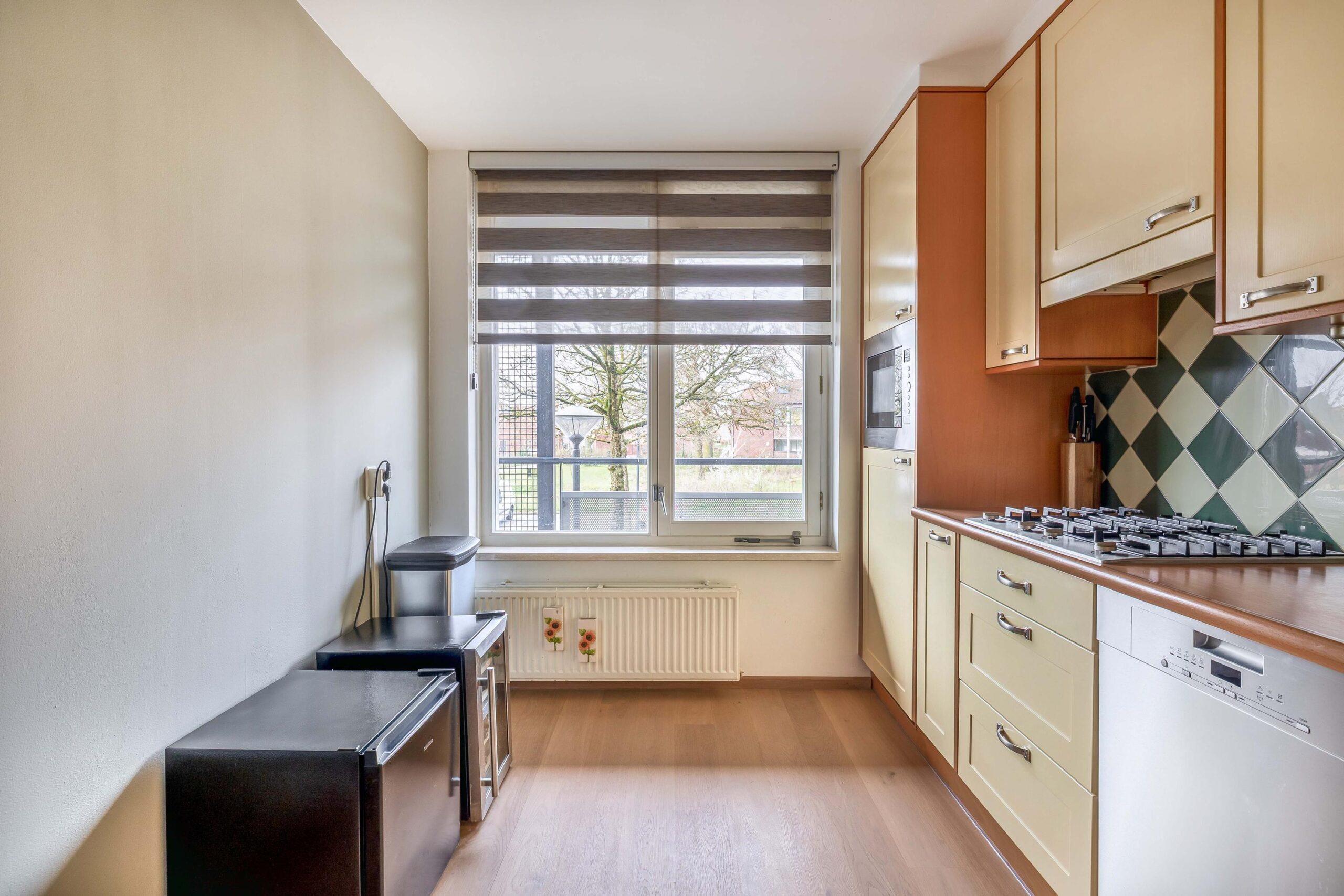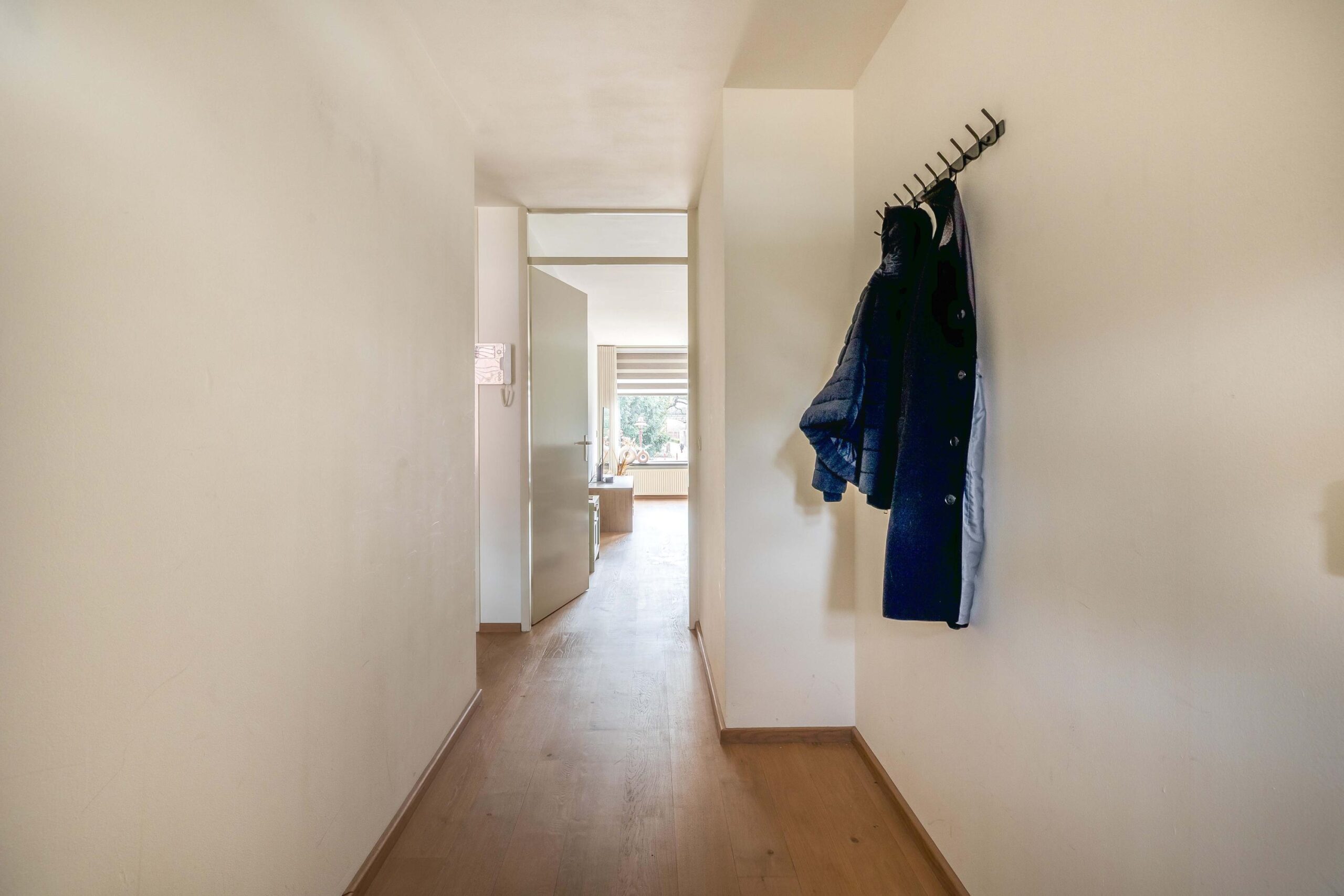 Het appartement ligt op korte afstand van de entree en het trappenhuis van het complex. Bij binnenkomst komt u in een ruime hal met een meterkast en toegang tot de woonkamer, slaapkamers en sanitaire voorzieningen. De woonkamer is ruim opgezet en heeft een oppervlakte van bijna 30 m². De ruimte is voorzien van een nette lamelparketvloer en licht afgewerkte wanden. Dankzij de grote raampartijen aan de voorzijde is er veel natuurlijke lichtinval en heeft u een vrij uitzicht over het voetgangersgebied richting de Hoofdstraat. Vanuit de woonkamer heeft u direct toegang tot het balkon. Het balkon biedt veel privacy en is voorzien van een markies als zonwering, wat bij de zonnige ligging zeer prettig is. De keuken staat in halfopen verbinding met de woonkamer. Tussen de woonkamer en keuken bevindt zich een praktische provisieruimte/bergkast waar tevens de wasmachine geplaatst kan worden. Hier zijn ook de combiketel en de afzuigunit gesitueerd. De keuken heeft een nette L-opstelling en is voorzien van diverse inbouwapparatuur, waaronder een Miele vaatwasser, gaskookplaat, koelkast en magnetron. In de keuken is bovendien ruimte voor een kleine eettafel. Het appartement beschikt over twee slaapkamers. De grootste slaapkamer is rechtstreeks vanuit de woonkamer bereikbaar en heeft tevens directe toegang tot de badkamer. De tweede slaapkamer is ideaal te gebruiken als logeer-, werk- of hobbykamer en beschikt over een opvallend hoekraam. Ook in beide slaapkamers ligt dezelfde vloer als in de woonkamer. De badkamer is ruim opgezet en voorzien van een royale inloopdouche met glaswand en een wastafel met meubel. De badkamer is zowel vanuit de hal als vanuit de hoofdslaapkamer bereikbaar. Daarnaast beschikt het appartement over een separate toiletruimte met wandcloset en fonteintje.