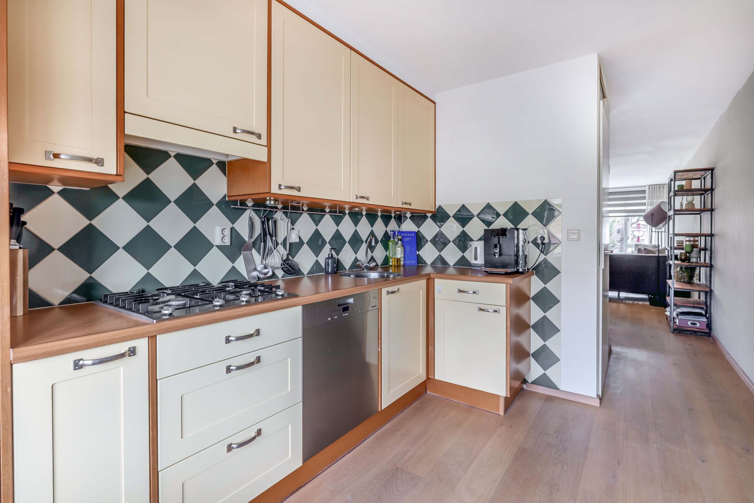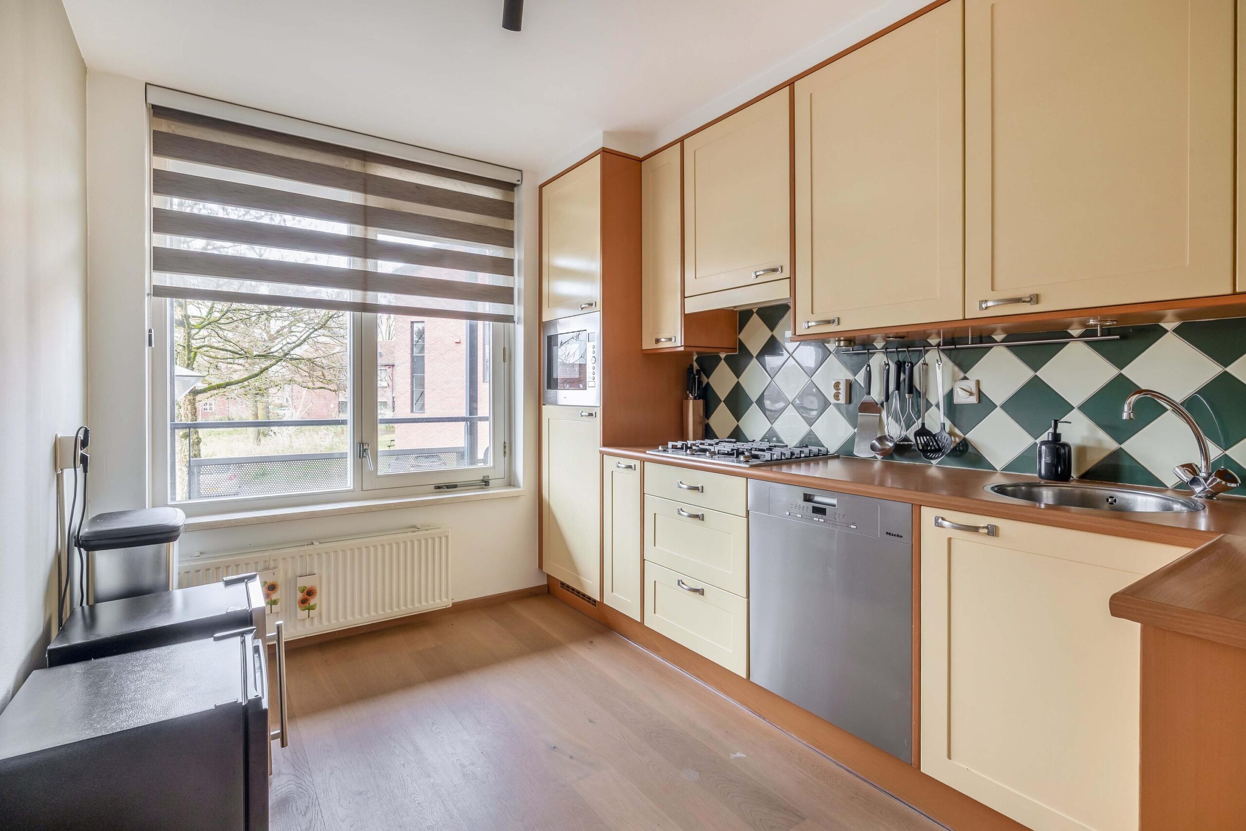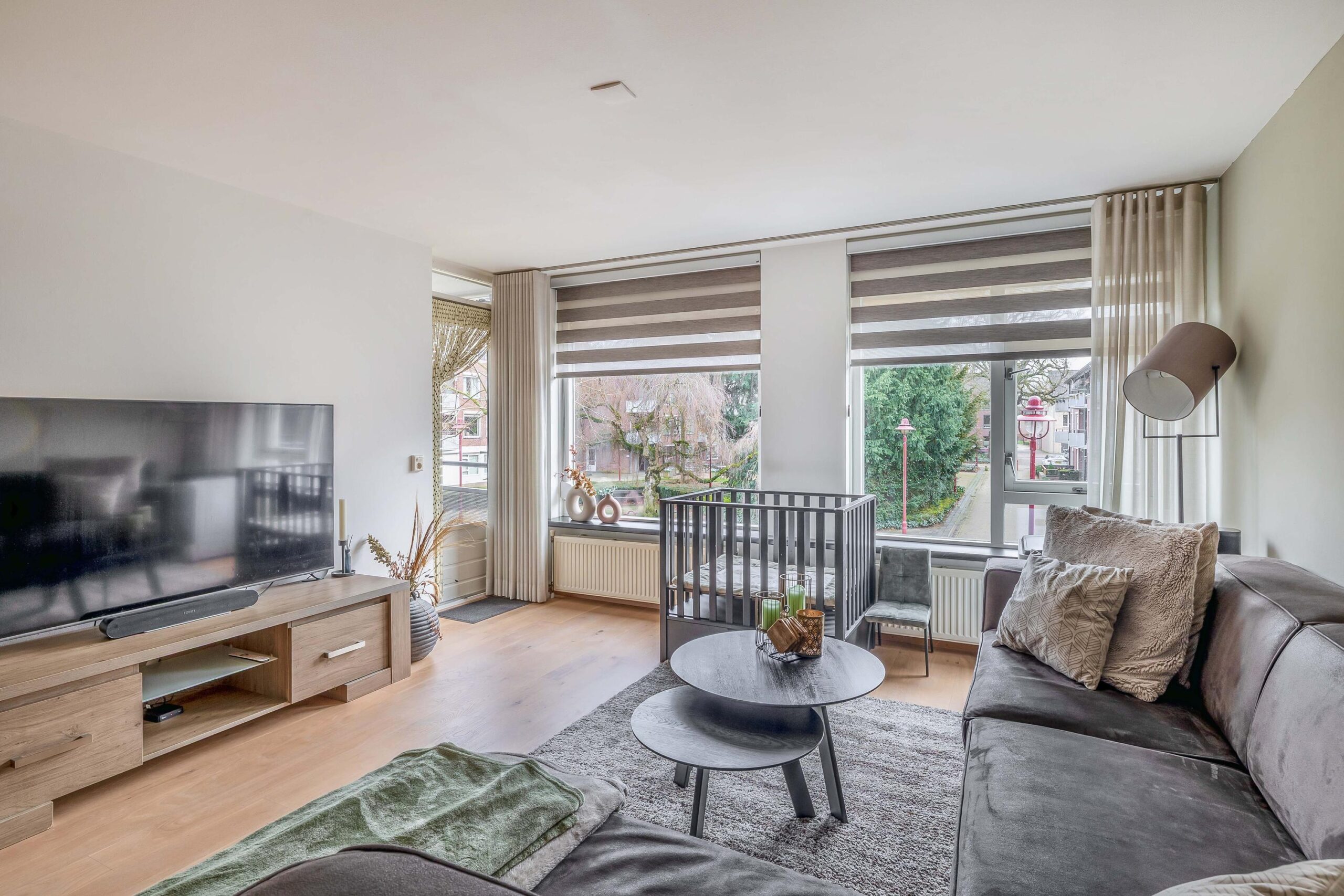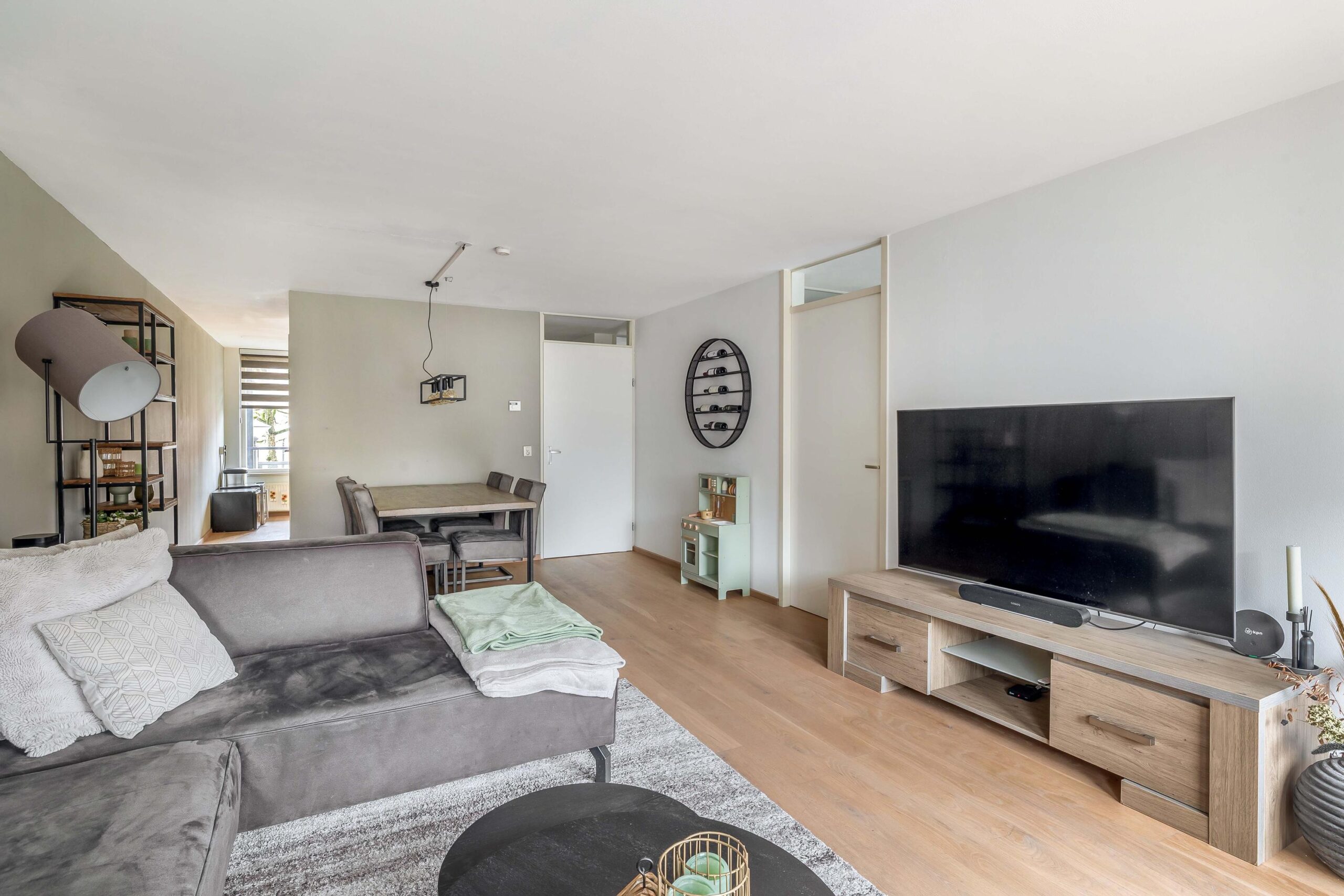 Het appartement ligt op korte afstand van de entree en het trappenhuis van het complex. Bij binnenkomst komt u in een ruime hal met een meterkast en toegang tot de woonkamer, slaapkamers en sanitaire voorzieningen. De woonkamer is ruim opgezet en heeft een oppervlakte van bijna 30 m². De ruimte is voorzien van een nette lamelparketvloer en licht afgewerkte wanden. Dankzij de grote raampartijen aan de voorzijde is er veel natuurlijke lichtinval en heeft u een vrij uitzicht over het voetgangersgebied richting de Hoofdstraat. Vanuit de woonkamer heeft u direct toegang tot het balkon. Het balkon biedt veel privacy en is voorzien van een markies als zonwering, wat bij de zonnige ligging zeer prettig is. De keuken staat in halfopen verbinding met de woonkamer. Tussen de woonkamer en keuken bevindt zich een praktische provisieruimte/bergkast waar tevens de wasmachine geplaatst kan worden. Hier zijn ook de combiketel en de afzuigunit gesitueerd. De keuken heeft een nette L-opstelling en is voorzien van diverse inbouwapparatuur, waaronder een Miele vaatwasser, gaskookplaat, koelkast en magnetron. In de keuken is bovendien ruimte voor een kleine eettafel. Het appartement beschikt over twee slaapkamers. De grootste slaapkamer is rechtstreeks vanuit de woonkamer bereikbaar en heeft tevens directe toegang tot de badkamer. De tweede slaapkamer is ideaal te gebruiken als logeer-, werk- of hobbykamer en beschikt over een opvallend hoekraam. Ook in beide slaapkamers ligt dezelfde vloer als in de woonkamer. De badkamer is ruim opgezet en voorzien van een royale inloopdouche met glaswand en een wastafel met meubel. De badkamer is zowel vanuit de hal als vanuit de hoofdslaapkamer bereikbaar. Daarnaast beschikt het appartement over een separate toiletruimte met wandcloset en fonteintje.