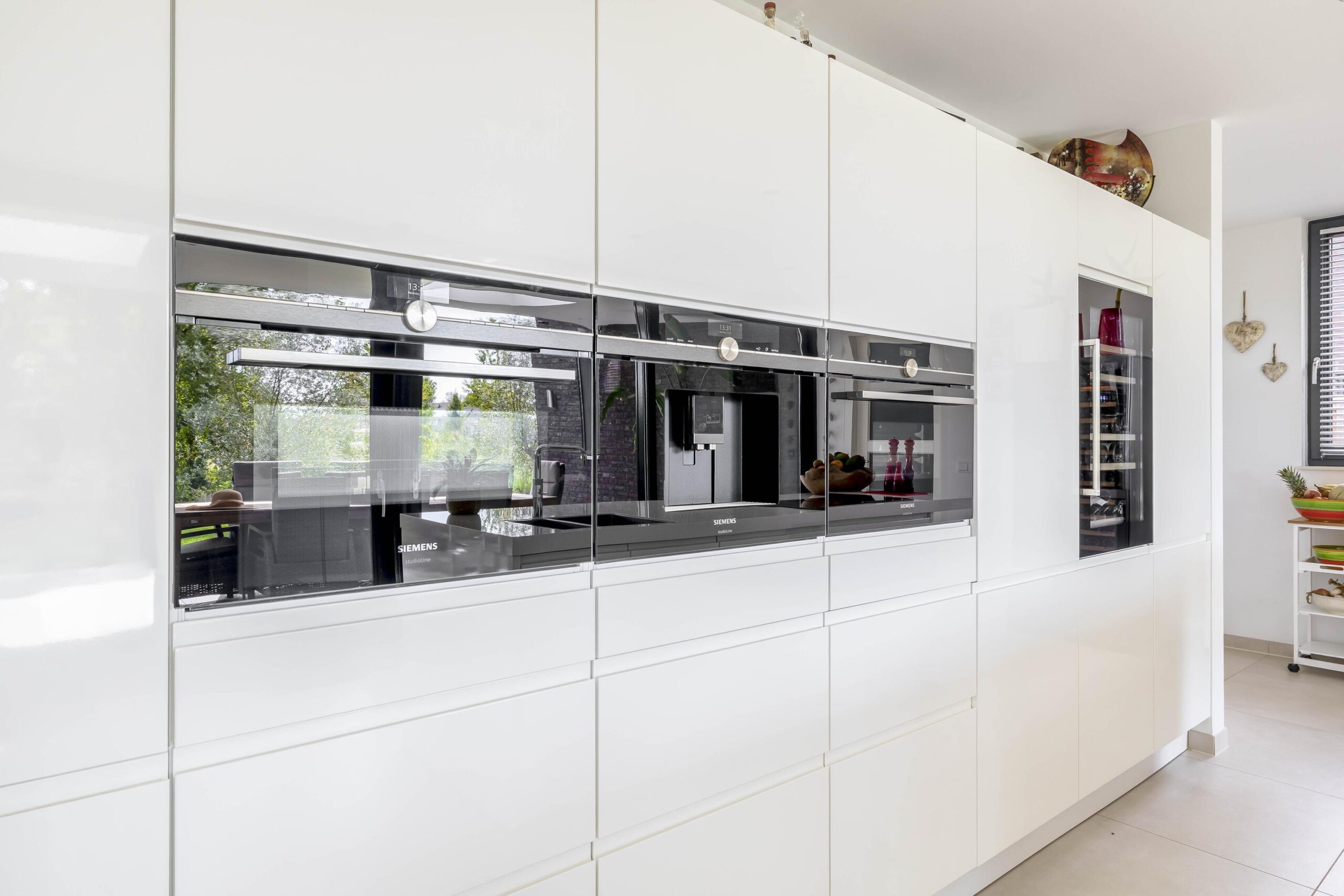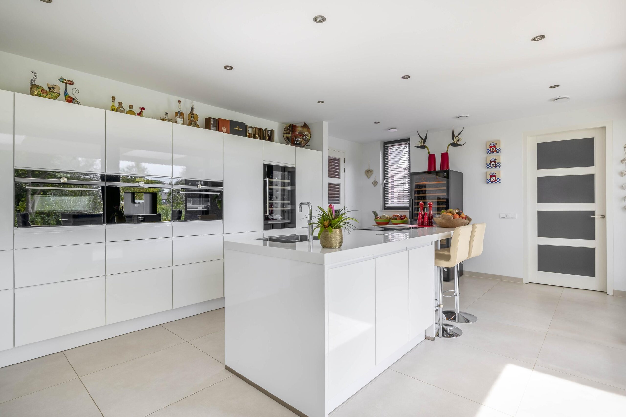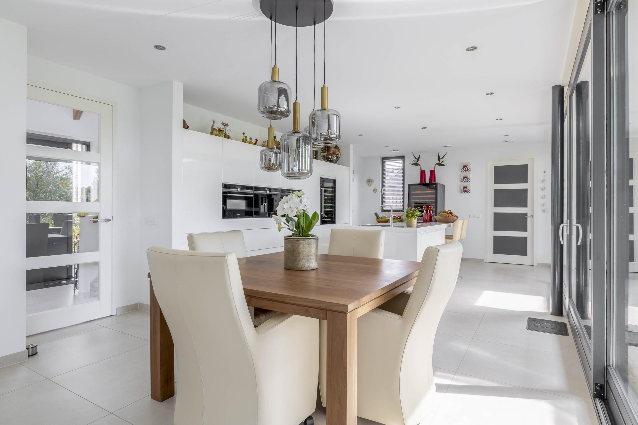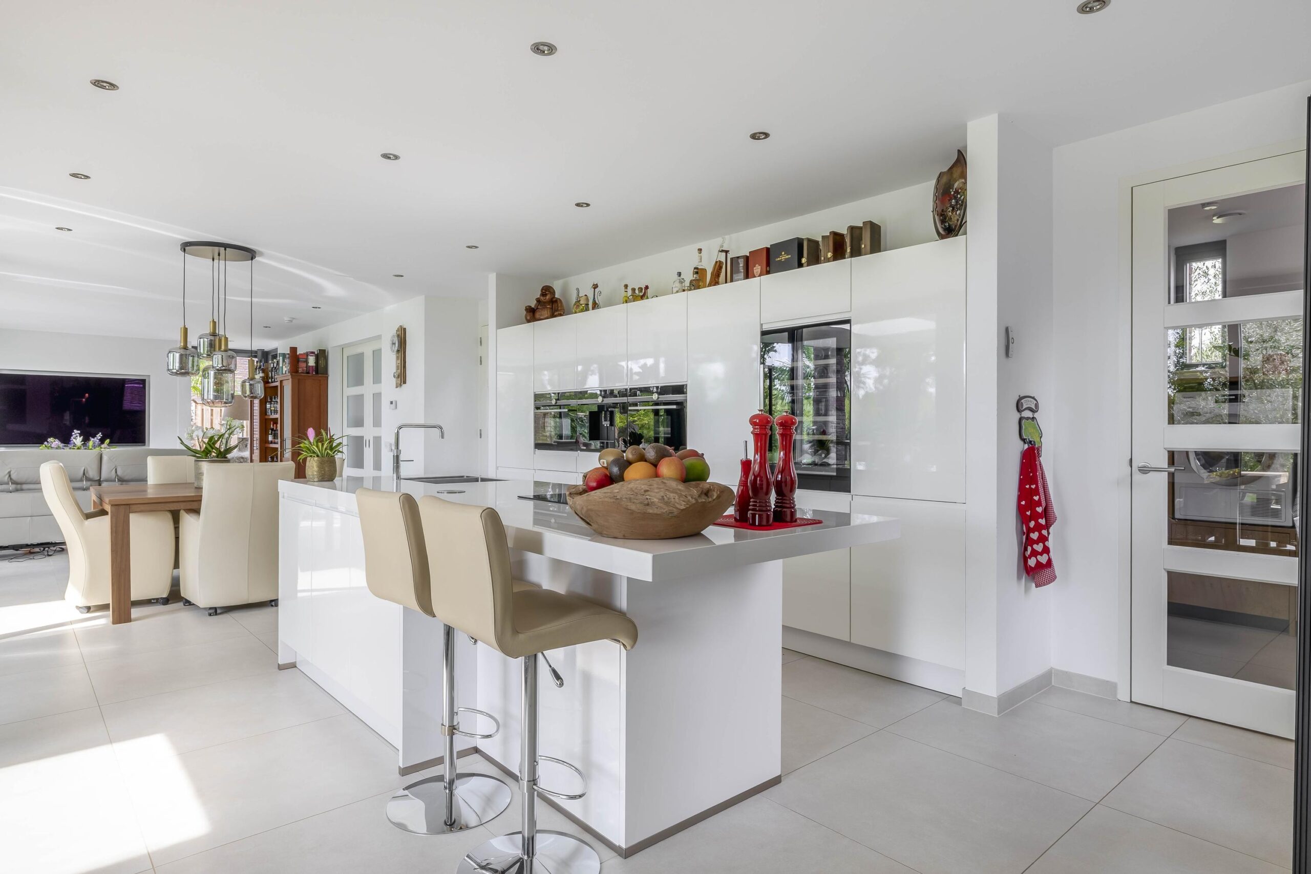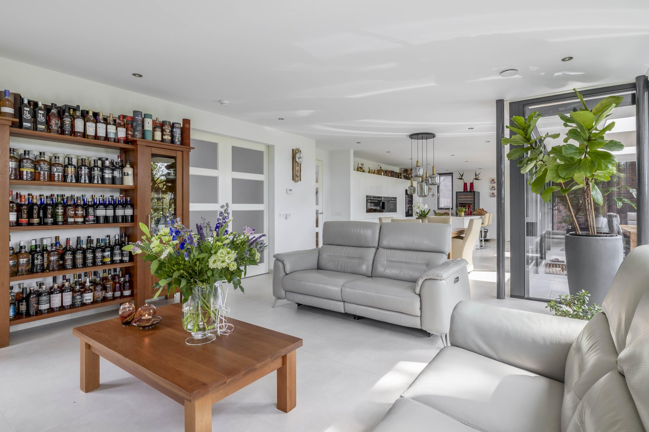 Begane grond: De entree van de woning biedt toegang tot een ruime en lichte hal met een stijlvolle tegelvloer en strak gestucte wanden en plafond. Hier bevindt zich de trapopgang naar de verdieping en de moderne toiletruimte met inbouwcloset en fonteintje. Vanuit de hal heeft u toegang tot de woonkamer en keuken. De woonkamer is stijlvol afgewerkt met strak stucwerk, een grote tegelvloer met vloerverwarming en een schuifpui naar de tuin. En-suite deuren verbinden de woonkamer met een multifunctionele kamer, ideaal als speelkamer, eetkamer of thuiswerkplek. Dankzij een eigen ingang is deze ruimte ook perfect geschikt als salon of kantoor aan huis. De open woonkeuken is luxe uitgevoerd met een modern keukenmeubel en royaal kookeiland. De keuken is voorzien van volop werk- en bergruimte en hoogwaardige inbouwapparatuur, waaronder een inductiekookplaat met geïntegreerde afzuiging, Quooker, combi-oven, stoomoven, koelkast, vriezer, vaatwasser, koffiezetapparaat en een wijnklimaatkast. De gehele achtergevel van de woning is van glas wat zorgt voor veel licht en een prachtig uitzicht op de tuin en de omliggende landerijen. De bijkeuken biedt extra gemak met een compleet keukenblok, wasmachine- en drogeraansluiting, een vaste kast met de pomp voor de vloerverwarming en een waterontharder. Verder bevindt zich op de begane grond van de woning een royale slaapkamer met grote ingebouwde kastruimtes en een eigen badkamer en-suite, voorzien van een heerlijk ligbad, ruime inloopdouche, dubbele wastafel met meubel en vloerverwarming.