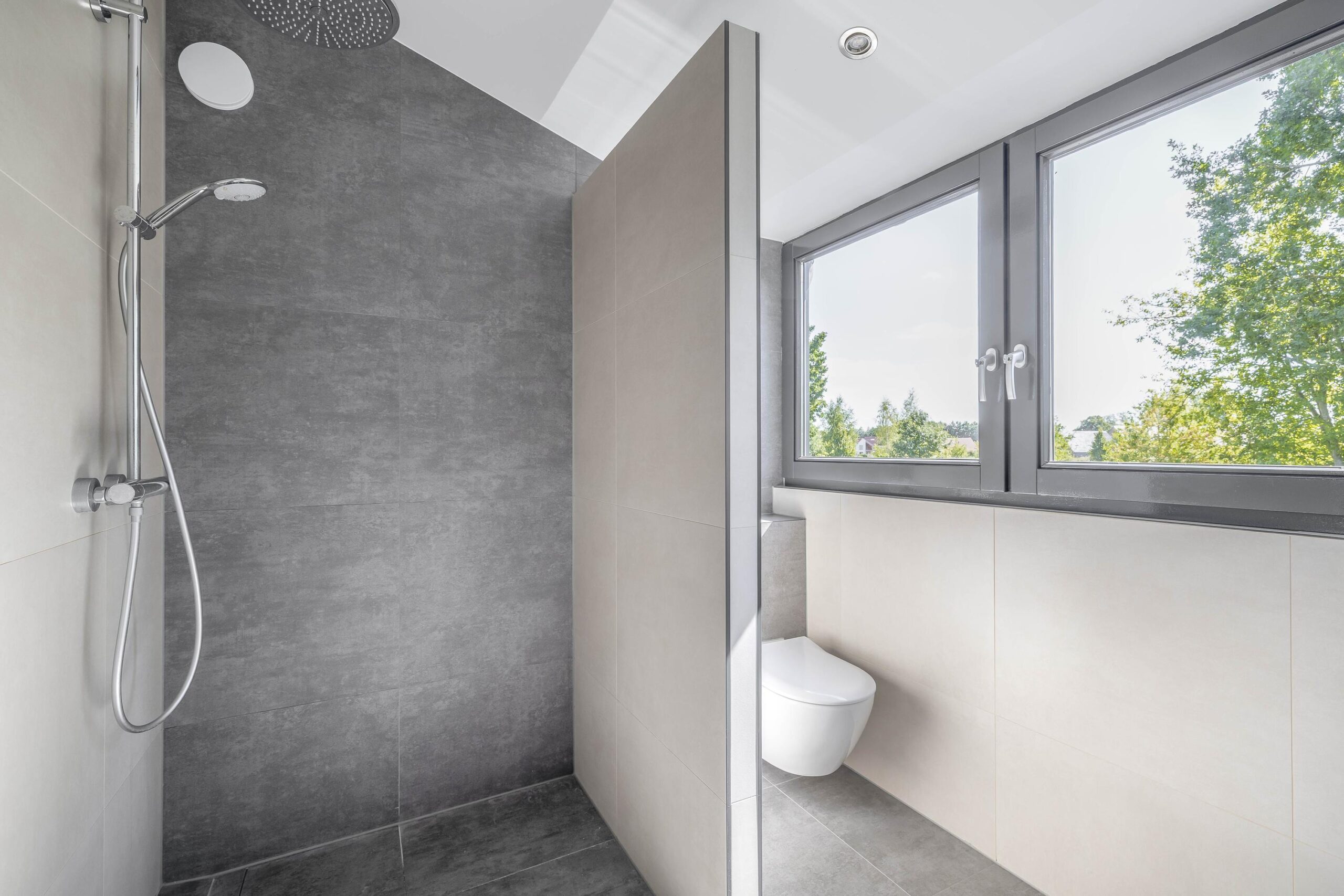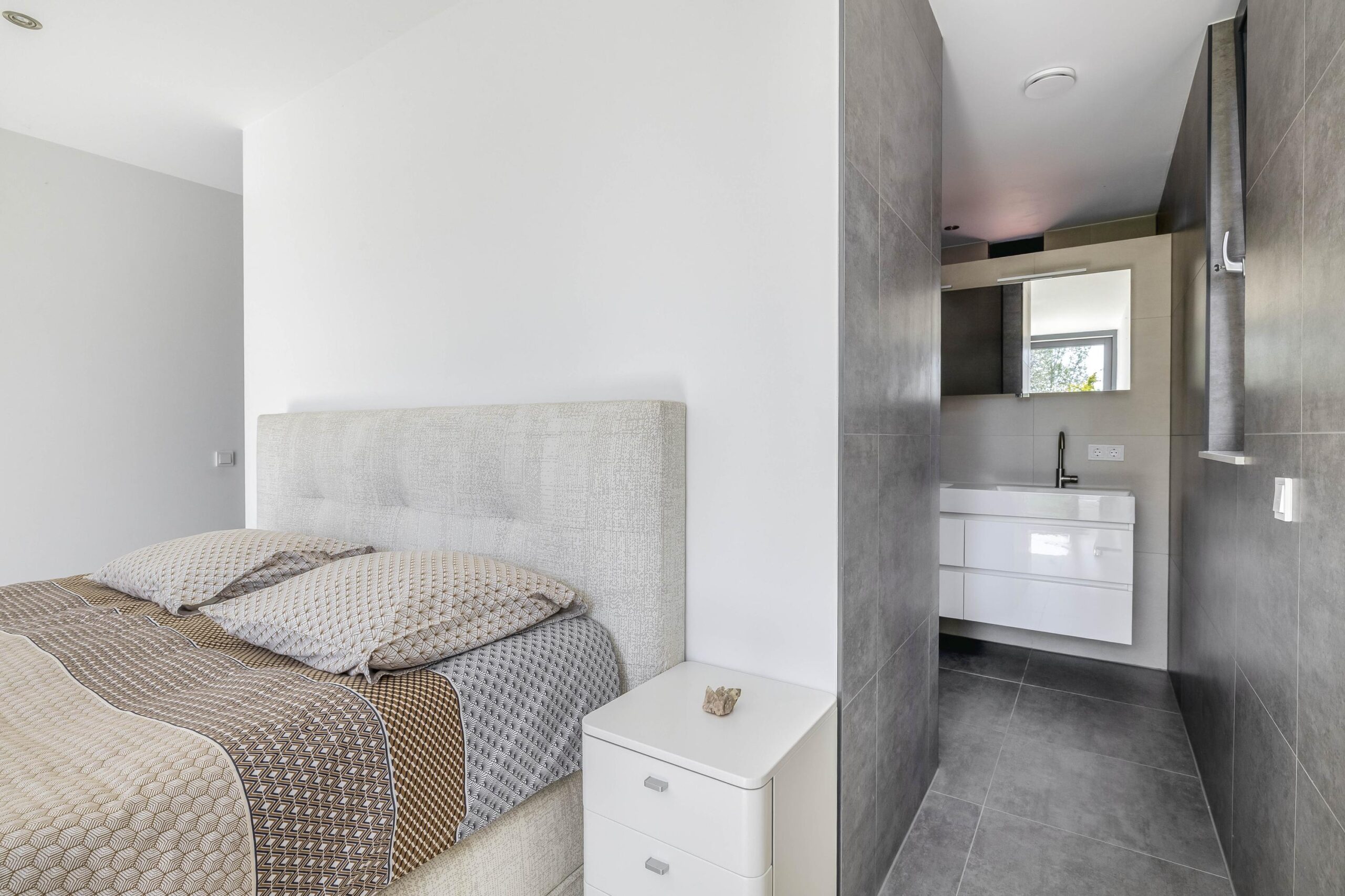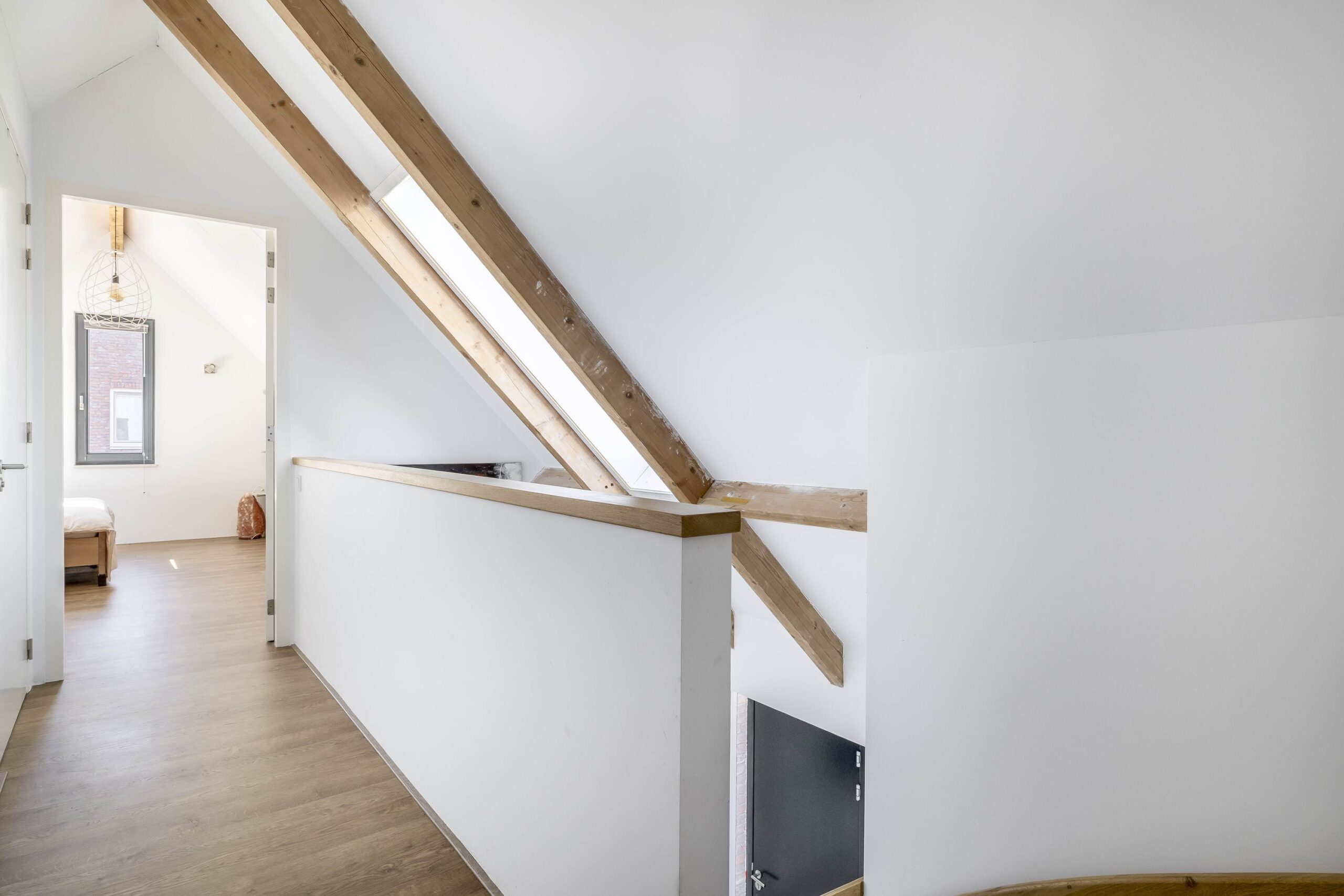 Verdieping: De overloop geeft toegang tot twee ruime en lichte slaapkamers, een tweede luxe badkamer en de technische ruimte. De slaapkamers zijn afgewerkt met strak stucwerk, een mooie laminaatvloer en vloerverwarming. De tweede badkamer is uitgerust met een inloopdouche, inbouwcloset, dubbele wastafel met meubel en vloerverwarming. In de technische ruimte bevinden zich de warmtepomp, boiler, omvormer voor de zonnepanelen en de warmte-terug-win installatie (WTW).