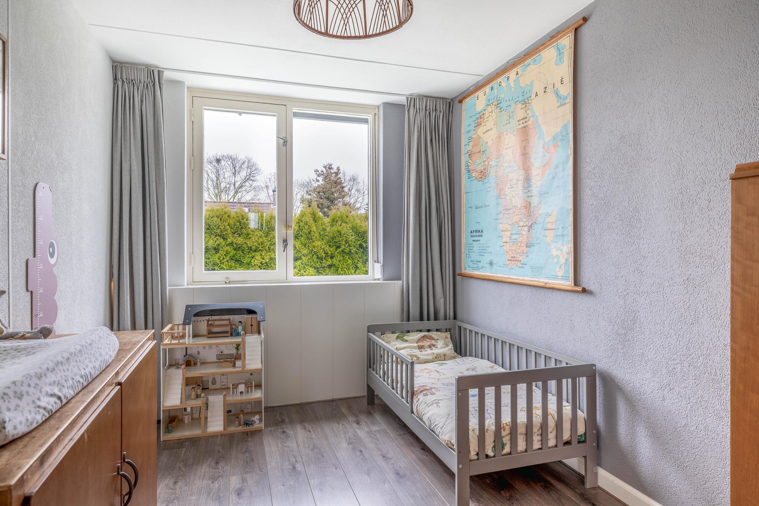 Begane grond: In de hal bevinden zich de meterkast, de trapopgang naar de eerste verdieping en de toiletruimte. De woonkamer beschikt aan zowel de voor- als achterzijde over grote raampartijen, wat zorgt voor veel lichtinval. De woonkamer is netjes afgewerkt met gestucte wanden en plafonds en een pvc-vloer. Via een tuindeur heeft u toegang tot de achtertuin. Daarnaast bevindt zich in de woonkamer een vaste kast, ideaal voor het opbergen van proviand. De moderne open woonkeuken (2024) is voorzien van een in hoekopstelling geplaatst keukenmeubel met donkere boven- en onderkasten, een licht werkblad en diverse inbouwapparatuur, waaronder een gaskookplaat, afzuigkap, koelkast, vriezer, combi-oven en vaatwasser.