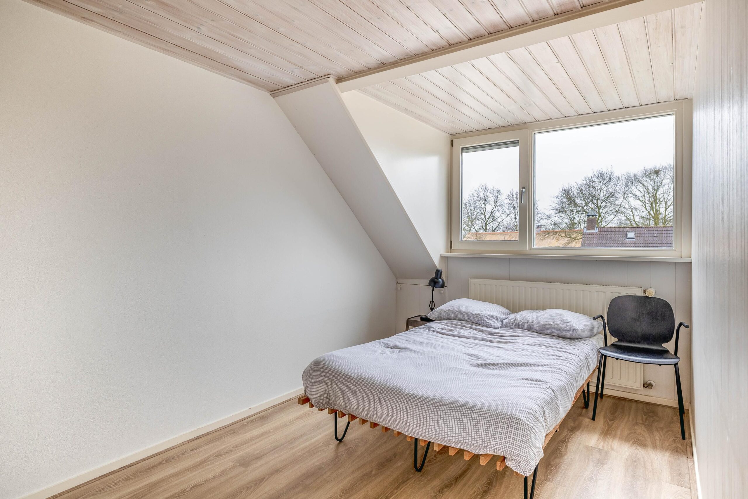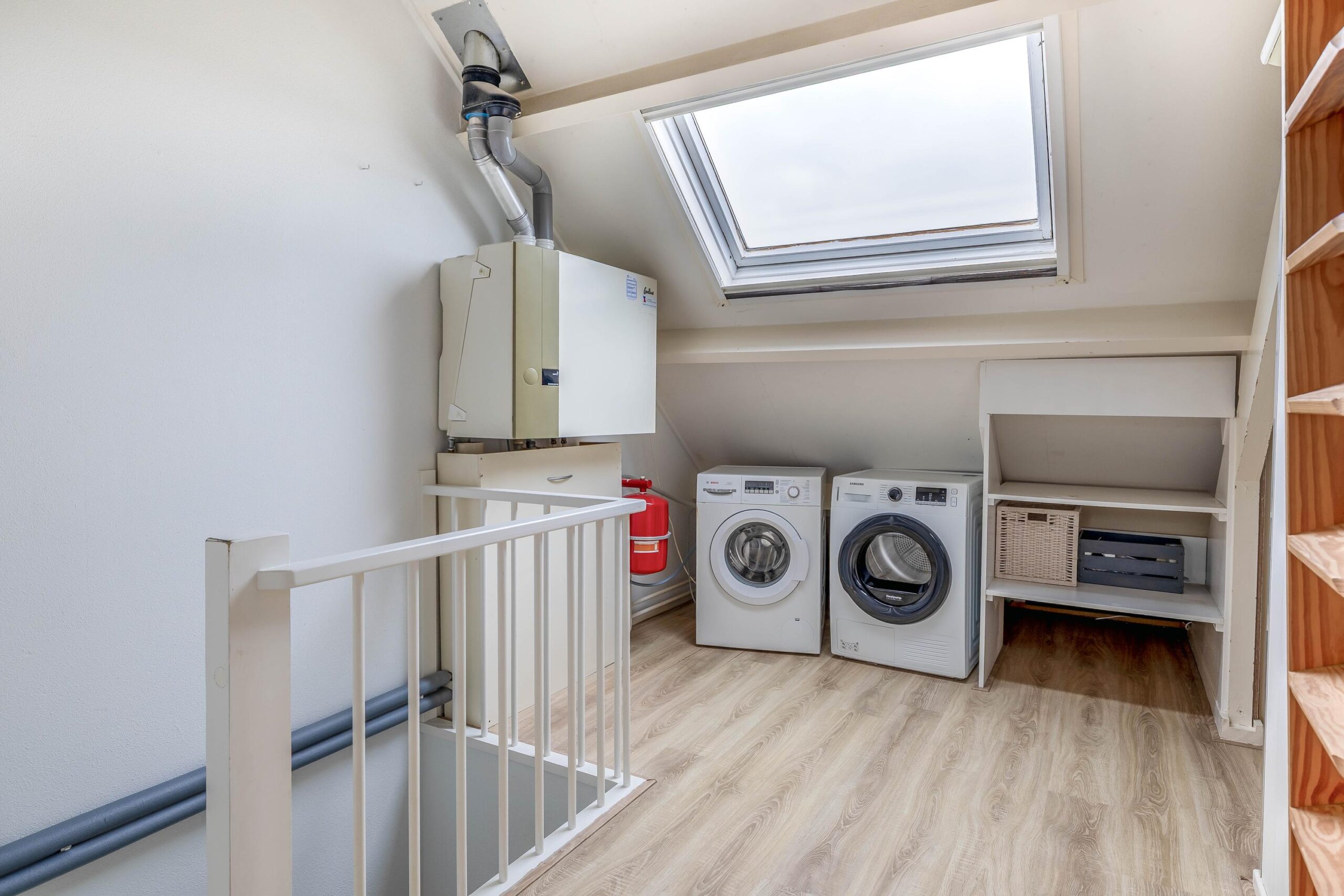 Tweede verdieping: Via een vaste trap bereikt u de tweede verdieping. Op de voorzolder bevinden zich de cv-installatie en de aansluitingen voor de wasmachine en droger. Door het plaatsen van een dakkapel zijn hier twee ruime slaapkamers gerealiseerd. Vanuit de voorzolder is tevens de vliering bereikbaar, die veel bergruimte biedt.
