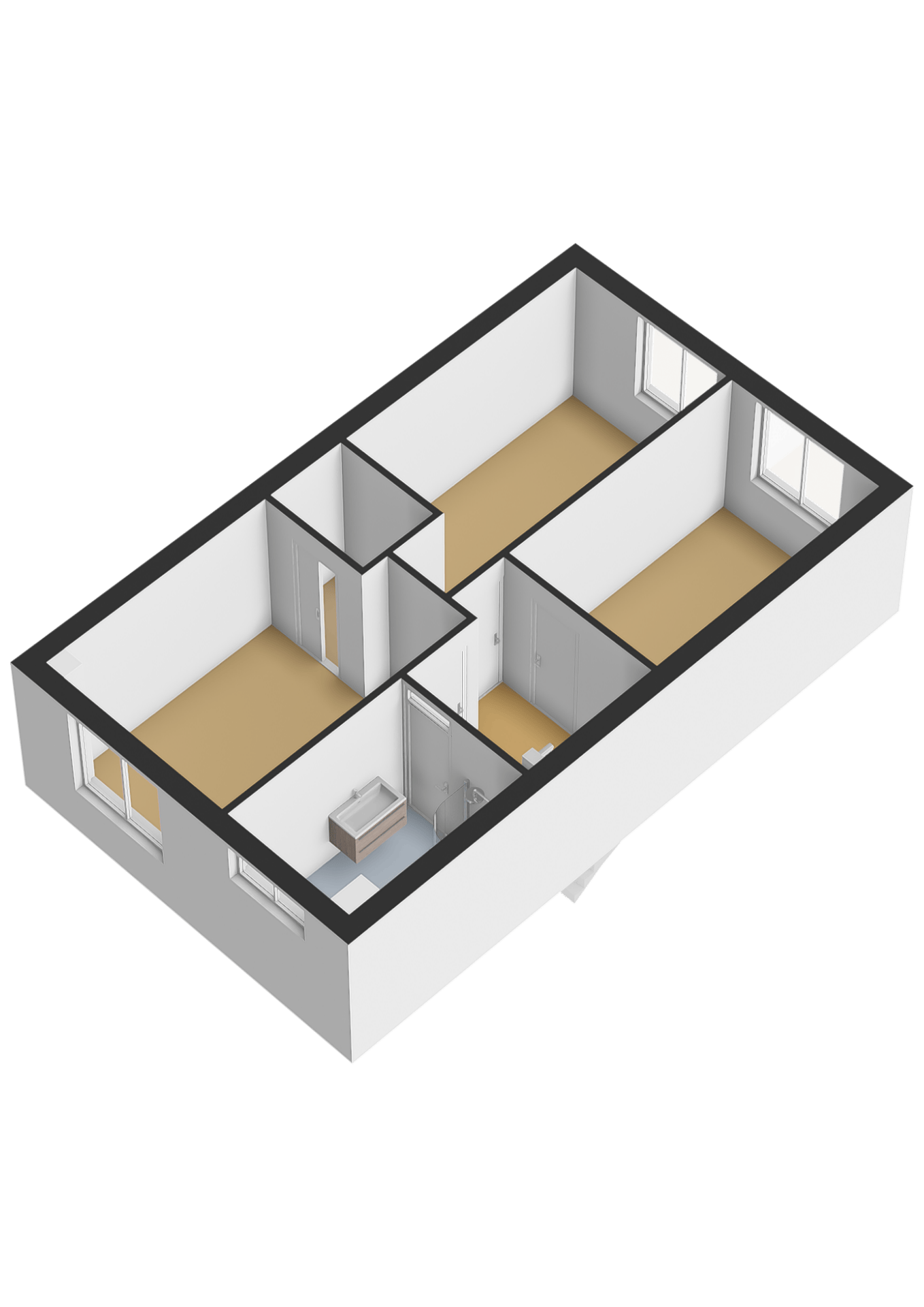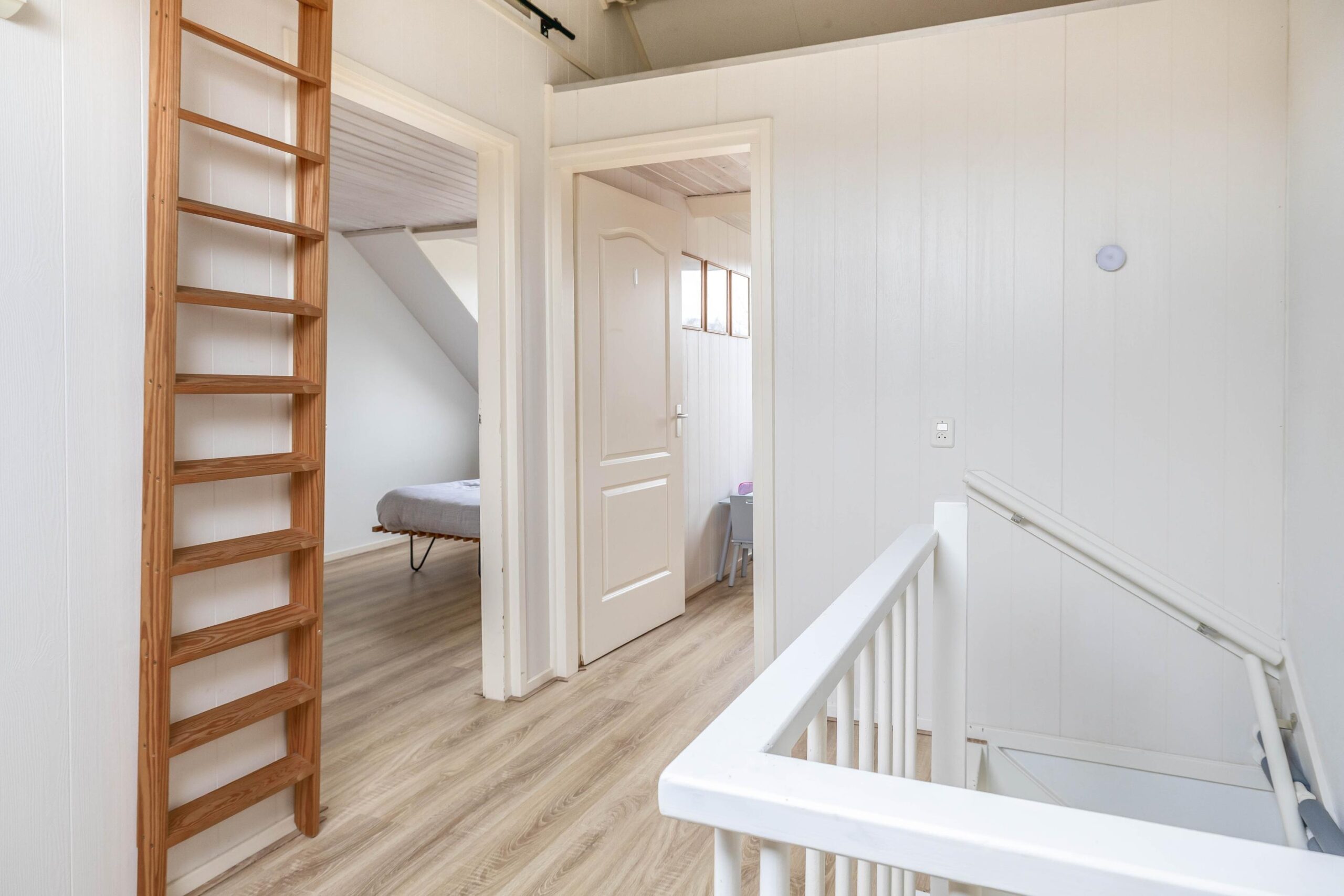Eerste verdieping: De overloop biedt toegang tot drie slaapkamers en de badkamer. De badkamer is volledig betegeld en uitgerust met een badkamermeubel met wastafel, een toilet, een douche en een ligbad. Alle slaapkamers zijn voorzien van een laminaatvloer, houten kozijnen en dubbele beglazing. Eén van de slaapkamers beschikt over een vast bed en de hoofdslaapkamer heeft een eigen inloopkast.