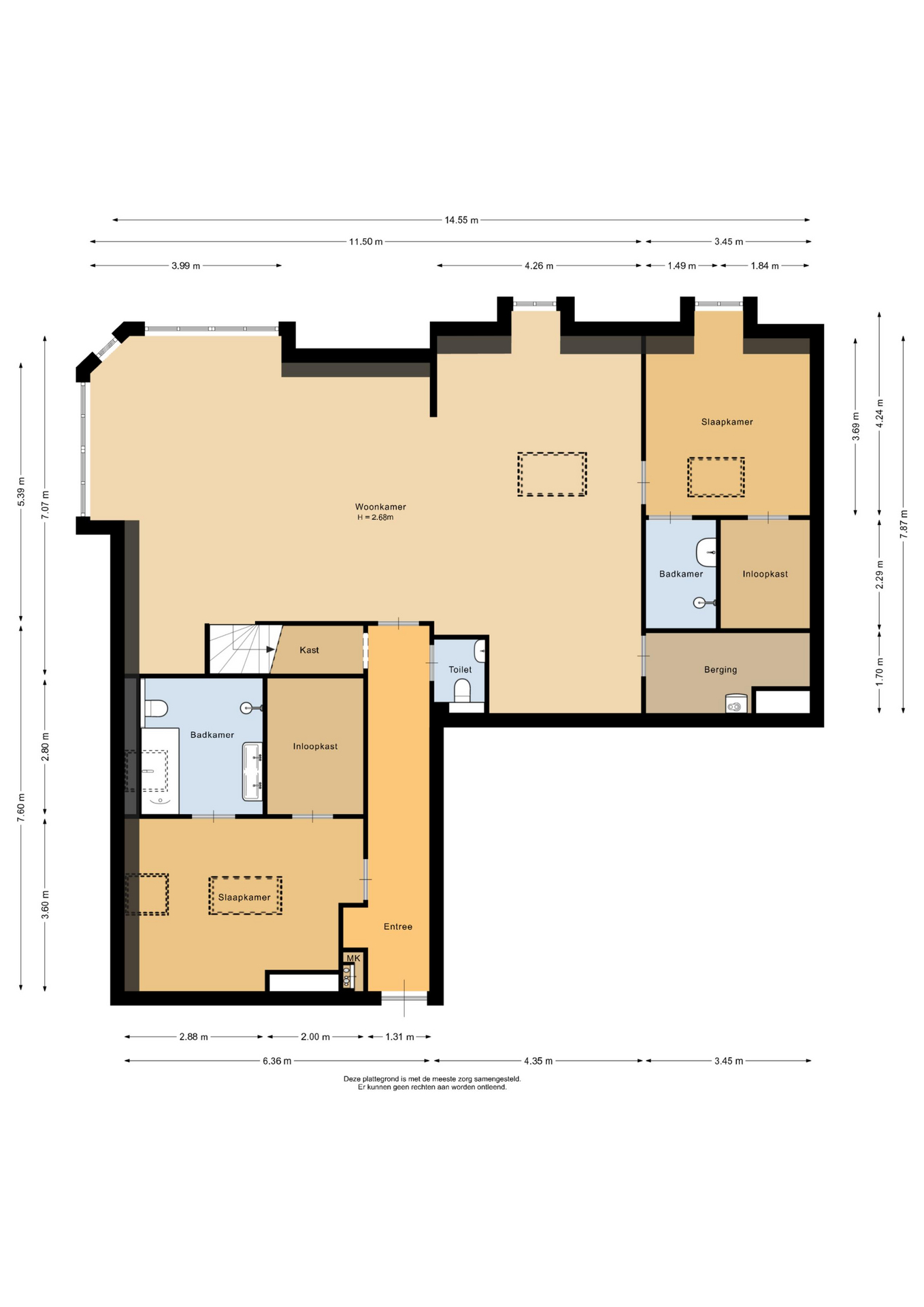 Via de voordeur komt u binnen in de hal vanwaar u toegang heeft tot de woonkamer met open keuken, de twee slaapkamers met ieder een eigen afgewerkte badkamer waarvan de één met dubbele wastafel, ligbad, toilet en inloopdouche en de andere met wastafel en inloopdouche. Op de overloop is ook nog een afgewerkte separate toiletruimte. De woonkamer met keukengedeelte is licht en ruim van opzet. De woonkamer is fraai vormgegeven waardoor u onder andere een fraai uitzicht heeft op de Sint-Lambertuskerk. De living is royaal en biedt meer dan ruimte genoeg voor een fijne zithoek en een grote eettafel. Via een trap heeft u toegang tot het dakterras vanwaar u fraai uitzicht heeft over het centrum van Veghel.