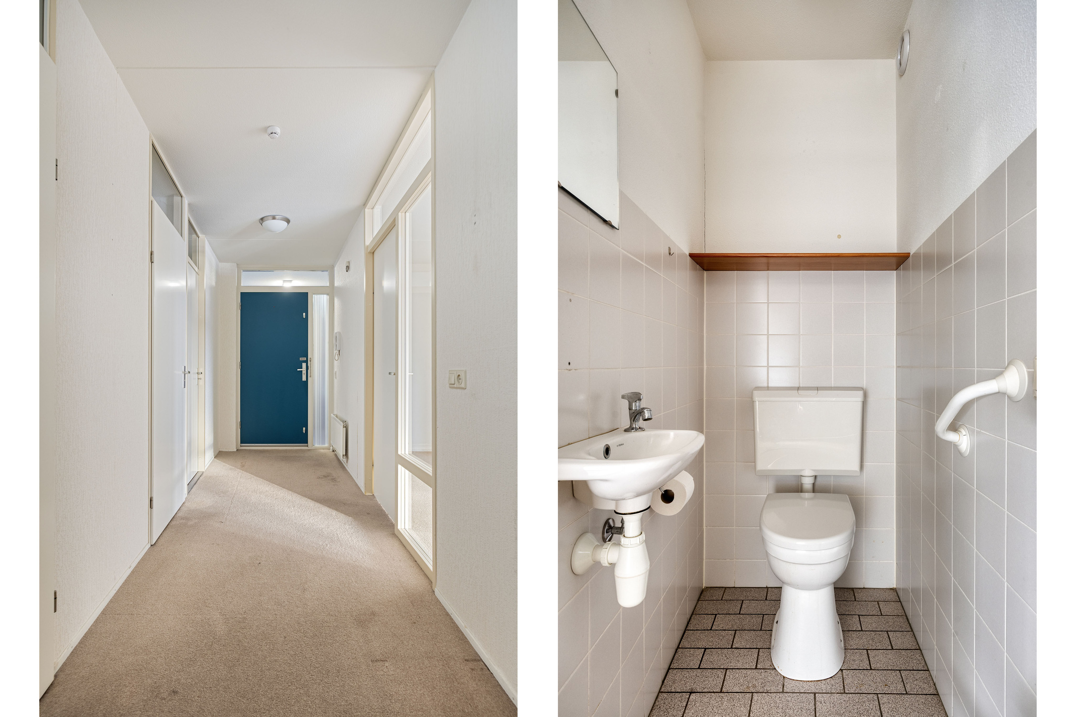 Via de nette, overdekte galerij bereikt u de voordeur van het appartement. De ruime hal fungeert als centrale toegang tot de verschillende vertrekken. De woonkamer is gelegen aan de achterzijde van het appartement en beschikt over grote ramen die zorgen voor veel natuurlijk licht. Hier heeft u tevens toegang tot het eerste balkon, dat uitzicht biedt op het levendige Stadhuisplein. Vanuit de woonkamer bereikt u de halfopen keuken met keukenmeubel voorzien van inbouwapparatuur. In de berging bevindt zich de aansluitingen voor uw was apparatuur en de opstelling van de c.v.-ketel en de mechanische ventilatie. De twee slaapkamers zijn beide ruim, waarbij er vanuit één slaapkamer toegang is tot een tweede balkon! De badkamer is volledig betegeld en beschikt over zowel een ligbad als een aparte douche, een wastafel en mechanische ventilatie. Het separate toilet in de hal is voorzien van een fonteintje.