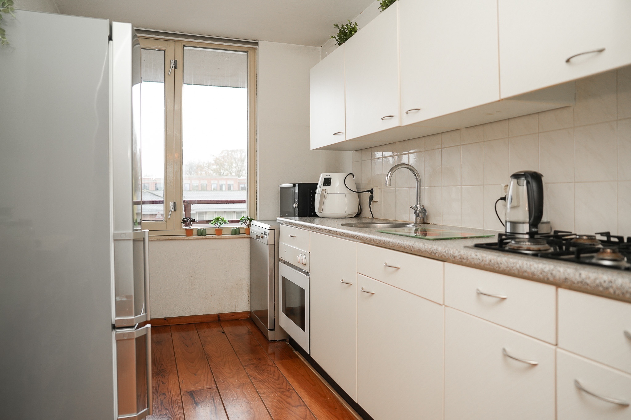 Via lift of trap bereikt u de derde verdieping en de galerij waaraan het appartement is gelegen. U komt binnen in de ruime hal met toegang tot de inpandige berging, één van de slaapkamers, de badkamer en de woonkamer. De inpandige berging is praktisch ingedeeld en voorzien van de cv-combiketel en de unit voor mechanische ventilatie. De woonkamer is dankzij de grote raampartijen heerlijk licht en strak afgewerkt. De massief houten vloer zorgt voor een warme uitstraling. Vanuit de woonkamer bereikt u het balkon (ca. 5 m²) met uitzicht over de Stationsstraat. De open keuken is ingericht met boven- en onderkasten, een gaskookplaat, afzuigkap, oven, spoelbak en een losstaande vaatwasser. Het appartement beschikt over twee slaapkamers, beide voorzien van dezelfde massief houten vloer. Eén van de slaapkamers is uitgerust met een ruime vaste schuifkastenwand. De badkamer is netjes en compleet uitgevoerd. De badkamer is voorzien van witte wandtegels en een grijze vloertegel en beschikt over een douche, toilet, wastafelmeubel, designradiator, mechanische ventilatie en de aansluiting voor de wasmachine.
