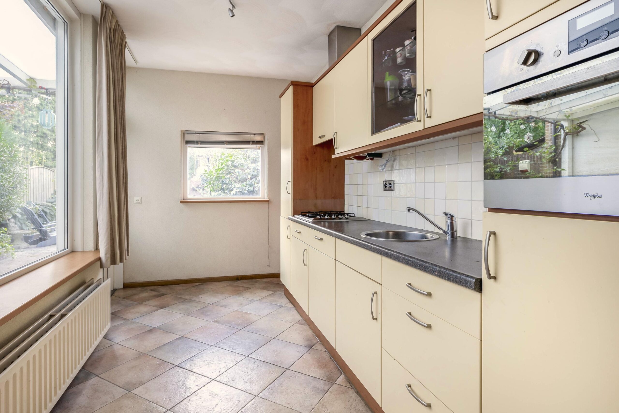 Begane grond: Bij binnenkomst in de hal vind je de vernieuwde meterkast, trapopgang naar de verdieping en de toiletruimte (2025) met inbouwcloset en fonteintje. Vanuit de hal loop je door naar de woonkamer met half open keuken. De woonkamer is afgewerkt met stucwerk wanden en plafond en een mooie houten vloer. Dankzij de grote ramen aan de voor- en achterzijde is de woonkamer heerlijk licht. De woning is aan de achterzijde uitgebouwd waardoor er veel leefruimte is ontstaan. De half open keuken bevindt zich aan de achterzijde en is voorzien van een recht keukenmeubel met boven- en onderkasten, lades, spoelbak, combi-oven, koelkast, gaskookstel, afzuigkap en een vaatwasser. Vanuit de keuken is er een leuk uitzicht op de tuin, die middels een loopdeur bereikbaar is.