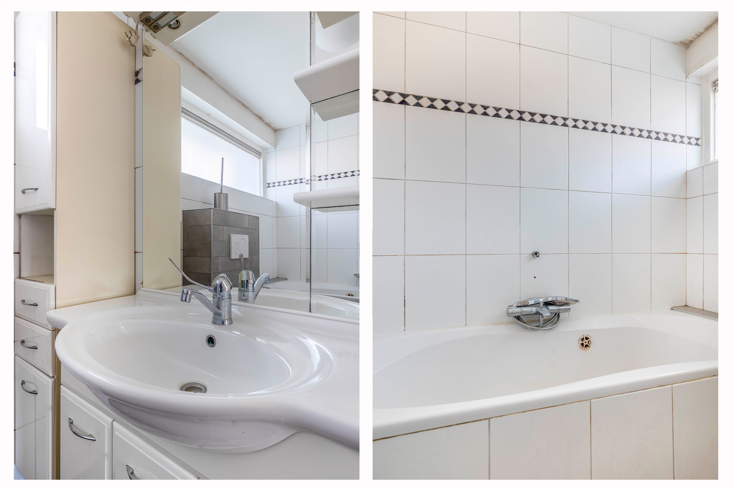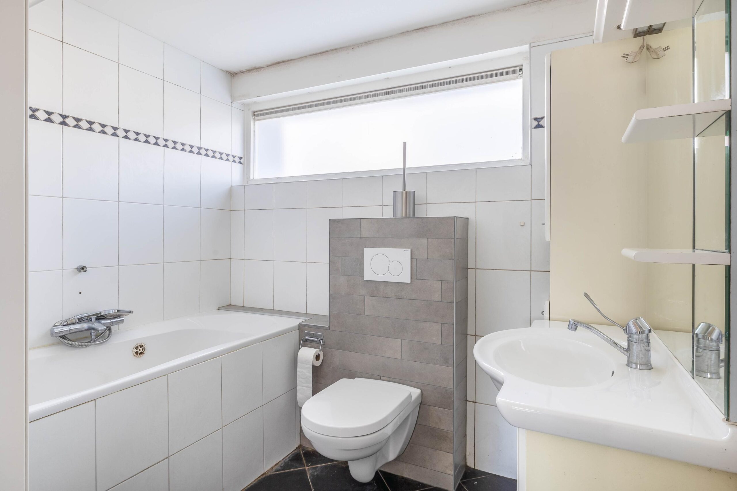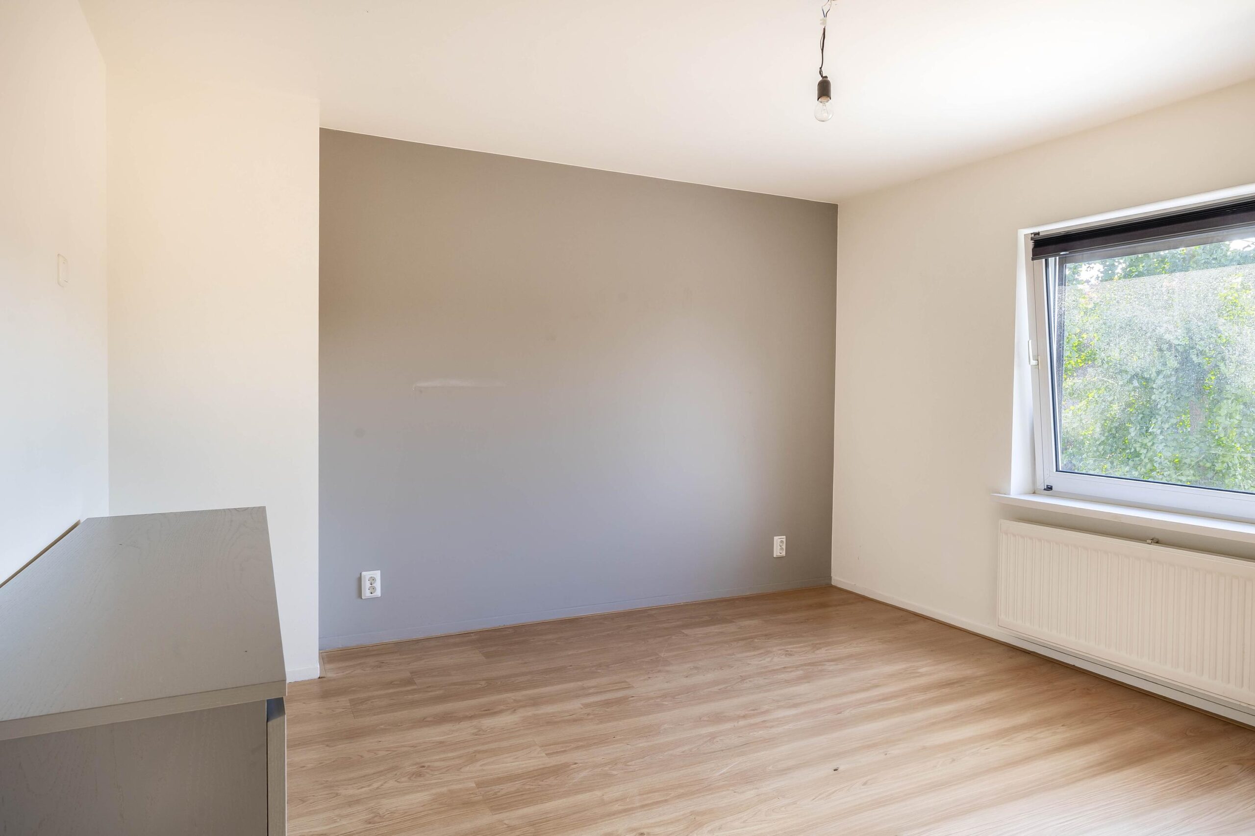 Eerste verdieping: Op de eerste verdieping vind je drie slaapkamers en een nette badkamer. De badkamer is volledig betegeld en voorzien van een ligbad, toilet, wastafel in meubel en mechanische ventilatie. De slaapkamers zijn allen afgewerkt met stucwerk wanden en plafonds en laminaatvloer. Eén slaapkamer beschikt over een vaste kast.